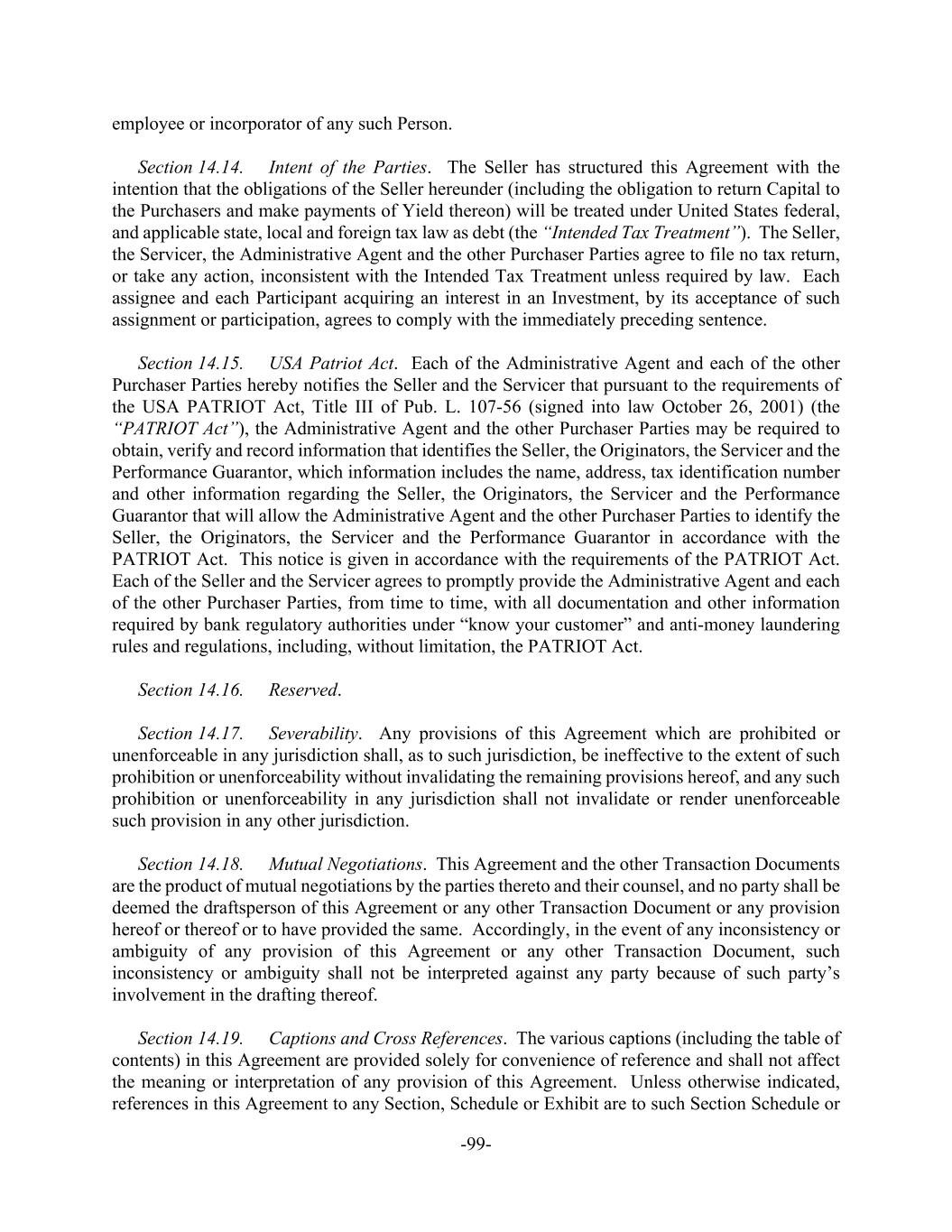 -99- employee or incorporator of any such Person. Section 14.14. Intent of the Parties. The Seller has structured this Agreement with the intention that the obligations of the Seller hereunder (including the obligation to return Capital to the Purchasers and make payments of Yield thereon) will be treated under United States federal, and applicable state, local and foreign tax law as debt (the “Intended Tax Treatment”). The Seller, the Servicer, the Administrative Agent and the other Purchaser Parties agree to file no tax return, or take any action, inconsistent with the Intended Tax Treatment unless required by law. Each assignee and each Participant acquiring an interest in an Investment, by its acceptance of such assignment or participation, agrees to comply with the immediately preceding sentence. Section 14.15. USA Patriot Act. Each of the Administrative Agent and each of the other Purchaser Parties hereby notifies the Seller and the Servicer that pursuant to the requirements of the USA PATRIOT Act, Title III of Pub. L. 107-56 (signed into law October 26, 2001) (the “PATRIOT Act”), the Administrative Agent and the other Purchaser Parties may be required to obtain, verify and record information that identifies the Seller, the Originators, the Servicer and the Performance Guarantor, which information includes the name, address, tax identification number and other information regarding the Seller, the Originators, the Servicer and the Performance Guarantor that will allow the Administrative Agent and the other Purchaser Parties to identify the Seller, the Originators, the Servicer and the Performance Guarantor in accordance with the PATRIOT Act. This notice is given in accordance with the requirements of the PATRIOT Act. Each of the Seller and the Servicer agrees to promptly provide the Administrative Agent and each of the other Purchaser Parties, from time to time, with all documentation and other information required by bank regulatory authorities under “know your customer” and anti-money laundering rules and regulations, including, without limitation, the PATRIOT Act. Section 14.16. Reserved. Section 14.17. Severability. Any provisions of this Agreement which are prohibited or unenforceable in any jurisdiction shall, as to such jurisdiction, be ineffective to the extent of such prohibition or unenforceability without invalidating the remaining provisions hereof, and any such prohibition or unenforceability in any jurisdiction shall not invalidate or render unenforceable such provision in any other jurisdiction. Section 14.18. Mutual Negotiations. This Agreement and the other Transaction Documents are the product of mutual negotiations by the parties thereto and their counsel, and no party shall be deemed the draftsperson of this Agreement or any other Transaction Document or any provision hereof or thereof or to have provided the same. Accordingly, in the event of any inconsistency or ambiguity of any provision of this Agreement or any other Transaction Document, such inconsistency or ambiguity shall not be interpreted against any party because of such party’s involvement in the drafting thereof. Section 14.19. Captions and Cross References. The various captions (including the table of contents) in this Agreement are provided solely for convenience of reference and shall not affect the meaning or interpretation of any provision of this Agreement. Unless otherwise indicated, references in this Agreement to any Section, Schedule or Exhibit are to such Section Schedule or