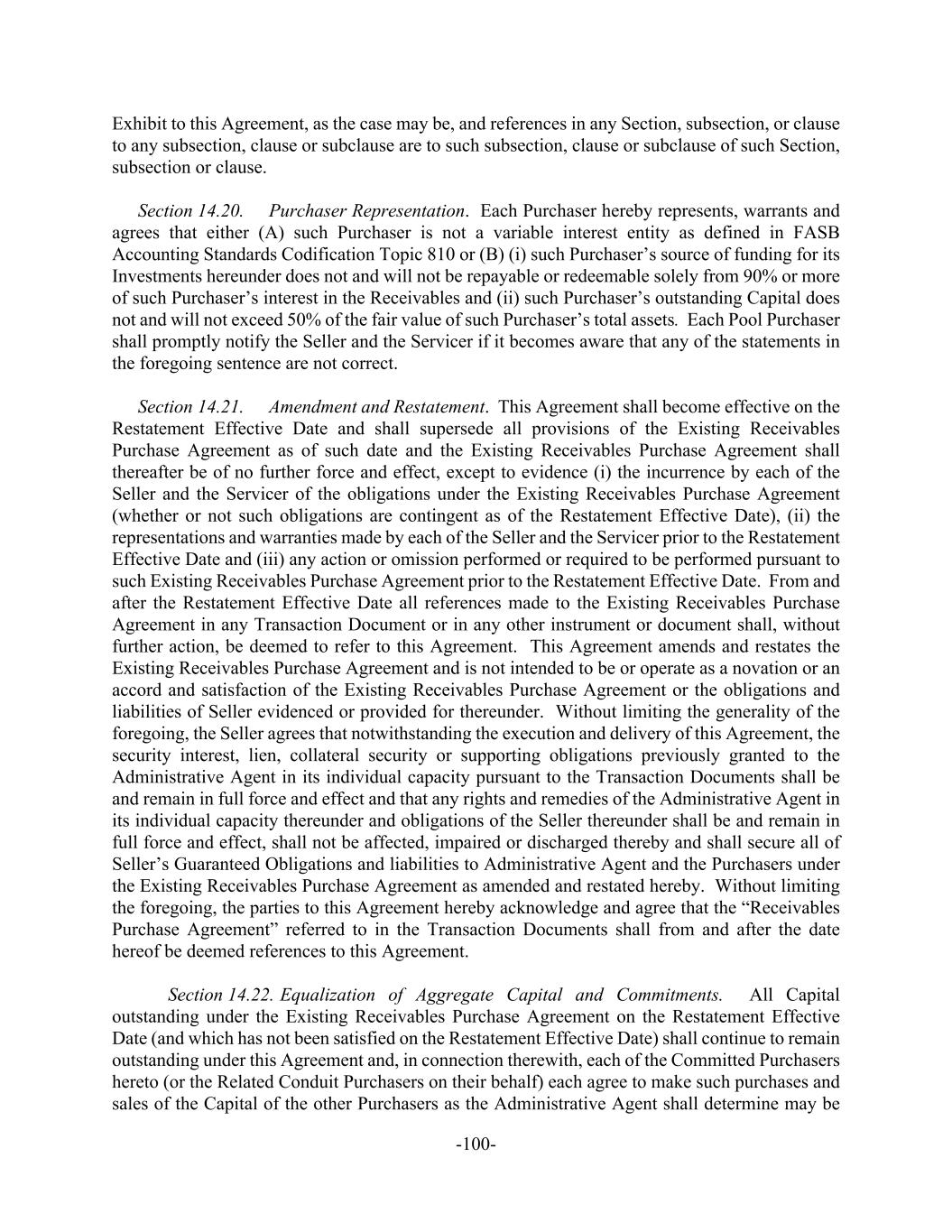 -100- Exhibit to this Agreement, as the case may be, and references in any Section, subsection, or clause to any subsection, clause or subclause are to such subsection, clause or subclause of such Section, subsection or clause. Section 14.20. Purchaser Representation. Each Purchaser hereby represents, warrants and agrees that either (A) such Purchaser is not a variable interest entity as defined in FASB Accounting Standards Codification Topic 810 or (B) (i) such Purchaser’s source of funding for its Investments hereunder does not and will not be repayable or redeemable solely from 90% or more of such Purchaser’s interest in the Receivables and (ii) such Purchaser’s outstanding Capital does not and will not exceed 50% of the fair value of such Purchaser’s total assets. Each Pool Purchaser shall promptly notify the Seller and the Servicer if it becomes aware that any of the statements in the foregoing sentence are not correct. Section 14.21. Amendment and Restatement. This Agreement shall become effective on the Restatement Effective Date and shall supersede all provisions of the Existing Receivables Purchase Agreement as of such date and the Existing Receivables Purchase Agreement shall thereafter be of no further force and effect, except to evidence (i) the incurrence by each of the Seller and the Servicer of the obligations under the Existing Receivables Purchase Agreement (whether or not such obligations are contingent as of the Restatement Effective Date), (ii) the representations and warranties made by each of the Seller and the Servicer prior to the Restatement Effective Date and (iii) any action or omission performed or required to be performed pursuant to such Existing Receivables Purchase Agreement prior to the Restatement Effective Date. From and after the Restatement Effective Date all references made to the Existing Receivables Purchase Agreement in any Transaction Document or in any other instrument or document shall, without further action, be deemed to refer to this Agreement. This Agreement amends and restates the Existing Receivables Purchase Agreement and is not intended to be or operate as a novation or an accord and satisfaction of the Existing Receivables Purchase Agreement or the obligations and liabilities of Seller evidenced or provided for thereunder. Without limiting the generality of the foregoing, the Seller agrees that notwithstanding the execution and delivery of this Agreement, the security interest, lien, collateral security or supporting obligations previously granted to the Administrative Agent in its individual capacity pursuant to the Transaction Documents shall be and remain in full force and effect and that any rights and remedies of the Administrative Agent in its individual capacity thereunder and obligations of the Seller thereunder shall be and remain in full force and effect, shall not be affected, impaired or discharged thereby and shall secure all of Seller’s Guaranteed Obligations and liabilities to Administrative Agent and the Purchasers under the Existing Receivables Purchase Agreement as amended and restated hereby. Without limiting the foregoing, the parties to this Agreement hereby acknowledge and agree that the “Receivables Purchase Agreement” referred to in the Transaction Documents shall from and after the date hereof be deemed references to this Agreement. Section 14.22. Equalization of Aggregate Capital and Commitments. All Capital outstanding under the Existing Receivables Purchase Agreement on the Restatement Effective Date (and which has not been satisfied on the Restatement Effective Date) shall continue to remain outstanding under this Agreement and, in connection therewith, each of the Committed Purchasers hereto (or the Related Conduit Purchasers on their behalf) each agree to make such purchases and sales of the Capital of the other Purchasers as the Administrative Agent shall determine may be