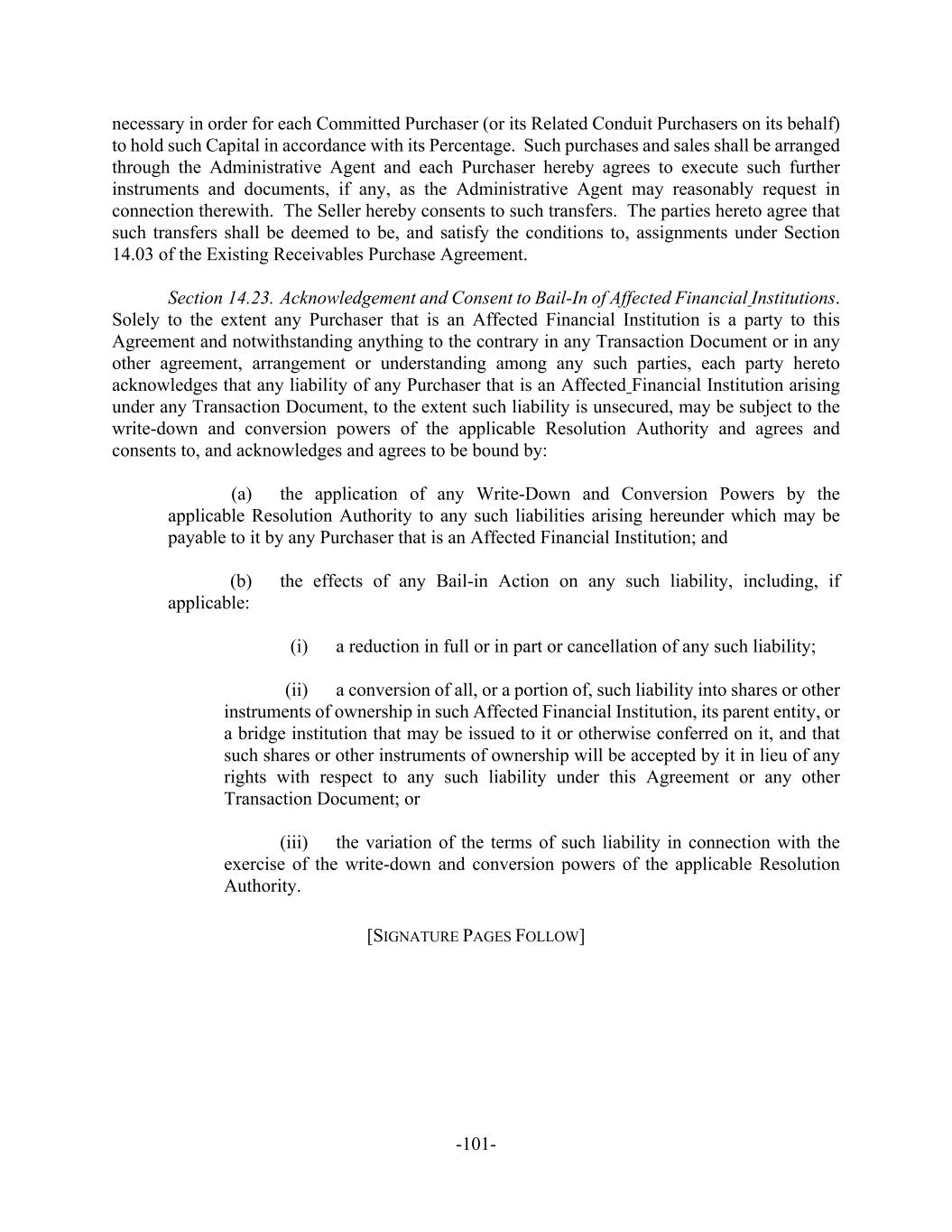 -101- necessary in order for each Committed Purchaser (or its Related Conduit Purchasers on its behalf) to hold such Capital in accordance with its Percentage. Such purchases and sales shall be arranged through the Administrative Agent and each Purchaser hereby agrees to execute such further instruments and documents, if any, as the Administrative Agent may reasonably request in connection therewith. The Seller hereby consents to such transfers. The parties hereto agree that such transfers shall be deemed to be, and satisfy the conditions to, assignments under Section 14.03 of the Existing Receivables Purchase Agreement. Section 14.23. Acknowledgement and Consent to Bail-In of Affected Financial Institutions. Solely to the extent any Purchaser that is an Affected Financial Institution is a party to this Agreement and notwithstanding anything to the contrary in any Transaction Document or in any other agreement, arrangement or understanding among any such parties, each party hereto acknowledges that any liability of any Purchaser that is an Affected Financial Institution arising under any Transaction Document, to the extent such liability is unsecured, may be subject to the write-down and conversion powers of the applicable Resolution Authority and agrees and consents to, and acknowledges and agrees to be bound by: (a) the application of any Write-Down and Conversion Powers by the applicable Resolution Authority to any such liabilities arising hereunder which may be payable to it by any Purchaser that is an Affected Financial Institution; and (b) the effects of any Bail-in Action on any such liability, including, if applicable: (i) a reduction in full or in part or cancellation of any such liability; (ii) a conversion of all, or a portion of, such liability into shares or other instruments of ownership in such Affected Financial Institution, its parent entity, or a bridge institution that may be issued to it or otherwise conferred on it, and that such shares or other instruments of ownership will be accepted by it in lieu of any rights with respect to any such liability under this Agreement or any other Transaction Document; or (iii) the variation of the terms of such liability in connection with the exercise of the write-down and conversion powers of the applicable Resolution Authority. [SIGNATURE PAGES FOLLOW]
