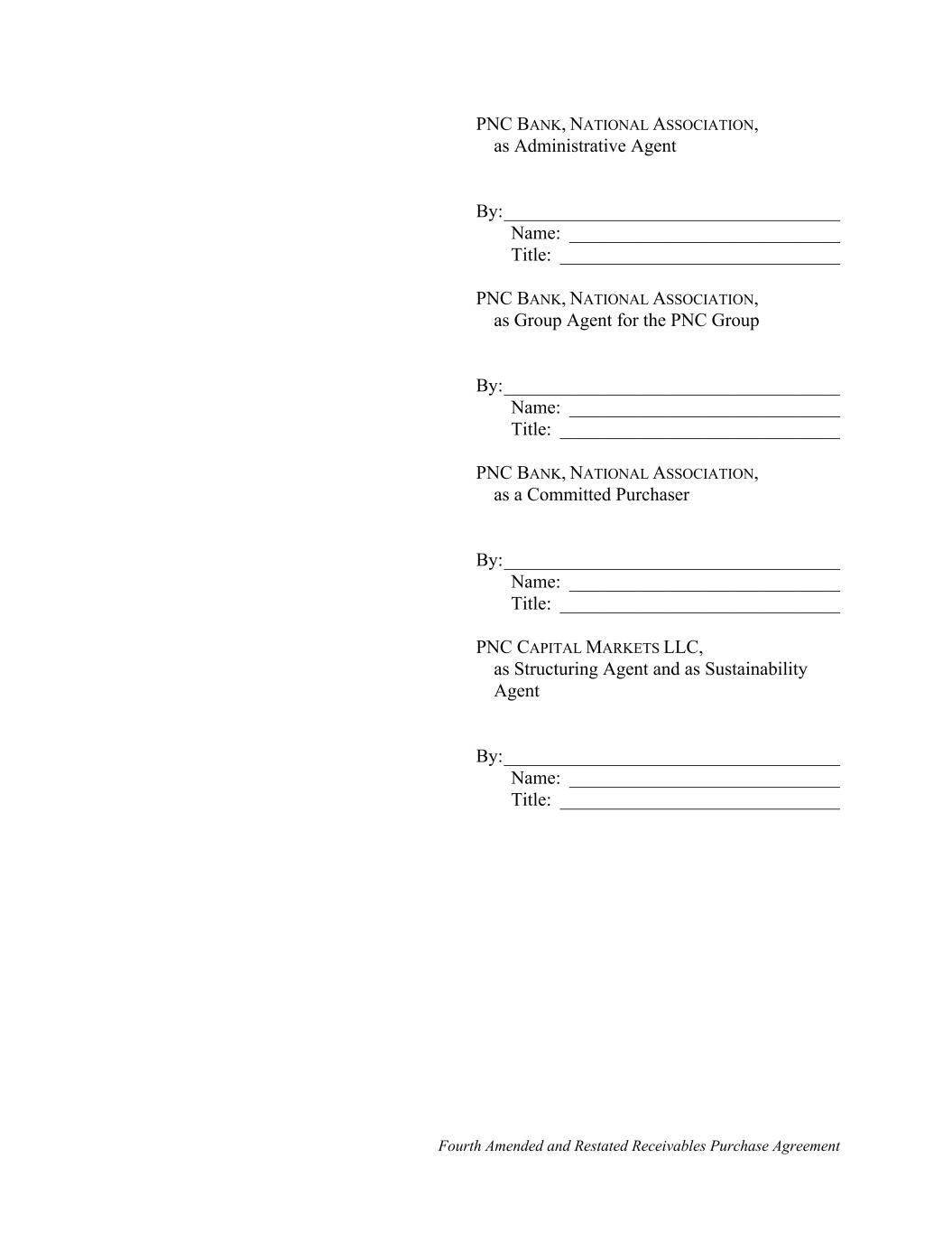 Fourth Amended and Restated Receivables Purchase Agreement PNC BANK, NATIONAL ASSOCIATION, as Administrative Agent By:____________________________________ Name: _____________________________ Title: ______________________________ PNC BANK, NATIONAL ASSOCIATION, as Group Agent for the PNC Group By:____________________________________ Name: _____________________________ Title: ______________________________ PNC BANK, NATIONAL ASSOCIATION, as a Committed Purchaser By:____________________________________ Name: _____________________________ Title: ______________________________ PNC CAPITAL MARKETS LLC, as Structuring Agent and as Sustainability Agent By:____________________________________ Name: _____________________________ Title: ______________________________
