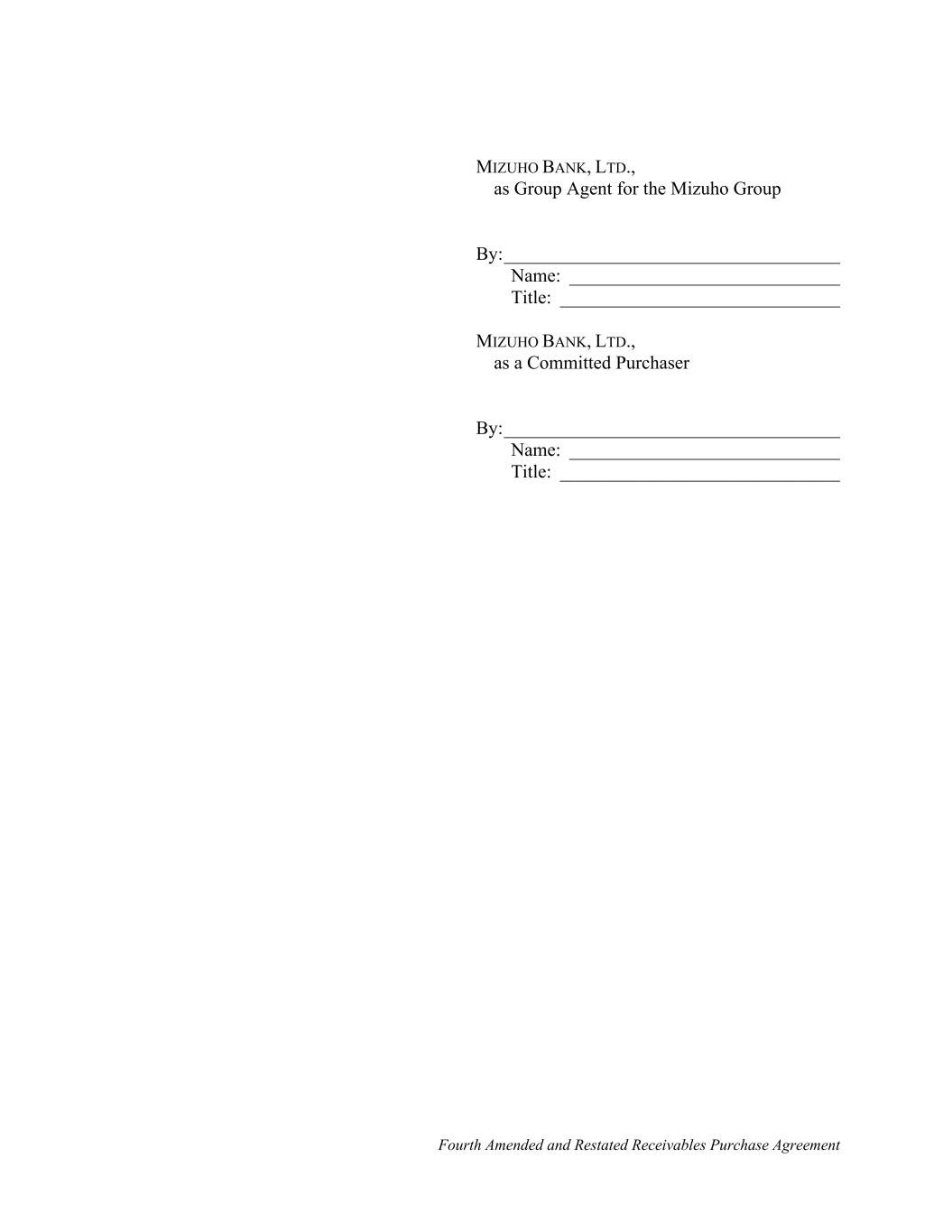 Fourth Amended and Restated Receivables Purchase Agreement MIZUHO BANK, LTD., as Group Agent for the Mizuho Group By:____________________________________ Name: _____________________________ Title: ______________________________ MIZUHO BANK, LTD., as a Committed Purchaser By:____________________________________ Name: _____________________________ Title: ______________________________