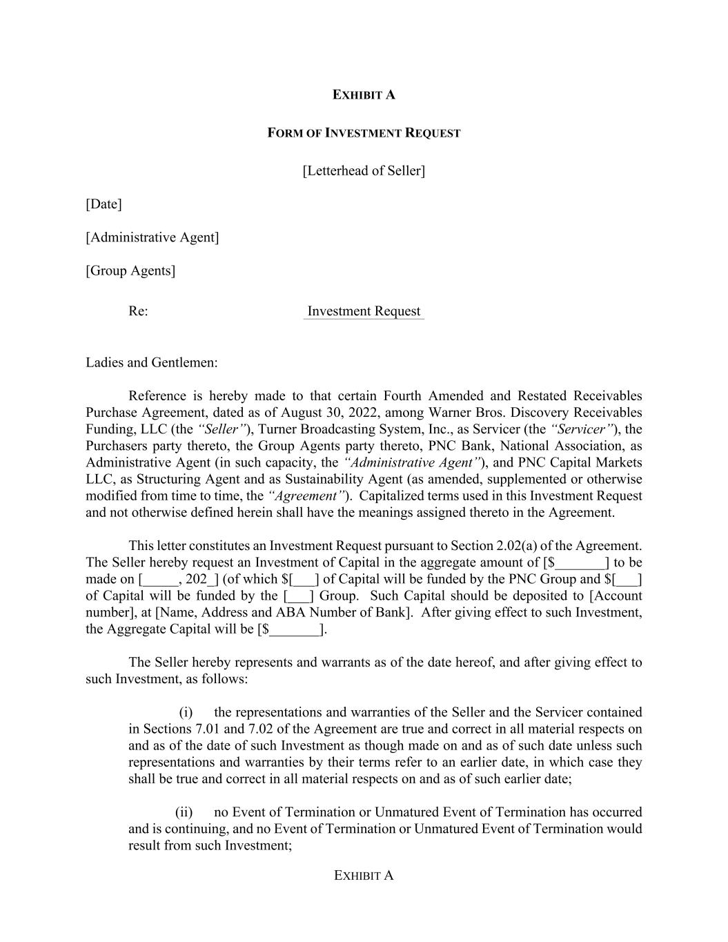 EXHIBIT A EXHIBIT A FORM OF INVESTMENT REQUEST [Letterhead of Seller] [Date] [Administrative Agent] [Group Agents] Re: Investment Request Ladies and Gentlemen: Reference is hereby made to that certain Fourth Amended and Restated Receivables Purchase Agreement, dated as of August 30, 2022, among Warner Bros. Discovery Receivables Funding, LLC (the “Seller”), Turner Broadcasting System, Inc., as Servicer (the “Servicer”), the Purchasers party thereto, the Group Agents party thereto, PNC Bank, National Association, as Administrative Agent (in such capacity, the “Administrative Agent”), and PNC Capital Markets LLC, as Structuring Agent and as Sustainability Agent (as amended, supplemented or otherwise modified from time to time, the “Agreement”). Capitalized terms used in this Investment Request and not otherwise defined herein shall have the meanings assigned thereto in the Agreement. This letter constitutes an Investment Request pursuant to Section 2.02(a) of the Agreement. The Seller hereby request an Investment of Capital in the aggregate amount of [$_______] to be made on [_____, 202_] (of which $[___] of Capital will be funded by the PNC Group and $[___] of Capital will be funded by the [___] Group. Such Capital should be deposited to [Account number], at [Name, Address and ABA Number of Bank]. After giving effect to such Investment, the Aggregate Capital will be [$_______]. The Seller hereby represents and warrants as of the date hereof, and after giving effect to such Investment, as follows: (i) the representations and warranties of the Seller and the Servicer contained in Sections 7.01 and 7.02 of the Agreement are true and correct in all material respects on and as of the date of such Investment as though made on and as of such date unless such representations and warranties by their terms refer to an earlier date, in which case they shall be true and correct in all material respects on and as of such earlier date; (ii) no Event of Termination or Unmatured Event of Termination has occurred and is continuing, and no Event of Termination or Unmatured Event of Termination would result from such Investment;