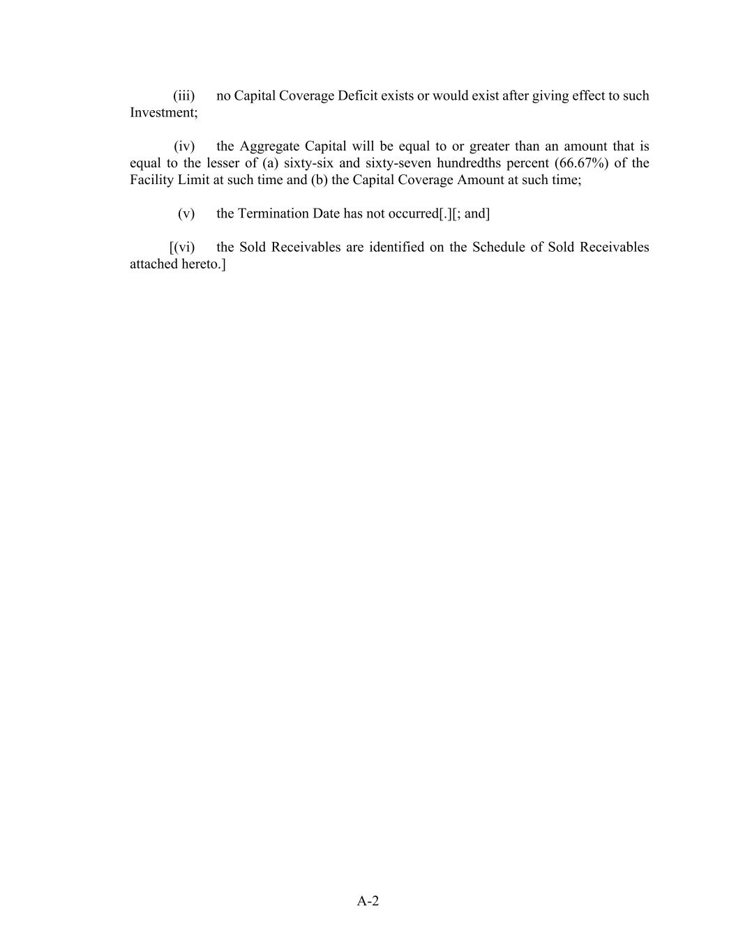 A-2 (iii) no Capital Coverage Deficit exists or would exist after giving effect to such Investment; (iv) the Aggregate Capital will be equal to or greater than an amount that is equal to the lesser of (a) sixty-six and sixty-seven hundredths percent (66.67%) of the Facility Limit at such time and (b) the Capital Coverage Amount at such time; (v) the Termination Date has not occurred[.][; and] [(vi) the Sold Receivables are identified on the Schedule of Sold Receivables attached hereto.]