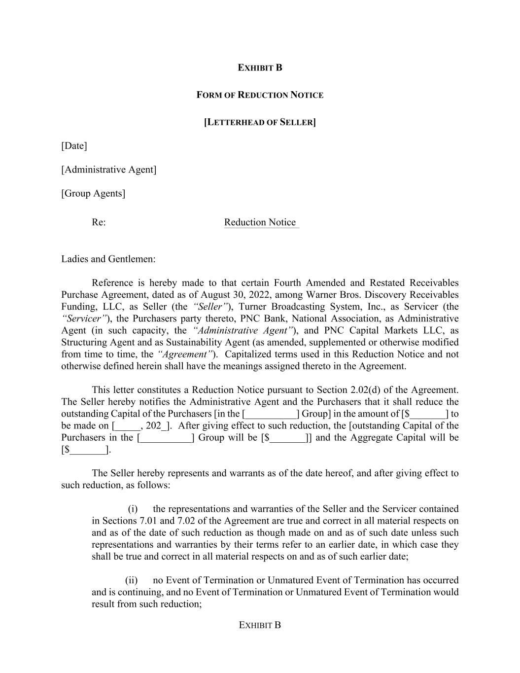 EXHIBIT B EXHIBIT B FORM OF REDUCTION NOTICE [LETTERHEAD OF SELLER] [Date] [Administrative Agent] [Group Agents] Re: Reduction Notice Ladies and Gentlemen: Reference is hereby made to that certain Fourth Amended and Restated Receivables Purchase Agreement, dated as of August 30, 2022, among Warner Bros. Discovery Receivables Funding, LLC, as Seller (the “Seller”), Turner Broadcasting System, Inc., as Servicer (the “Servicer”), the Purchasers party thereto, PNC Bank, National Association, as Administrative Agent (in such capacity, the “Administrative Agent”), and PNC Capital Markets LLC, as Structuring Agent and as Sustainability Agent (as amended, supplemented or otherwise modified from time to time, the “Agreement”). Capitalized terms used in this Reduction Notice and not otherwise defined herein shall have the meanings assigned thereto in the Agreement. This letter constitutes a Reduction Notice pursuant to Section 2.02(d) of the Agreement. The Seller hereby notifies the Administrative Agent and the Purchasers that it shall reduce the outstanding Capital of the Purchasers [in the [__________] Group] in the amount of [$_______] to be made on [_____, 202_]. After giving effect to such reduction, the [outstanding Capital of the Purchasers in the [__________] Group will be [$_______]] and the Aggregate Capital will be [$_______]. The Seller hereby represents and warrants as of the date hereof, and after giving effect to such reduction, as follows: (i) the representations and warranties of the Seller and the Servicer contained in Sections 7.01 and 7.02 of the Agreement are true and correct in all material respects on and as of the date of such reduction as though made on and as of such date unless such representations and warranties by their terms refer to an earlier date, in which case they shall be true and correct in all material respects on and as of such earlier date; (ii) no Event of Termination or Unmatured Event of Termination has occurred and is continuing, and no Event of Termination or Unmatured Event of Termination would result from such reduction;