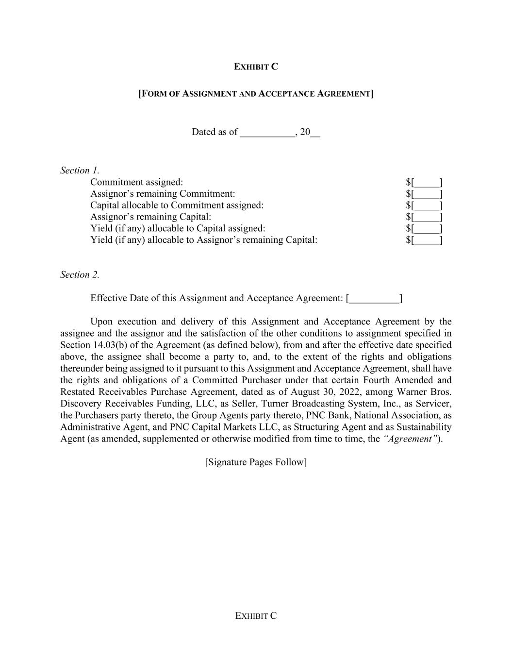 EXHIBIT C EXHIBIT C [FORM OF ASSIGNMENT AND ACCEPTANCE AGREEMENT] Dated as of ___________, 20__ Section 1. Commitment assigned: $[_____] Assignor’s remaining Commitment: $[_____] Capital allocable to Commitment assigned: $[_____] Assignor’s remaining Capital: $[_____] Yield (if any) allocable to Capital assigned: $[_____] Yield (if any) allocable to Assignor’s remaining Capital: $[_____] Section 2. Effective Date of this Assignment and Acceptance Agreement: [__________] Upon execution and delivery of this Assignment and Acceptance Agreement by the assignee and the assignor and the satisfaction of the other conditions to assignment specified in Section 14.03(b) of the Agreement (as defined below), from and after the effective date specified above, the assignee shall become a party to, and, to the extent of the rights and obligations thereunder being assigned to it pursuant to this Assignment and Acceptance Agreement, shall have the rights and obligations of a Committed Purchaser under that certain Fourth Amended and Restated Receivables Purchase Agreement, dated as of August 30, 2022, among Warner Bros. Discovery Receivables Funding, LLC, as Seller, Turner Broadcasting System, Inc., as Servicer, the Purchasers party thereto, the Group Agents party thereto, PNC Bank, National Association, as Administrative Agent, and PNC Capital Markets LLC, as Structuring Agent and as Sustainability Agent (as amended, supplemented or otherwise modified from time to time, the “Agreement”). [Signature Pages Follow]
