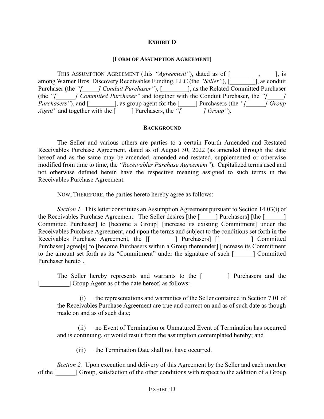 EXHIBIT D EXHIBIT D [FORM OF ASSUMPTION AGREEMENT] THIS ASSUMPTION AGREEMENT (this “Agreement”), dated as of [______ __, ____], is among Warner Bros. Discovery Receivables Funding, LLC (the “Seller”), [________], as conduit Purchaser (the “[_____] Conduit Purchaser”), [________], as the Related Committed Purchaser (the “[______] Committed Purchaser” and together with the Conduit Purchaser, the “[_____] Purchasers”), and [________], as group agent for the [_____] Purchasers (the “[______] Group Agent” and together with the [_____] Purchasers, the “[_______] Group”). BACKGROUND The Seller and various others are parties to a certain Fourth Amended and Restated Receivables Purchase Agreement, dated as of August 30, 2022 (as amended through the date hereof and as the same may be amended, amended and restated, supplemented or otherwise modified from time to time, the “Receivables Purchase Agreement”). Capitalized terms used and not otherwise defined herein have the respective meaning assigned to such terms in the Receivables Purchase Agreement. NOW, THEREFORE, the parties hereto hereby agree as follows: Section 1. This letter constitutes an Assumption Agreement pursuant to Section 14.03(i) of the Receivables Purchase Agreement. The Seller desires [the [_____] Purchasers] [the [______] Committed Purchaser] to [become a Group] [increase its existing Commitment] under the Receivables Purchase Agreement, and upon the terms and subject to the conditions set forth in the Receivables Purchase Agreement, the [[________] Purchasers] [[__________] Committed Purchaser] agree[s] to [become Purchasers within a Group thereunder] [increase its Commitment to the amount set forth as its “Commitment” under the signature of such [______] Committed Purchaser hereto]. The Seller hereby represents and warrants to the [________] Purchasers and the [_________] Group Agent as of the date hereof, as follows: (i) the representations and warranties of the Seller contained in Section 7.01 of the Receivables Purchase Agreement are true and correct on and as of such date as though made on and as of such date; (ii) no Event of Termination or Unmatured Event of Termination has occurred and is continuing, or would result from the assumption contemplated hereby; and (iii) the Termination Date shall not have occurred. Section 2. Upon execution and delivery of this Agreement by the Seller and each member of the [______] Group, satisfaction of the other conditions with respect to the addition of a Group
