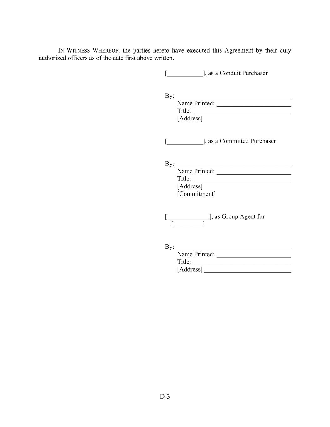 D-3 IN WITNESS WHEREOF, the parties hereto have executed this Agreement by their duly authorized officers as of the date first above written. [___________], as a Conduit Purchaser By:____________________________________ Name Printed: _______________________ Title: ______________________________ [Address] [___________], as a Committed Purchaser By:____________________________________ Name Printed: _______________________ Title: ______________________________ [Address] [Commitment] [_____________], as Group Agent for [_________] By:____________________________________ Name Printed: _______________________ Title: ______________________________ [Address] ___________________________