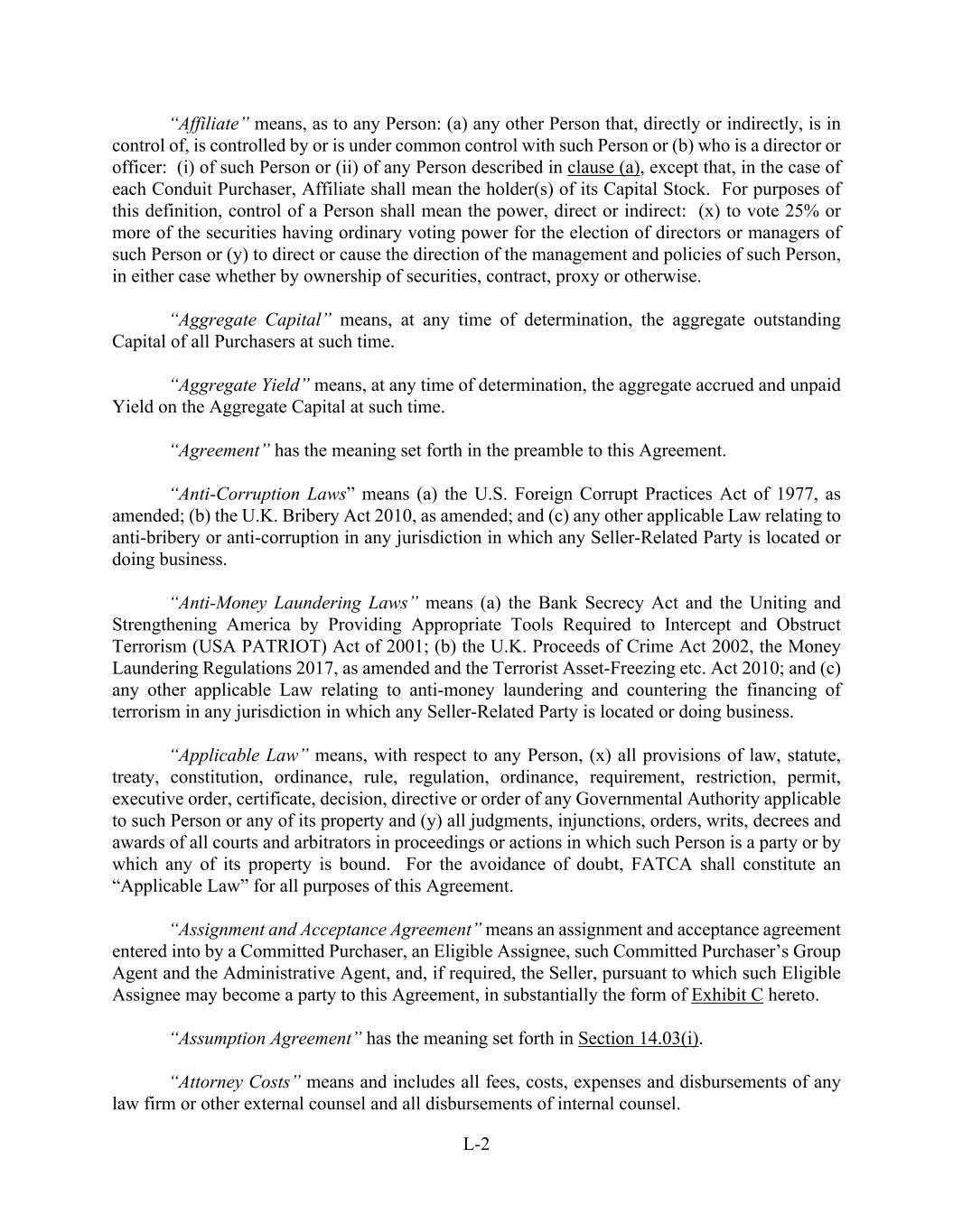 L-2 “Affiliate” means, as to any Person: (a) any other Person that, directly or indirectly, is in control of, is controlled by or is under common control with such Person or (b) who is a director or officer: (i) of such Person or (ii) of any Person described in clause (a), except that, in the case of each Conduit Purchaser, Affiliate shall mean the holder(s) of its Capital Stock. For purposes of this definition, control of a Person shall mean the power, direct or indirect: (x) to vote 25% or more of the securities having ordinary voting power for the election of directors or managers of such Person or (y) to direct or cause the direction of the management and policies of such Person, in either case whether by ownership of securities, contract, proxy or otherwise. “Aggregate Capital” means, at any time of determination, the aggregate outstanding Capital of all Purchasers at such time. “Aggregate Yield” means, at any time of determination, the aggregate accrued and unpaid Yield on the Aggregate Capital at such time. “Agreement” has the meaning set forth in the preamble to this Agreement. “Anti-Corruption Laws” means (a) the U.S. Foreign Corrupt Practices Act of 1977, as amended; (b) the U.K. Bribery Act 2010, as amended; and (c) any other applicable Law relating to anti-bribery or anti-corruption in any jurisdiction in which any Seller-Related Party is located or doing business. “Anti-Money Laundering Laws” means (a) the Bank Secrecy Act and the Uniting and Strengthening America by Providing Appropriate Tools Required to Intercept and Obstruct Terrorism (USA PATRIOT) Act of 2001; (b) the U.K. Proceeds of Crime Act 2002, the Money Laundering Regulations 2017, as amended and the Terrorist Asset-Freezing etc. Act 2010; and (c) any other applicable Law relating to anti-money laundering and countering the financing of terrorism in any jurisdiction in which any Seller-Related Party is located or doing business. “Applicable Law” means, with respect to any Person, (x) all provisions of law, statute, treaty, constitution, ordinance, rule, regulation, ordinance, requirement, restriction, permit, executive order, certificate, decision, directive or order of any Governmental Authority applicable to such Person or any of its property and (y) all judgments, injunctions, orders, writs, decrees and awards of all courts and arbitrators in proceedings or actions in which such Person is a party or by which any of its property is bound. For the avoidance of doubt, FATCA shall constitute an “Applicable Law” for all purposes of this Agreement. “Assignment and Acceptance Agreement” means an assignment and acceptance agreement entered into by a Committed Purchaser, an Eligible Assignee, such Committed Purchaser’s Group Agent and the Administrative Agent, and, if required, the Seller, pursuant to which such Eligible Assignee may become a party to this Agreement, in substantially the form of Exhibit C hereto. “Assumption Agreement” has the meaning set forth in Section 14.03(i). “Attorney Costs” means and includes all fees, costs, expenses and disbursements of any law firm or other external counsel and all disbursements of internal counsel.