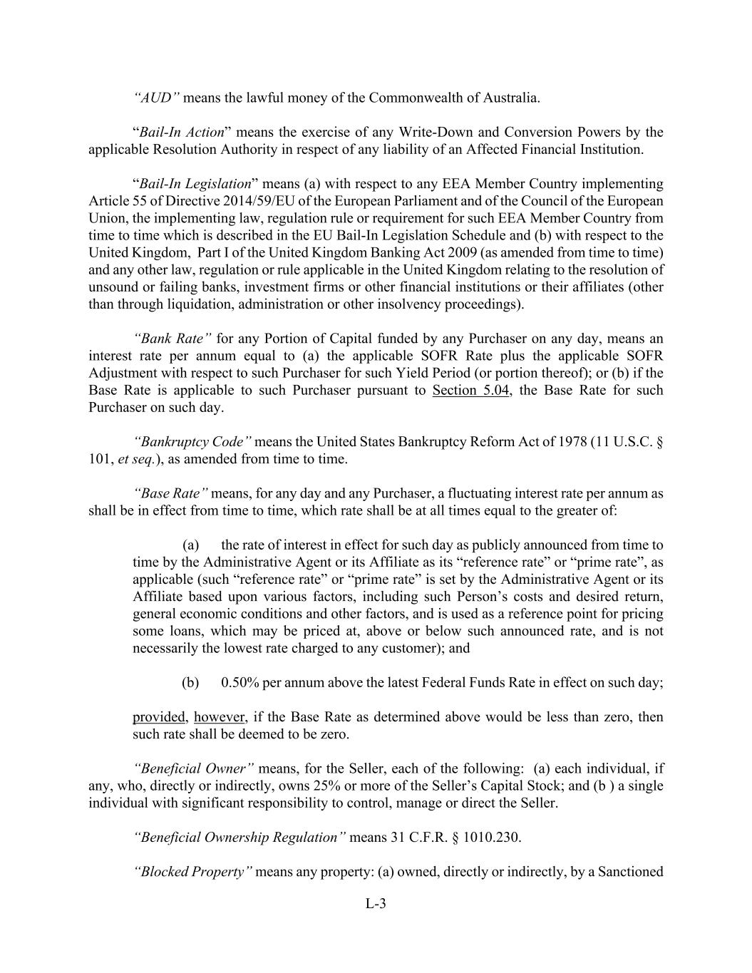 L-3 “AUD” means the lawful money of the Commonwealth of Australia. “Bail-In Action” means the exercise of any Write-Down and Conversion Powers by the applicable Resolution Authority in respect of any liability of an Affected Financial Institution. “Bail-In Legislation” means (a) with respect to any EEA Member Country implementing Article 55 of Directive 2014/59/EU of the European Parliament and of the Council of the European Union, the implementing law, regulation rule or requirement for such EEA Member Country from time to time which is described in the EU Bail-In Legislation Schedule and (b) with respect to the United Kingdom, Part I of the United Kingdom Banking Act 2009 (as amended from time to time) and any other law, regulation or rule applicable in the United Kingdom relating to the resolution of unsound or failing banks, investment firms or other financial institutions or their affiliates (other than through liquidation, administration or other insolvency proceedings). “Bank Rate” for any Portion of Capital funded by any Purchaser on any day, means an interest rate per annum equal to (a) the applicable SOFR Rate plus the applicable SOFR Adjustment with respect to such Purchaser for such Yield Period (or portion thereof); or (b) if the Base Rate is applicable to such Purchaser pursuant to Section 5.04, the Base Rate for such Purchaser on such day. “Bankruptcy Code” means the United States Bankruptcy Reform Act of 1978 (11 U.S.C. § 101, et seq.), as amended from time to time. “Base Rate” means, for any day and any Purchaser, a fluctuating interest rate per annum as shall be in effect from time to time, which rate shall be at all times equal to the greater of: (a) the rate of interest in effect for such day as publicly announced from time to time by the Administrative Agent or its Affiliate as its “reference rate” or “prime rate”, as applicable (such “reference rate” or “prime rate” is set by the Administrative Agent or its Affiliate based upon various factors, including such Person’s costs and desired return, general economic conditions and other factors, and is used as a reference point for pricing some loans, which may be priced at, above or below such announced rate, and is not necessarily the lowest rate charged to any customer); and (b) 0.50% per annum above the latest Federal Funds Rate in effect on such day; provided, however, if the Base Rate as determined above would be less than zero, then such rate shall be deemed to be zero. “Beneficial Owner” means, for the Seller, each of the following: (a) each individual, if any, who, directly or indirectly, owns 25% or more of the Seller’s Capital Stock; and (b ) a single individual with significant responsibility to control, manage or direct the Seller. “Beneficial Ownership Regulation” means 31 C.F.R. § 1010.230. “Blocked Property” means any property: (a) owned, directly or indirectly, by a Sanctioned