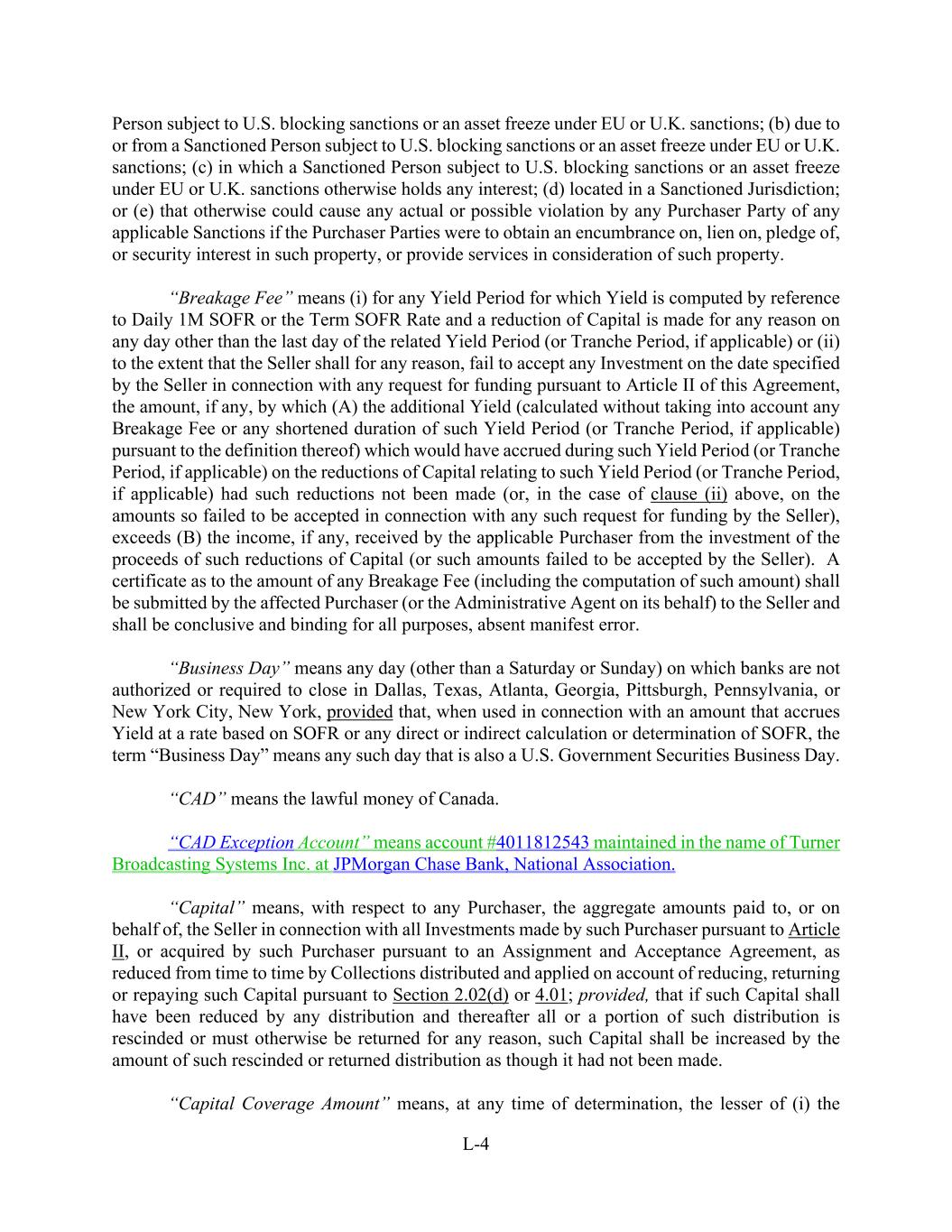 L-4 Person subject to U.S. blocking sanctions or an asset freeze under EU or U.K. sanctions; (b) due to or from a Sanctioned Person subject to U.S. blocking sanctions or an asset freeze under EU or U.K. sanctions; (c) in which a Sanctioned Person subject to U.S. blocking sanctions or an asset freeze under EU or U.K. sanctions otherwise holds any interest; (d) located in a Sanctioned Jurisdiction; or (e) that otherwise could cause any actual or possible violation by any Purchaser Party of any applicable Sanctions if the Purchaser Parties were to obtain an encumbrance on, lien on, pledge of, or security interest in such property, or provide services in consideration of such property. “Breakage Fee” means (i) for any Yield Period for which Yield is computed by reference to Daily 1M SOFR or the Term SOFR Rate and a reduction of Capital is made for any reason on any day other than the last day of the related Yield Period (or Tranche Period, if applicable) or (ii) to the extent that the Seller shall for any reason, fail to accept any Investment on the date specified by the Seller in connection with any request for funding pursuant to Article II of this Agreement, the amount, if any, by which (A) the additional Yield (calculated without taking into account any Breakage Fee or any shortened duration of such Yield Period (or Tranche Period, if applicable) pursuant to the definition thereof) which would have accrued during such Yield Period (or Tranche Period, if applicable) on the reductions of Capital relating to such Yield Period (or Tranche Period, if applicable) had such reductions not been made (or, in the case of clause (ii) above, on the amounts so failed to be accepted in connection with any such request for funding by the Seller), exceeds (B) the income, if any, received by the applicable Purchaser from the investment of the proceeds of such reductions of Capital (or such amounts failed to be accepted by the Seller). A certificate as to the amount of any Breakage Fee (including the computation of such amount) shall be submitted by the affected Purchaser (or the Administrative Agent on its behalf) to the Seller and shall be conclusive and binding for all purposes, absent manifest error. “Business Day” means any day (other than a Saturday or Sunday) on which banks are not authorized or required to close in Dallas, Texas, Atlanta, Georgia, Pittsburgh, Pennsylvania, or New York City, New York, provided that, when used in connection with an amount that accrues Yield at a rate based on SOFR or any direct or indirect calculation or determination of SOFR, the term “Business Day” means any such day that is also a U.S. Government Securities Business Day. “CAD” means the lawful money of Canada. “CAD Exception Account” means account #4011812543 maintained in the name of Turner Broadcasting Systems Inc. at JPMorgan Chase Bank, National Association. “Capital” means, with respect to any Purchaser, the aggregate amounts paid to, or on behalf of, the Seller in connection with all Investments made by such Purchaser pursuant to Article II, or acquired by such Purchaser pursuant to an Assignment and Acceptance Agreement, as reduced from time to time by Collections distributed and applied on account of reducing, returning or repaying such Capital pursuant to Section 2.02(d) or 4.01; provided, that if such Capital shall have been reduced by any distribution and thereafter all or a portion of such distribution is rescinded or must otherwise be returned for any reason, such Capital shall be increased by the amount of such rescinded or returned distribution as though it had not been made. “Capital Coverage Amount” means, at any time of determination, the lesser of (i) the