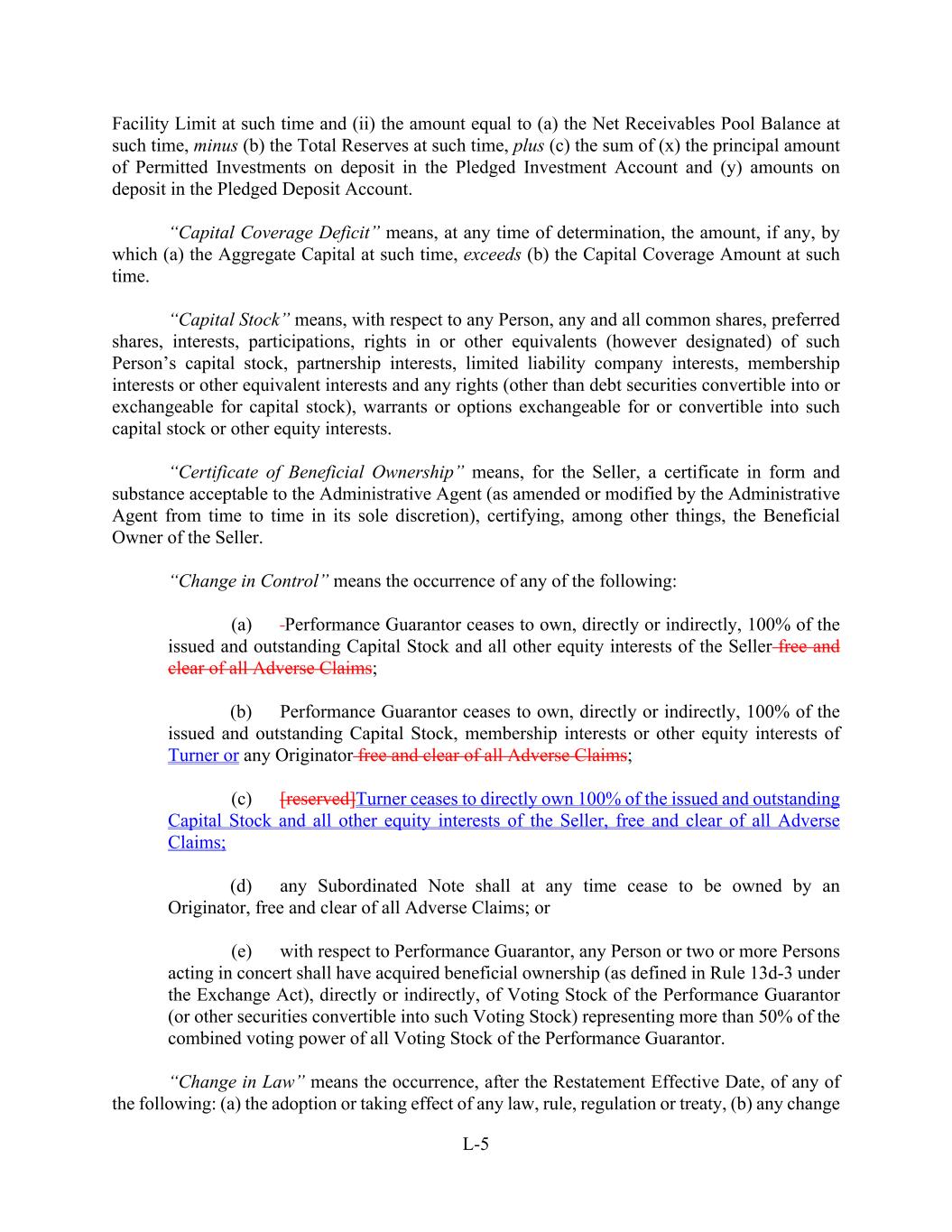 L-5 Facility Limit at such time and (ii) the amount equal to (a) the Net Receivables Pool Balance at such time, minus (b) the Total Reserves at such time, plus (c) the sum of (x) the principal amount of Permitted Investments on deposit in the Pledged Investment Account and (y) amounts on deposit in the Pledged Deposit Account. “Capital Coverage Deficit” means, at any time of determination, the amount, if any, by which (a) the Aggregate Capital at such time, exceeds (b) the Capital Coverage Amount at such time. “Capital Stock” means, with respect to any Person, any and all common shares, preferred shares, interests, participations, rights in or other equivalents (however designated) of such Person’s capital stock, partnership interests, limited liability company interests, membership interests or other equivalent interests and any rights (other than debt securities convertible into or exchangeable for capital stock), warrants or options exchangeable for or convertible into such capital stock or other equity interests. “Certificate of Beneficial Ownership” means, for the Seller, a certificate in form and substance acceptable to the Administrative Agent (as amended or modified by the Administrative Agent from time to time in its sole discretion), certifying, among other things, the Beneficial Owner of the Seller. “Change in Control” means the occurrence of any of the following: (a) Performance Guarantor ceases to own, directly or indirectly, 100% of the issued and outstanding Capital Stock and all other equity interests of the Seller free and clear of all Adverse Claims; (b) Performance Guarantor ceases to own, directly or indirectly, 100% of the issued and outstanding Capital Stock, membership interests or other equity interests of Turner or any Originator free and clear of all Adverse Claims; (c) [reserved]Turner ceases to directly own 100% of the issued and outstanding Capital Stock and all other equity interests of the Seller, free and clear of all Adverse Claims; (d) any Subordinated Note shall at any time cease to be owned by an Originator, free and clear of all Adverse Claims; or (e) with respect to Performance Guarantor, any Person or two or more Persons acting in concert shall have acquired beneficial ownership (as defined in Rule 13d-3 under the Exchange Act), directly or indirectly, of Voting Stock of the Performance Guarantor (or other securities convertible into such Voting Stock) representing more than 50% of the combined voting power of all Voting Stock of the Performance Guarantor. “Change in Law” means the occurrence, after the Restatement Effective Date, of any of the following: (a) the adoption or taking effect of any law, rule, regulation or treaty, (b) any change
