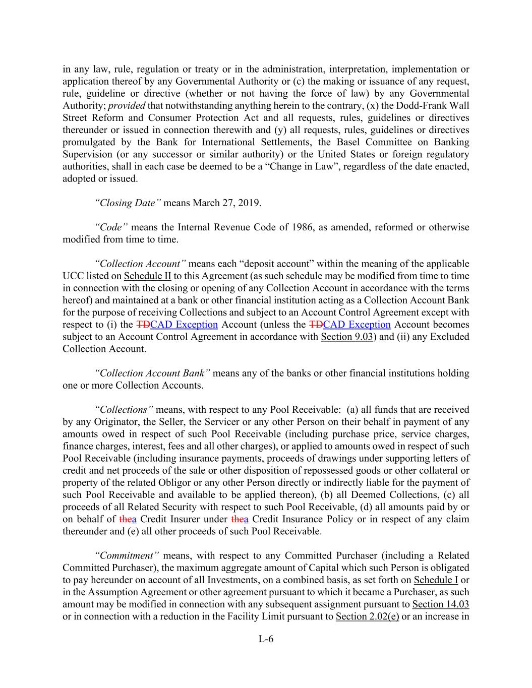 L-6 in any law, rule, regulation or treaty or in the administration, interpretation, implementation or application thereof by any Governmental Authority or (c) the making or issuance of any request, rule, guideline or directive (whether or not having the force of law) by any Governmental Authority; provided that notwithstanding anything herein to the contrary, (x) the Dodd-Frank Wall Street Reform and Consumer Protection Act and all requests, rules, guidelines or directives thereunder or issued in connection therewith and (y) all requests, rules, guidelines or directives promulgated by the Bank for International Settlements, the Basel Committee on Banking Supervision (or any successor or similar authority) or the United States or foreign regulatory authorities, shall in each case be deemed to be a “Change in Law”, regardless of the date enacted, adopted or issued. “Closing Date” means March 27, 2019. “Code” means the Internal Revenue Code of 1986, as amended, reformed or otherwise modified from time to time. “Collection Account” means each “deposit account” within the meaning of the applicable UCC listed on Schedule II to this Agreement (as such schedule may be modified from time to time in connection with the closing or opening of any Collection Account in accordance with the terms hereof) and maintained at a bank or other financial institution acting as a Collection Account Bank for the purpose of receiving Collections and subject to an Account Control Agreement except with respect to (i) the TDCAD Exception Account (unless the TDCAD Exception Account becomes subject to an Account Control Agreement in accordance with Section 9.03) and (ii) any Excluded Collection Account. “Collection Account Bank” means any of the banks or other financial institutions holding one or more Collection Accounts. “Collections” means, with respect to any Pool Receivable: (a) all funds that are received by any Originator, the Seller, the Servicer or any other Person on their behalf in payment of any amounts owed in respect of such Pool Receivable (including purchase price, service charges, finance charges, interest, fees and all other charges), or applied to amounts owed in respect of such Pool Receivable (including insurance payments, proceeds of drawings under supporting letters of credit and net proceeds of the sale or other disposition of repossessed goods or other collateral or property of the related Obligor or any other Person directly or indirectly liable for the payment of such Pool Receivable and available to be applied thereon), (b) all Deemed Collections, (c) all proceeds of all Related Security with respect to such Pool Receivable, (d) all amounts paid by or on behalf of thea Credit Insurer under thea Credit Insurance Policy or in respect of any claim thereunder and (e) all other proceeds of such Pool Receivable. “Commitment” means, with respect to any Committed Purchaser (including a Related Committed Purchaser), the maximum aggregate amount of Capital which such Person is obligated to pay hereunder on account of all Investments, on a combined basis, as set forth on Schedule I or in the Assumption Agreement or other agreement pursuant to which it became a Purchaser, as such amount may be modified in connection with any subsequent assignment pursuant to Section 14.03 or in connection with a reduction in the Facility Limit pursuant to Section 2.02(e) or an increase in