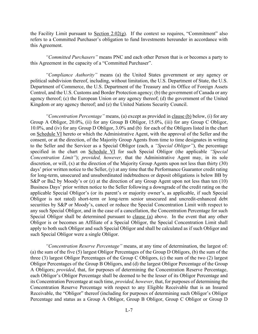 L-7 the Facility Limit pursuant to Section 2.02(g). If the context so requires, “Commitment” also refers to a Committed Purchaser’s obligation to fund Investments hereunder in accordance with this Agreement. “Committed Purchasers” means PNC and each other Person that is or becomes a party to this Agreement in the capacity of a “Committed Purchaser”. “Compliance Authority” means (a) the United States government or any agency or political subdivision thereof, including, without limitation, the U.S. Department of State, the U.S. Department of Commerce, the U.S. Department of the Treasury and its Office of Foreign Assets Control, and the U.S. Customs and Border Protection agency; (b) the government of Canada or any agency thereof; (c) the European Union or any agency thereof; (d) the government of the United Kingdom or any agency thereof; and (e) the United Nations Security Council. “Concentration Percentage” means, (a) except as provided in clause (b) below, (i) for any Group A Obligor, 20.0%, (ii) for any Group B Obligor, 15.0%, (iii) for any Group C Obligor, 10.0%, and (iv) for any Group D Obligor, 3.0% and (b) for each of the Obligors listed in the chart on Schedule VI hereto or which the Administrative Agent, with the approval of the Seller and the consent, or at the direction, of the Majority Group Agents from time to time designates in writing to the Seller and the Servicer as a Special Obligor (each, a “Special Obligor”), the percentage specified in the chart on Schedule VI for such Special Obligor (the applicable “Special Concentration Limit”); provided, however, that the Administrative Agent may, in its sole discretion, or will, (x) at the direction of the Majority Group Agents upon not less than thirty (30) days’ prior written notice to the Seller, (y) at any time that the Performance Guarantor credit rating for long-term, unsecured and unsubordinated indebtedness or deposit obligations is below BB by S&P or Ba2 by Moody’s or (z) at the direction of any Group Agent upon not less than ten (10) Business Days’ prior written notice to the Seller following a downgrade of the credit rating on the applicable Special Obligor’s (or its parent’s or majority owner’s, as applicable, if such Special Obligor is not rated) short-term or long-term senior unsecured and uncredit-enhanced debt securities by S&P or Moody’s, cancel or reduce the Special Concentration Limit with respect to any such Special Obligor, and in the case of a cancellation, the Concentration Percentage for such Special Obligor shall be determined pursuant to clause (a) above. In the event that any other Obligor is or becomes an Affiliate of a Special Obligor, the Special Concentration Limit shall apply to both such Obligor and such Special Obligor and shall be calculated as if such Obligor and such Special Obligor were a single Obligor. “Concentration Reserve Percentage” means, at any time of determination, the largest of: (a) the sum of the five (5) largest Obligor Percentages of the Group D Obligors, (b) the sum of the three (3) largest Obligor Percentages of the Group C Obligors, (c) the sum of the two (2) largest Obligor Percentages of the Group B Obligors, and (d) the largest Obligor Percentage of the Group A Obligors; provided, that, for purposes of determining the Concentration Reserve Percentage, each Obligor’s Obligor Percentage shall be deemed to be the lesser of its Obligor Percentage and its Concentration Percentage at such time, provided, however, that, for purposes of determining the Concentration Reserve Percentage with respect to any Eligible Receivable that is an Insured Receivable, the “Obligor” thereof (including for purposes of determining such Obligor’s Obligor Percentage and status as a Group A Obligor, Group B Obligor, Group C Obligor or Group D