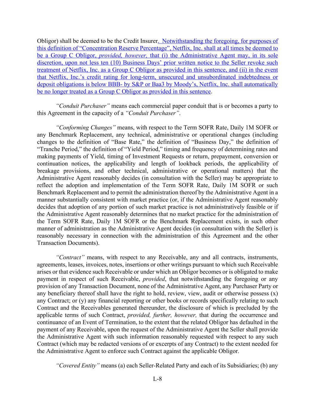 L-8 Obligor) shall be deemed to be the Credit Insurer. Notwithstanding the foregoing, for purposes of this definition of “Concentration Reserve Percentage”, Netflix, Inc. shall at all times be deemed to be a Group C Obligor, provided, however, that (i) the Administrative Agent may, in its sole discretion, upon not less ten (10) Business Days’ prior written notice to the Seller revoke such treatment of Netflix, Inc. as a Group C Obligor as provided in this sentence, and (ii) in the event that Netflix, Inc.’s credit rating for long-term, unsecured and unsubordinated indebtedness or deposit obligations is below BBB- by S&P or Baa3 by Moody’s, Netflix, Inc. shall automatically be no longer treated as a Group C Obligor as provided in this sentence. “Conduit Purchaser” means each commercial paper conduit that is or becomes a party to this Agreement in the capacity of a “Conduit Purchaser”. “Conforming Changes” means, with respect to the Term SOFR Rate, Daily 1M SOFR or any Benchmark Replacement, any technical, administrative or operational changes (including changes to the definition of “Base Rate,” the definition of “Business Day,” the definition of “Tranche Period,” the definition of “Yield Period,” timing and frequency of determining rates and making payments of Yield, timing of Investment Requests or return, prepayment, conversion or continuation notices, the applicability and length of lookback periods, the applicability of breakage provisions, and other technical, administrative or operational matters) that the Administrative Agent reasonably decides (in consultation with the Seller) may be appropriate to reflect the adoption and implementation of the Term SOFR Rate, Daily 1M SOFR or such Benchmark Replacement and to permit the administration thereof by the Administrative Agent in a manner substantially consistent with market practice (or, if the Administrative Agent reasonably decides that adoption of any portion of such market practice is not administratively feasible or if the Administrative Agent reasonably determines that no market practice for the administration of the Term SOFR Rate, Daily 1M SOFR or the Benchmark Replacement exists, in such other manner of administration as the Administrative Agent decides (in consultation with the Seller) is reasonably necessary in connection with the administration of this Agreement and the other Transaction Documents). “Contract” means, with respect to any Receivable, any and all contracts, instruments, agreements, leases, invoices, notes, insertions or other writings pursuant to which such Receivable arises or that evidence such Receivable or under which an Obligor becomes or is obligated to make payment in respect of such Receivable, provided, that notwithstanding the foregoing or any provision of any Transaction Document, none of the Administrative Agent, any Purchaser Party or any beneficiary thereof shall have the right to hold, review, view, audit or otherwise possess (x) any Contract; or (y) any financial reporting or other books or records specifically relating to such Contract and the Receivables generated thereunder, the disclosure of which is precluded by the applicable terms of such Contract, provided, further, however, that during the occurrence and continuance of an Event of Termination, to the extent that the related Obligor has defaulted in the payment of any Receivable, upon the request of the Administrative Agent the Seller shall provide the Administrative Agent with such information reasonably requested with respect to any such Contract (which may be redacted versions of or excerpts of any Contract) to the extent needed for the Administrative Agent to enforce such Contract against the applicable Obligor. “Covered Entity” means (a) each Seller-Related Party and each of its Subsidiaries; (b) any