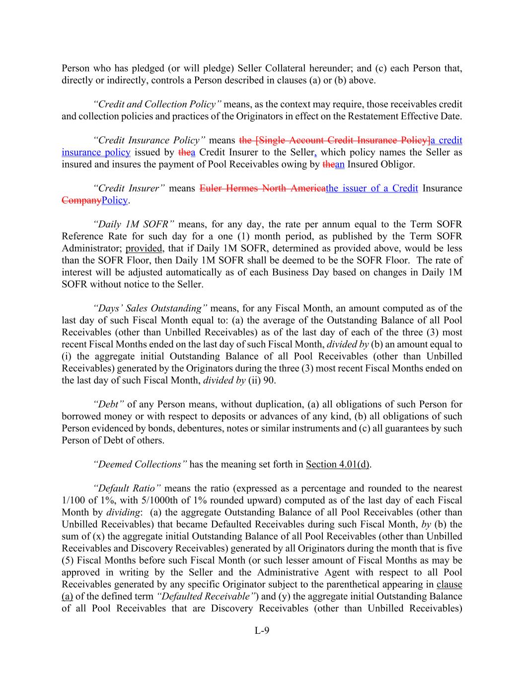 L-9 Person who has pledged (or will pledge) Seller Collateral hereunder; and (c) each Person that, directly or indirectly, controls a Person described in clauses (a) or (b) above. “Credit and Collection Policy” means, as the context may require, those receivables credit and collection policies and practices of the Originators in effect on the Restatement Effective Date. “Credit Insurance Policy” means the [Single Account Credit Insurance Policy]a credit insurance policy issued by thea Credit Insurer to the Seller, which policy names the Seller as insured and insures the payment of Pool Receivables owing by thean Insured Obligor. “Credit Insurer” means Euler Hermes North Americathe issuer of a Credit Insurance CompanyPolicy. “Daily 1M SOFR” means, for any day, the rate per annum equal to the Term SOFR Reference Rate for such day for a one (1) month period, as published by the Term SOFR Administrator; provided, that if Daily 1M SOFR, determined as provided above, would be less than the SOFR Floor, then Daily 1M SOFR shall be deemed to be the SOFR Floor. The rate of interest will be adjusted automatically as of each Business Day based on changes in Daily 1M SOFR without notice to the Seller. “Days’ Sales Outstanding” means, for any Fiscal Month, an amount computed as of the last day of such Fiscal Month equal to: (a) the average of the Outstanding Balance of all Pool Receivables (other than Unbilled Receivables) as of the last day of each of the three (3) most recent Fiscal Months ended on the last day of such Fiscal Month, divided by (b) an amount equal to (i) the aggregate initial Outstanding Balance of all Pool Receivables (other than Unbilled Receivables) generated by the Originators during the three (3) most recent Fiscal Months ended on the last day of such Fiscal Month, divided by (ii) 90. “Debt” of any Person means, without duplication, (a) all obligations of such Person for borrowed money or with respect to deposits or advances of any kind, (b) all obligations of such Person evidenced by bonds, debentures, notes or similar instruments and (c) all guarantees by such Person of Debt of others. “Deemed Collections” has the meaning set forth in Section 4.01(d). “Default Ratio” means the ratio (expressed as a percentage and rounded to the nearest 1/100 of 1%, with 5/1000th of 1% rounded upward) computed as of the last day of each Fiscal Month by dividing: (a) the aggregate Outstanding Balance of all Pool Receivables (other than Unbilled Receivables) that became Defaulted Receivables during such Fiscal Month, by (b) the sum of (x) the aggregate initial Outstanding Balance of all Pool Receivables (other than Unbilled Receivables and Discovery Receivables) generated by all Originators during the month that is five (5) Fiscal Months before such Fiscal Month (or such lesser amount of Fiscal Months as may be approved in writing by the Seller and the Administrative Agent with respect to all Pool Receivables generated by any specific Originator subject to the parenthetical appearing in clause (a) of the defined term “Defaulted Receivable”) and (y) the aggregate initial Outstanding Balance of all Pool Receivables that are Discovery Receivables (other than Unbilled Receivables)