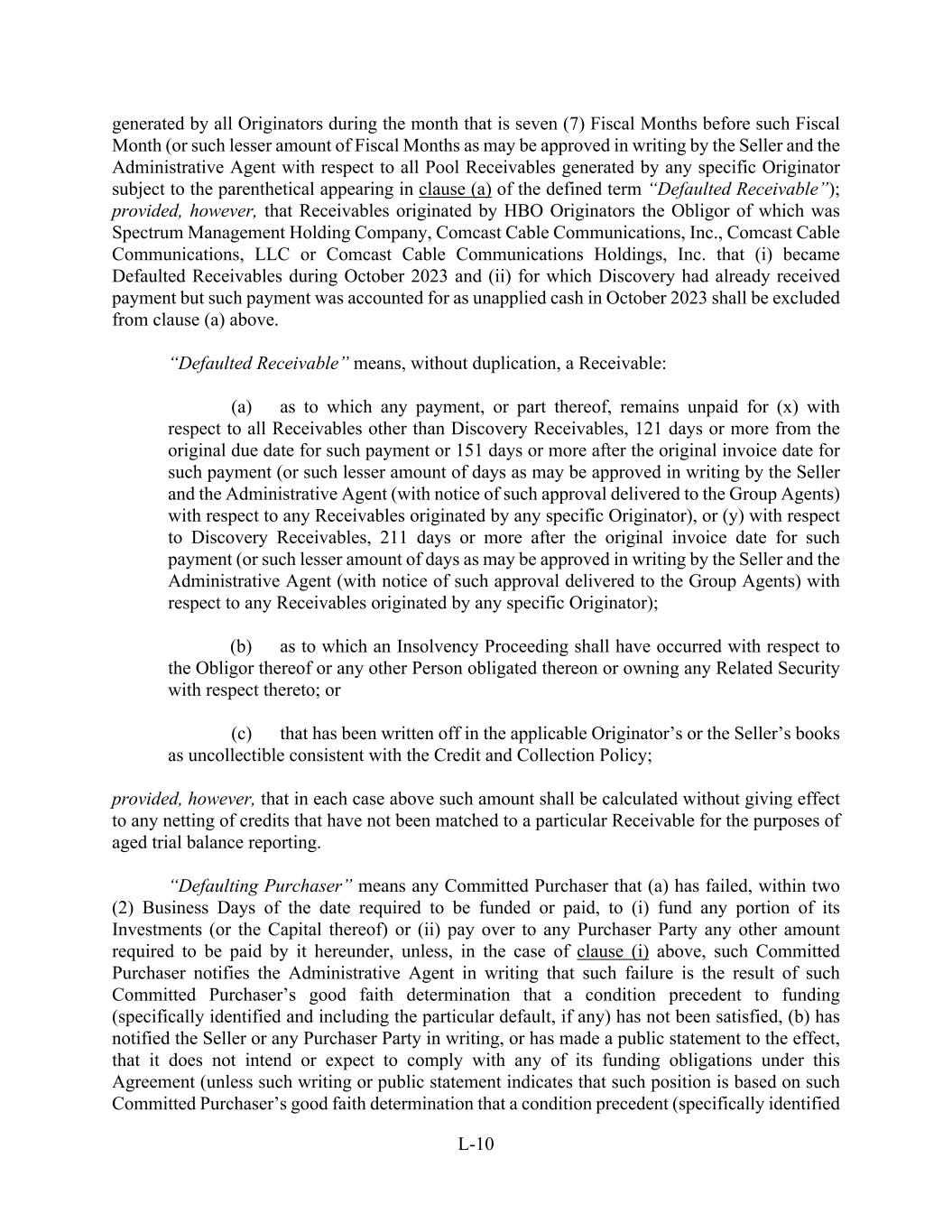L-10 generated by all Originators during the month that is seven (7) Fiscal Months before such Fiscal Month (or such lesser amount of Fiscal Months as may be approved in writing by the Seller and the Administrative Agent with respect to all Pool Receivables generated by any specific Originator subject to the parenthetical appearing in clause (a) of the defined term “Defaulted Receivable”); provided, however, that Receivables originated by HBO Originators the Obligor of which was Spectrum Management Holding Company, Comcast Cable Communications, Inc., Comcast Cable Communications, LLC or Comcast Cable Communications Holdings, Inc. that (i) became Defaulted Receivables during October 2023 and (ii) for which Discovery had already received payment but such payment was accounted for as unapplied cash in October 2023 shall be excluded from clause (a) above. “Defaulted Receivable” means, without duplication, a Receivable: (a) as to which any payment, or part thereof, remains unpaid for (x) with respect to all Receivables other than Discovery Receivables, 121 days or more from the original due date for such payment or 151 days or more after the original invoice date for such payment (or such lesser amount of days as may be approved in writing by the Seller and the Administrative Agent (with notice of such approval delivered to the Group Agents) with respect to any Receivables originated by any specific Originator), or (y) with respect to Discovery Receivables, 211 days or more after the original invoice date for such payment (or such lesser amount of days as may be approved in writing by the Seller and the Administrative Agent (with notice of such approval delivered to the Group Agents) with respect to any Receivables originated by any specific Originator); (b) as to which an Insolvency Proceeding shall have occurred with respect to the Obligor thereof or any other Person obligated thereon or owning any Related Security with respect thereto; or (c) that has been written off in the applicable Originator’s or the Seller’s books as uncollectible consistent with the Credit and Collection Policy; provided, however, that in each case above such amount shall be calculated without giving effect to any netting of credits that have not been matched to a particular Receivable for the purposes of aged trial balance reporting. “Defaulting Purchaser” means any Committed Purchaser that (a) has failed, within two (2) Business Days of the date required to be funded or paid, to (i) fund any portion of its Investments (or the Capital thereof) or (ii) pay over to any Purchaser Party any other amount required to be paid by it hereunder, unless, in the case of clause (i) above, such Committed Purchaser notifies the Administrative Agent in writing that such failure is the result of such Committed Purchaser’s good faith determination that a condition precedent to funding (specifically identified and including the particular default, if any) has not been satisfied, (b) has notified the Seller or any Purchaser Party in writing, or has made a public statement to the effect, that it does not intend or expect to comply with any of its funding obligations under this Agreement (unless such writing or public statement indicates that such position is based on such Committed Purchaser’s good faith determination that a condition precedent (specifically identified
