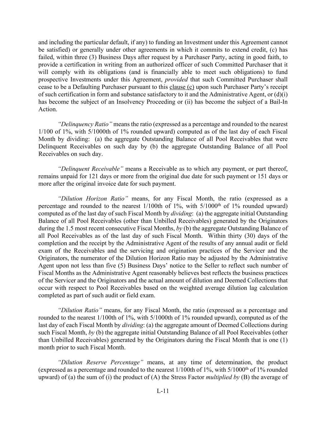 L-11 and including the particular default, if any) to funding an Investment under this Agreement cannot be satisfied) or generally under other agreements in which it commits to extend credit, (c) has failed, within three (3) Business Days after request by a Purchaser Party, acting in good faith, to provide a certification in writing from an authorized officer of such Committed Purchaser that it will comply with its obligations (and is financially able to meet such obligations) to fund prospective Investments under this Agreement, provided that such Committed Purchaser shall cease to be a Defaulting Purchaser pursuant to this clause (c) upon such Purchaser Party’s receipt of such certification in form and substance satisfactory to it and the Administrative Agent, or (d)(i) has become the subject of an Insolvency Proceeding or (ii) has become the subject of a Bail-In Action. “Delinquency Ratio” means the ratio (expressed as a percentage and rounded to the nearest 1/100 of 1%, with 5/1000th of 1% rounded upward) computed as of the last day of each Fiscal Month by dividing: (a) the aggregate Outstanding Balance of all Pool Receivables that were Delinquent Receivables on such day by (b) the aggregate Outstanding Balance of all Pool Receivables on such day. “Delinquent Receivable” means a Receivable as to which any payment, or part thereof, remains unpaid for 121 days or more from the original due date for such payment or 151 days or more after the original invoice date for such payment. “Dilution Horizon Ratio” means, for any Fiscal Month, the ratio (expressed as a percentage and rounded to the nearest 1/100th of 1%, with 5/1000th of 1% rounded upward) computed as of the last day of such Fiscal Month by dividing: (a) the aggregate initial Outstanding Balance of all Pool Receivables (other than Unbilled Receivables) generated by the Originators during the 1.5 most recent consecutive Fiscal Months, by (b) the aggregate Outstanding Balance of all Pool Receivables as of the last day of such Fiscal Month. Within thirty (30) days of the completion and the receipt by the Administrative Agent of the results of any annual audit or field exam of the Receivables and the servicing and origination practices of the Servicer and the Originators, the numerator of the Dilution Horizon Ratio may be adjusted by the Administrative Agent upon not less than five (5) Business Days’ notice to the Seller to reflect such number of Fiscal Months as the Administrative Agent reasonably believes best reflects the business practices of the Servicer and the Originators and the actual amount of dilution and Deemed Collections that occur with respect to Pool Receivables based on the weighted average dilution lag calculation completed as part of such audit or field exam. “Dilution Ratio” means, for any Fiscal Month, the ratio (expressed as a percentage and rounded to the nearest 1/100th of 1%, with 5/1000th of 1% rounded upward), computed as of the last day of each Fiscal Month by dividing: (a) the aggregate amount of Deemed Collections during such Fiscal Month, by (b) the aggregate initial Outstanding Balance of all Pool Receivables (other than Unbilled Receivables) generated by the Originators during the Fiscal Month that is one (1) month prior to such Fiscal Month. “Dilution Reserve Percentage” means, at any time of determination, the product (expressed as a percentage and rounded to the nearest 1/100th of 1%, with 5/1000th of 1% rounded upward) of (a) the sum of (i) the product of (A) the Stress Factor multiplied by (B) the average of