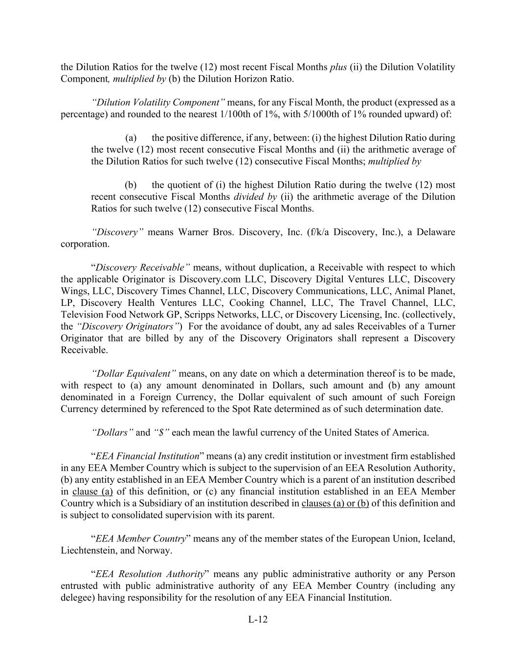 L-12 the Dilution Ratios for the twelve (12) most recent Fiscal Months plus (ii) the Dilution Volatility Component, multiplied by (b) the Dilution Horizon Ratio. “Dilution Volatility Component” means, for any Fiscal Month, the product (expressed as a percentage) and rounded to the nearest 1/100th of 1%, with 5/1000th of 1% rounded upward) of: (a) the positive difference, if any, between: (i) the highest Dilution Ratio during the twelve (12) most recent consecutive Fiscal Months and (ii) the arithmetic average of the Dilution Ratios for such twelve (12) consecutive Fiscal Months; multiplied by (b) the quotient of (i) the highest Dilution Ratio during the twelve (12) most recent consecutive Fiscal Months divided by (ii) the arithmetic average of the Dilution Ratios for such twelve (12) consecutive Fiscal Months. “Discovery” means Warner Bros. Discovery, Inc. (f/k/a Discovery, Inc.), a Delaware corporation. “Discovery Receivable” means, without duplication, a Receivable with respect to which the applicable Originator is Discovery.com LLC, Discovery Digital Ventures LLC, Discovery Wings, LLC, Discovery Times Channel, LLC, Discovery Communications, LLC, Animal Planet, LP, Discovery Health Ventures LLC, Cooking Channel, LLC, The Travel Channel, LLC, Television Food Network GP, Scripps Networks, LLC, or Discovery Licensing, Inc. (collectively, the “Discovery Originators”) For the avoidance of doubt, any ad sales Receivables of a Turner Originator that are billed by any of the Discovery Originators shall represent a Discovery Receivable. “Dollar Equivalent” means, on any date on which a determination thereof is to be made, with respect to (a) any amount denominated in Dollars, such amount and (b) any amount denominated in a Foreign Currency, the Dollar equivalent of such amount of such Foreign Currency determined by referenced to the Spot Rate determined as of such determination date. “Dollars” and “$” each mean the lawful currency of the United States of America. “EEA Financial Institution” means (a) any credit institution or investment firm established in any EEA Member Country which is subject to the supervision of an EEA Resolution Authority, (b) any entity established in an EEA Member Country which is a parent of an institution described in clause (a) of this definition, or (c) any financial institution established in an EEA Member Country which is a Subsidiary of an institution described in clauses (a) or (b) of this definition and is subject to consolidated supervision with its parent. “EEA Member Country” means any of the member states of the European Union, Iceland, Liechtenstein, and Norway. “EEA Resolution Authority” means any public administrative authority or any Person entrusted with public administrative authority of any EEA Member Country (including any delegee) having responsibility for the resolution of any EEA Financial Institution.