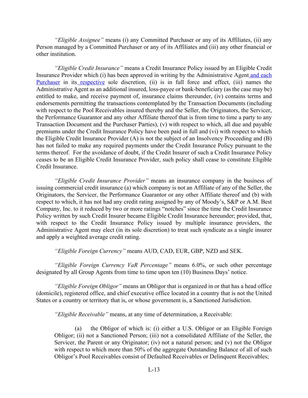 L-13 “Eligible Assignee” means (i) any Committed Purchaser or any of its Affiliates, (ii) any Person managed by a Committed Purchaser or any of its Affiliates and (iii) any other financial or other institution. “Eligible Credit Insurance” means a Credit Insurance Policy issued by an Eligible Credit Insurance Provider which (i) has been approved in writing by the Administrative Agent and each Purchaser in its respective sole discretion, (ii) is in full force and effect, (iii) names the Administrative Agent as an additional insured, loss-payee or bank-beneficiary (as the case may be) entitled to make, and receive payment of, insurance claims thereunder, (iv) contains terms and endorsements permitting the transactions contemplated by the Transaction Documents (including with respect to the Pool Receivables insured thereby and the Seller, the Originators, the Servicer, the Performance Guarantor and any other Affiliate thereof that is from time to time a party to any Transaction Document and the Purchaser Parties), (v) with respect to which, all due and payable premiums under the Credit Insurance Policy have been paid in full and (vi) with respect to which the Eligible Credit Insurance Provider (A) is not the subject of an Insolvency Proceeding and (B) has not failed to make any required payments under the Credit Insurance Policy pursuant to the terms thereof. For the avoidance of doubt, if the Credit Insurer of such a Credit Insurance Policy ceases to be an Eligible Credit Insurance Provider, such policy shall cease to constitute Eligible Credit Insurance. “Eligible Credit Insurance Provider” means an insurance company in the business of issuing commercial credit insurance (a) which company is not an Affiliate of any of the Seller, the Originators, the Servicer, the Performance Guarantor or any other Affiliate thereof and (b) with respect to which, it has not had any credit rating assigned by any of Moody’s, S&P or A.M. Best Company, Inc. to it reduced by two or more ratings “notches” since the time the Credit Insurance Policy written by such Credit Insurer became Eligible Credit Insurance hereunder; provided, that, with respect to the Credit Insurance Policy issued by multiple insurance providers, the Administrative Agent may elect (in its sole discretion) to treat such syndicate as a single insurer and apply a weighted average credit rating. “Eligible Foreign Currency” means AUD, CAD, EUR, GBP, NZD and SEK. “Eligible Foreign Currency VaR Percentage” means 6.0%, or such other percentage designated by all Group Agents from time to time upon ten (10) Business Days’ notice. “Eligible Foreign Obligor” means an Obligor that is organized in or that has a head office (domicile), registered office, and chief executive office located in a country that is not the United States or a country or territory that is, or whose government is, a Sanctioned Jurisdiction. “Eligible Receivable” means, at any time of determination, a Receivable: (a) the Obligor of which is: (i) either a U.S. Obligor or an Eligible Foreign Obligor; (ii) not a Sanctioned Person; (iii) not a consolidated Affiliate of the Seller, the Servicer, the Parent or any Originator; (iv) not a natural person; and (v) not the Obligor with respect to which more than 50% of the aggregate Outstanding Balance of all of such Obligor’s Pool Receivables consist of Defaulted Receivables or Delinquent Receivables;