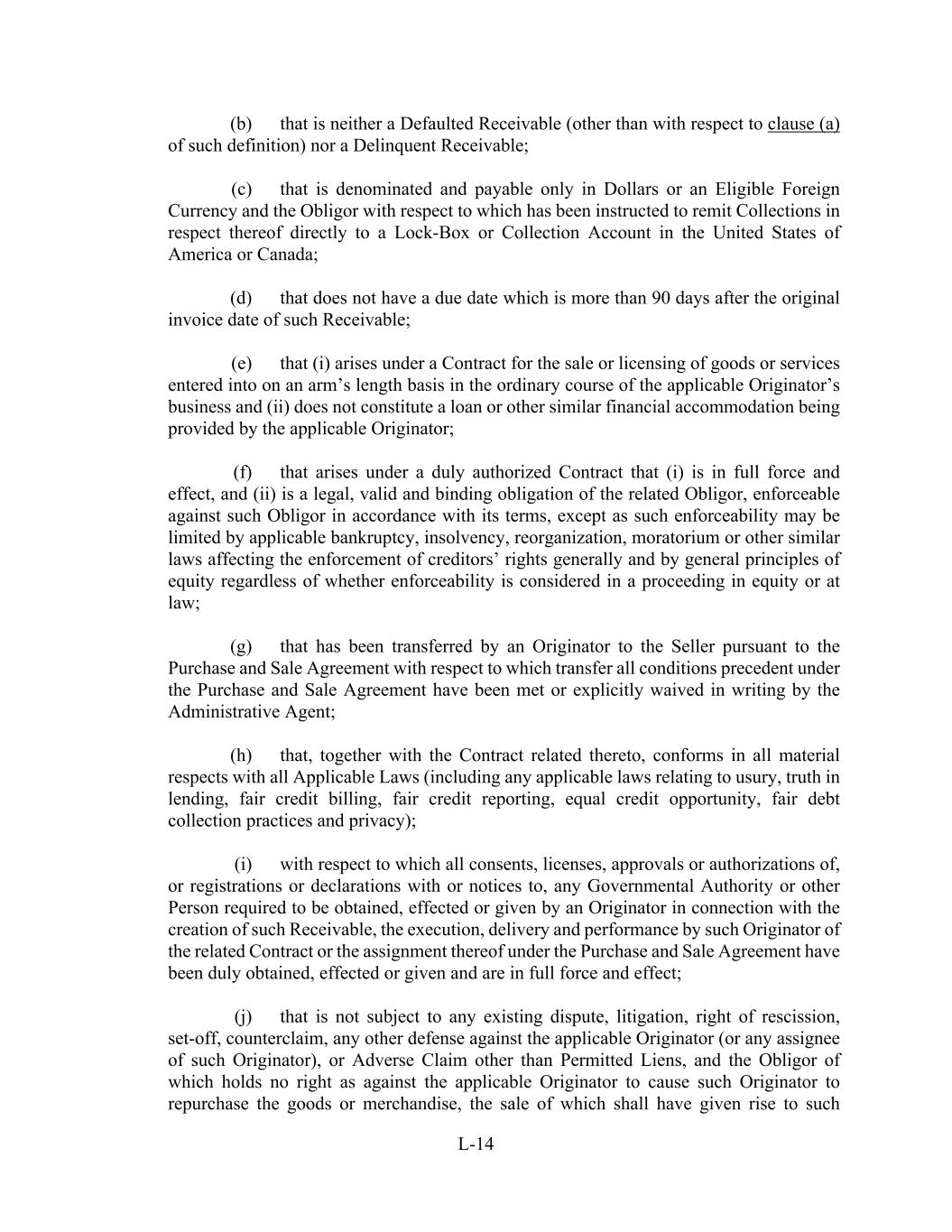 L-14 (b) that is neither a Defaulted Receivable (other than with respect to clause (a) of such definition) nor a Delinquent Receivable; (c) that is denominated and payable only in Dollars or an Eligible Foreign Currency and the Obligor with respect to which has been instructed to remit Collections in respect thereof directly to a Lock-Box or Collection Account in the United States of America or Canada; (d) that does not have a due date which is more than 90 days after the original invoice date of such Receivable; (e) that (i) arises under a Contract for the sale or licensing of goods or services entered into on an arm’s length basis in the ordinary course of the applicable Originator’s business and (ii) does not constitute a loan or other similar financial accommodation being provided by the applicable Originator; (f) that arises under a duly authorized Contract that (i) is in full force and effect, and (ii) is a legal, valid and binding obligation of the related Obligor, enforceable against such Obligor in accordance with its terms, except as such enforceability may be limited by applicable bankruptcy, insolvency, reorganization, moratorium or other similar laws affecting the enforcement of creditors’ rights generally and by general principles of equity regardless of whether enforceability is considered in a proceeding in equity or at law; (g) that has been transferred by an Originator to the Seller pursuant to the Purchase and Sale Agreement with respect to which transfer all conditions precedent under the Purchase and Sale Agreement have been met or explicitly waived in writing by the Administrative Agent; (h) that, together with the Contract related thereto, conforms in all material respects with all Applicable Laws (including any applicable laws relating to usury, truth in lending, fair credit billing, fair credit reporting, equal credit opportunity, fair debt collection practices and privacy); (i) with respect to which all consents, licenses, approvals or authorizations of, or registrations or declarations with or notices to, any Governmental Authority or other Person required to be obtained, effected or given by an Originator in connection with the creation of such Receivable, the execution, delivery and performance by such Originator of the related Contract or the assignment thereof under the Purchase and Sale Agreement have been duly obtained, effected or given and are in full force and effect; (j) that is not subject to any existing dispute, litigation, right of rescission, set-off, counterclaim, any other defense against the applicable Originator (or any assignee of such Originator), or Adverse Claim other than Permitted Liens, and the Obligor of which holds no right as against the applicable Originator to cause such Originator to repurchase the goods or merchandise, the sale of which shall have given rise to such
