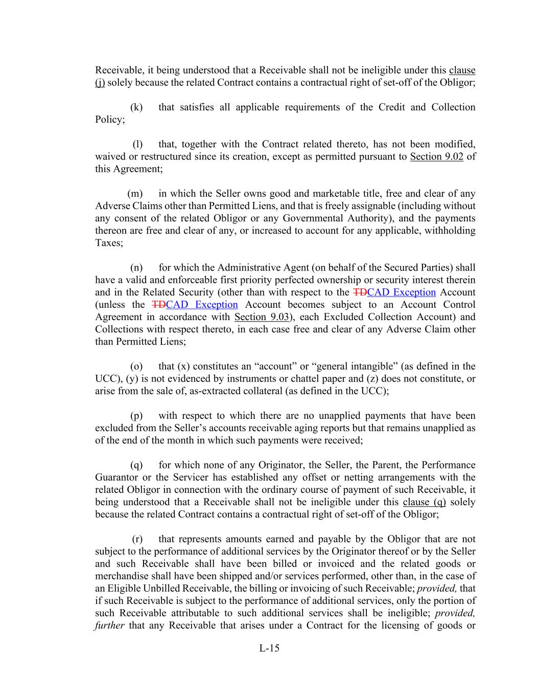 L-15 Receivable, it being understood that a Receivable shall not be ineligible under this clause (j) solely because the related Contract contains a contractual right of set-off of the Obligor; (k) that satisfies all applicable requirements of the Credit and Collection Policy; (l) that, together with the Contract related thereto, has not been modified, waived or restructured since its creation, except as permitted pursuant to Section 9.02 of this Agreement; (m) in which the Seller owns good and marketable title, free and clear of any Adverse Claims other than Permitted Liens, and that is freely assignable (including without any consent of the related Obligor or any Governmental Authority), and the payments thereon are free and clear of any, or increased to account for any applicable, withholding Taxes; (n) for which the Administrative Agent (on behalf of the Secured Parties) shall have a valid and enforceable first priority perfected ownership or security interest therein and in the Related Security (other than with respect to the TDCAD Exception Account (unless the TDCAD Exception Account becomes subject to an Account Control Agreement in accordance with Section 9.03), each Excluded Collection Account) and Collections with respect thereto, in each case free and clear of any Adverse Claim other than Permitted Liens; (o) that (x) constitutes an “account” or “general intangible” (as defined in the UCC), (y) is not evidenced by instruments or chattel paper and (z) does not constitute, or arise from the sale of, as-extracted collateral (as defined in the UCC); (p) with respect to which there are no unapplied payments that have been excluded from the Seller’s accounts receivable aging reports but that remains unapplied as of the end of the month in which such payments were received; (q) for which none of any Originator, the Seller, the Parent, the Performance Guarantor or the Servicer has established any offset or netting arrangements with the related Obligor in connection with the ordinary course of payment of such Receivable, it being understood that a Receivable shall not be ineligible under this clause (q) solely because the related Contract contains a contractual right of set-off of the Obligor; (r) that represents amounts earned and payable by the Obligor that are not subject to the performance of additional services by the Originator thereof or by the Seller and such Receivable shall have been billed or invoiced and the related goods or merchandise shall have been shipped and/or services performed, other than, in the case of an Eligible Unbilled Receivable, the billing or invoicing of such Receivable; provided, that if such Receivable is subject to the performance of additional services, only the portion of such Receivable attributable to such additional services shall be ineligible; provided, further that any Receivable that arises under a Contract for the licensing of goods or