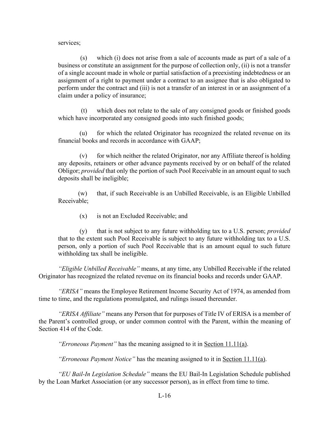L-16 services; (s) which (i) does not arise from a sale of accounts made as part of a sale of a business or constitute an assignment for the purpose of collection only, (ii) is not a transfer of a single account made in whole or partial satisfaction of a preexisting indebtedness or an assignment of a right to payment under a contract to an assignee that is also obligated to perform under the contract and (iii) is not a transfer of an interest in or an assignment of a claim under a policy of insurance; (t) which does not relate to the sale of any consigned goods or finished goods which have incorporated any consigned goods into such finished goods; (u) for which the related Originator has recognized the related revenue on its financial books and records in accordance with GAAP; (v) for which neither the related Originator, nor any Affiliate thereof is holding any deposits, retainers or other advance payments received by or on behalf of the related Obligor; provided that only the portion of such Pool Receivable in an amount equal to such deposits shall be ineligible; (w) that, if such Receivable is an Unbilled Receivable, is an Eligible Unbilled Receivable; (x) is not an Excluded Receivable; and (y) that is not subject to any future withholding tax to a U.S. person; provided that to the extent such Pool Receivable is subject to any future withholding tax to a U.S. person, only a portion of such Pool Receivable that is an amount equal to such future withholding tax shall be ineligible. “Eligible Unbilled Receivable” means, at any time, any Unbilled Receivable if the related Originator has recognized the related revenue on its financial books and records under GAAP. “ERISA” means the Employee Retirement Income Security Act of 1974, as amended from time to time, and the regulations promulgated, and rulings issued thereunder. “ERISA Affiliate” means any Person that for purposes of Title IV of ERISA is a member of the Parent’s controlled group, or under common control with the Parent, within the meaning of Section 414 of the Code. “Erroneous Payment” has the meaning assigned to it in Section 11.11(a). “Erroneous Payment Notice” has the meaning assigned to it in Section 11.11(a). “EU Bail-In Legislation Schedule” means the EU Bail-In Legislation Schedule published by the Loan Market Association (or any successor person), as in effect from time to time.