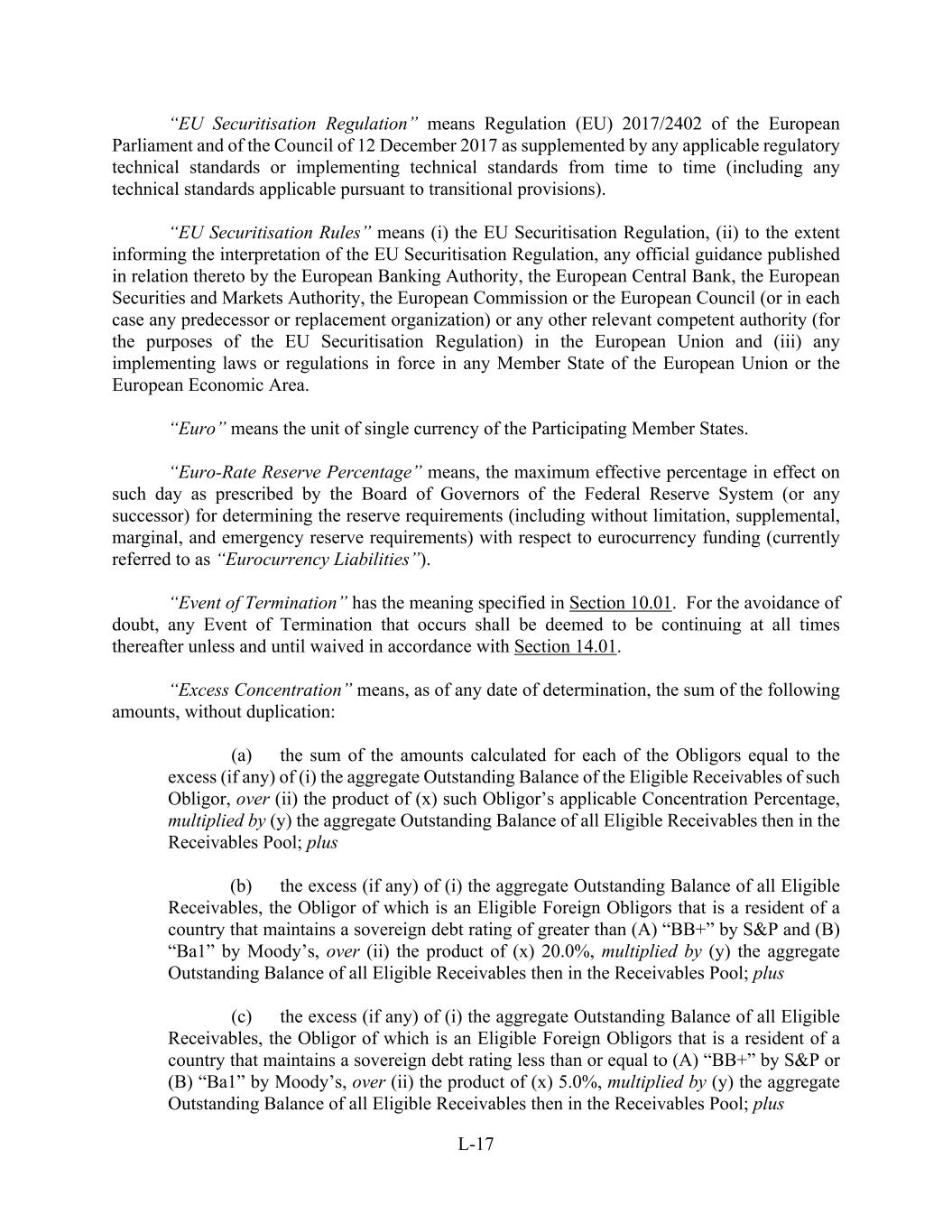L-17 “EU Securitisation Regulation” means Regulation (EU) 2017/2402 of the European Parliament and of the Council of 12 December 2017 as supplemented by any applicable regulatory technical standards or implementing technical standards from time to time (including any technical standards applicable pursuant to transitional provisions). “EU Securitisation Rules” means (i) the EU Securitisation Regulation, (ii) to the extent informing the interpretation of the EU Securitisation Regulation, any official guidance published in relation thereto by the European Banking Authority, the European Central Bank, the European Securities and Markets Authority, the European Commission or the European Council (or in each case any predecessor or replacement organization) or any other relevant competent authority (for the purposes of the EU Securitisation Regulation) in the European Union and (iii) any implementing laws or regulations in force in any Member State of the European Union or the European Economic Area. “Euro” means the unit of single currency of the Participating Member States. “Euro-Rate Reserve Percentage” means, the maximum effective percentage in effect on such day as prescribed by the Board of Governors of the Federal Reserve System (or any successor) for determining the reserve requirements (including without limitation, supplemental, marginal, and emergency reserve requirements) with respect to eurocurrency funding (currently referred to as “Eurocurrency Liabilities”). “Event of Termination” has the meaning specified in Section 10.01. For the avoidance of doubt, any Event of Termination that occurs shall be deemed to be continuing at all times thereafter unless and until waived in accordance with Section 14.01. “Excess Concentration” means, as of any date of determination, the sum of the following amounts, without duplication: (a) the sum of the amounts calculated for each of the Obligors equal to the excess (if any) of (i) the aggregate Outstanding Balance of the Eligible Receivables of such Obligor, over (ii) the product of (x) such Obligor’s applicable Concentration Percentage, multiplied by (y) the aggregate Outstanding Balance of all Eligible Receivables then in the Receivables Pool; plus (b) the excess (if any) of (i) the aggregate Outstanding Balance of all Eligible Receivables, the Obligor of which is an Eligible Foreign Obligors that is a resident of a country that maintains a sovereign debt rating of greater than (A) “BB+” by S&P and (B) “Ba1” by Moody’s, over (ii) the product of (x) 20.0%, multiplied by (y) the aggregate Outstanding Balance of all Eligible Receivables then in the Receivables Pool; plus (c) the excess (if any) of (i) the aggregate Outstanding Balance of all Eligible Receivables, the Obligor of which is an Eligible Foreign Obligors that is a resident of a country that maintains a sovereign debt rating less than or equal to (A) “BB+” by S&P or (B) “Ba1” by Moody’s, over (ii) the product of (x) 5.0%, multiplied by (y) the aggregate Outstanding Balance of all Eligible Receivables then in the Receivables Pool; plus