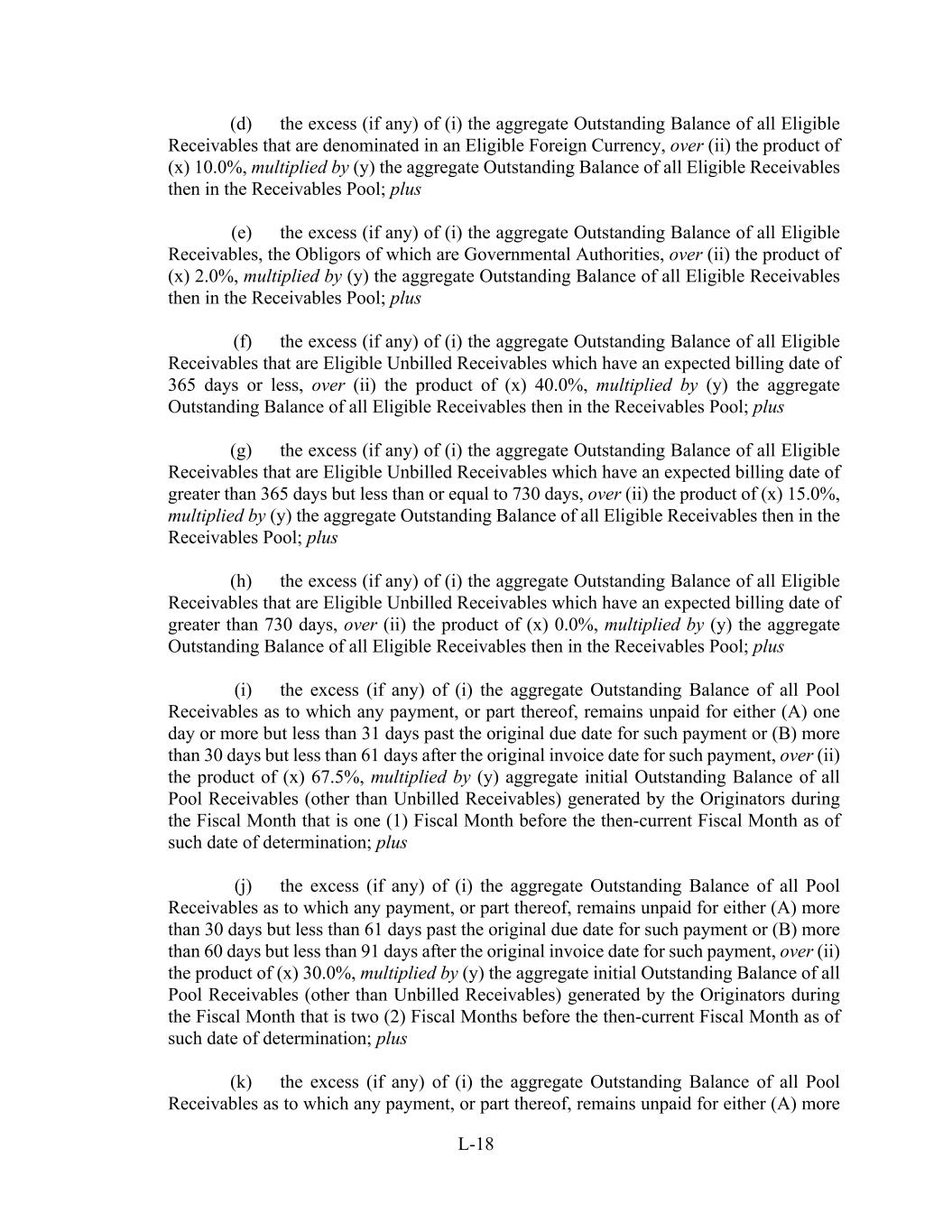L-18 (d) the excess (if any) of (i) the aggregate Outstanding Balance of all Eligible Receivables that are denominated in an Eligible Foreign Currency, over (ii) the product of (x) 10.0%, multiplied by (y) the aggregate Outstanding Balance of all Eligible Receivables then in the Receivables Pool; plus (e) the excess (if any) of (i) the aggregate Outstanding Balance of all Eligible Receivables, the Obligors of which are Governmental Authorities, over (ii) the product of (x) 2.0%, multiplied by (y) the aggregate Outstanding Balance of all Eligible Receivables then in the Receivables Pool; plus (f) the excess (if any) of (i) the aggregate Outstanding Balance of all Eligible Receivables that are Eligible Unbilled Receivables which have an expected billing date of 365 days or less, over (ii) the product of (x) 40.0%, multiplied by (y) the aggregate Outstanding Balance of all Eligible Receivables then in the Receivables Pool; plus (g) the excess (if any) of (i) the aggregate Outstanding Balance of all Eligible Receivables that are Eligible Unbilled Receivables which have an expected billing date of greater than 365 days but less than or equal to 730 days, over (ii) the product of (x) 15.0%, multiplied by (y) the aggregate Outstanding Balance of all Eligible Receivables then in the Receivables Pool; plus (h) the excess (if any) of (i) the aggregate Outstanding Balance of all Eligible Receivables that are Eligible Unbilled Receivables which have an expected billing date of greater than 730 days, over (ii) the product of (x) 0.0%, multiplied by (y) the aggregate Outstanding Balance of all Eligible Receivables then in the Receivables Pool; plus (i) the excess (if any) of (i) the aggregate Outstanding Balance of all Pool Receivables as to which any payment, or part thereof, remains unpaid for either (A) one day or more but less than 31 days past the original due date for such payment or (B) more than 30 days but less than 61 days after the original invoice date for such payment, over (ii) the product of (x) 67.5%, multiplied by (y) aggregate initial Outstanding Balance of all Pool Receivables (other than Unbilled Receivables) generated by the Originators during the Fiscal Month that is one (1) Fiscal Month before the then-current Fiscal Month as of such date of determination; plus (j) the excess (if any) of (i) the aggregate Outstanding Balance of all Pool Receivables as to which any payment, or part thereof, remains unpaid for either (A) more than 30 days but less than 61 days past the original due date for such payment or (B) more than 60 days but less than 91 days after the original invoice date for such payment, over (ii) the product of (x) 30.0%, multiplied by (y) the aggregate initial Outstanding Balance of all Pool Receivables (other than Unbilled Receivables) generated by the Originators during the Fiscal Month that is two (2) Fiscal Months before the then-current Fiscal Month as of such date of determination; plus (k) the excess (if any) of (i) the aggregate Outstanding Balance of all Pool Receivables as to which any payment, or part thereof, remains unpaid for either (A) more