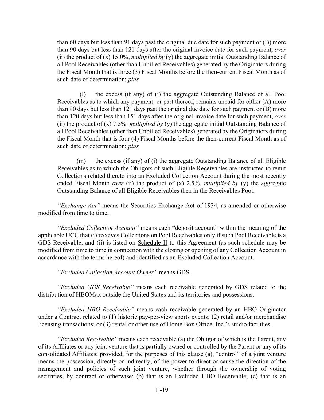 L-19 than 60 days but less than 91 days past the original due date for such payment or (B) more than 90 days but less than 121 days after the original invoice date for such payment, over (ii) the product of (x) 15.0%, multiplied by (y) the aggregate initial Outstanding Balance of all Pool Receivables (other than Unbilled Receivables) generated by the Originators during the Fiscal Month that is three (3) Fiscal Months before the then-current Fiscal Month as of such date of determination; plus (l) the excess (if any) of (i) the aggregate Outstanding Balance of all Pool Receivables as to which any payment, or part thereof, remains unpaid for either (A) more than 90 days but less than 121 days past the original due date for such payment or (B) more than 120 days but less than 151 days after the original invoice date for such payment, over (ii) the product of (x) 7.5%, multiplied by (y) the aggregate initial Outstanding Balance of all Pool Receivables (other than Unbilled Receivables) generated by the Originators during the Fiscal Month that is four (4) Fiscal Months before the then-current Fiscal Month as of such date of determination; plus (m) the excess (if any) of (i) the aggregate Outstanding Balance of all Eligible Receivables as to which the Obligors of such Eligible Receivables are instructed to remit Collections related thereto into an Excluded Collection Account during the most recently ended Fiscal Month over (ii) the product of (x) 2.5%, multiplied by (y) the aggregate Outstanding Balance of all Eligible Receivables then in the Receivables Pool. “Exchange Act” means the Securities Exchange Act of 1934, as amended or otherwise modified from time to time. “Excluded Collection Account” means each “deposit account” within the meaning of the applicable UCC that (i) receives Collections on Pool Receivables only if such Pool Receivable is a GDS Receivable, and (ii) is listed on Schedule II to this Agreement (as such schedule may be modified from time to time in connection with the closing or opening of any Collection Account in accordance with the terms hereof) and identified as an Excluded Collection Account. “Excluded Collection Account Owner” means GDS. “Excluded GDS Receivable” means each receivable generated by GDS related to the distribution of HBOMax outside the United States and its territories and possessions. “Excluded HBO Receivable” means each receivable generated by an HBO Originator under a Contract related to (1) historic pay-per-view sports events; (2) retail and/or merchandise licensing transactions; or (3) rental or other use of Home Box Office, Inc.’s studio facilities. “Excluded Receivable” means each receivable (a) the Obligor of which is the Parent, any of its Affiliates or any joint venture that is partially owned or controlled by the Parent or any of its consolidated Affiliates; provided, for the purposes of this clause (a), “control” of a joint venture means the possession, directly or indirectly, of the power to direct or cause the direction of the management and policies of such joint venture, whether through the ownership of voting securities, by contract or otherwise; (b) that is an Excluded HBO Receivable; (c) that is an