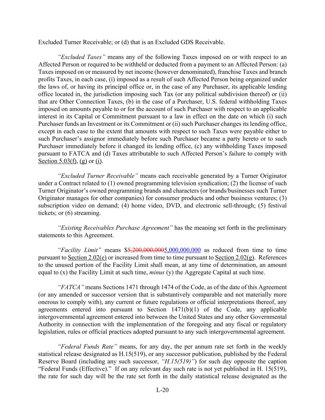 L-20 Excluded Turner Receivable; or (d) that is an Excluded GDS Receivable. “Excluded Taxes” means any of the following Taxes imposed on or with respect to an Affected Person or required to be withheld or deducted from a payment to an Affected Person: (a) Taxes imposed on or measured by net income (however denominated), franchise Taxes and branch profits Taxes, in each case, (i) imposed as a result of such Affected Person being organized under the laws of, or having its principal office or, in the case of any Purchaser, its applicable lending office located in, the jurisdiction imposing such Tax (or any political subdivision thereof) or (ii) that are Other Connection Taxes, (b) in the case of a Purchaser, U.S. federal withholding Taxes imposed on amounts payable to or for the account of such Purchaser with respect to an applicable interest in its Capital or Commitment pursuant to a law in effect on the date on which (i) such Purchaser funds an Investment or its Commitment or (ii) such Purchaser changes its lending office, except in each case to the extent that amounts with respect to such Taxes were payable either to such Purchaser’s assignor immediately before such Purchaser became a party hereto or to such Purchaser immediately before it changed its lending office, (c) any withholding Taxes imposed pursuant to FATCA and (d) Taxes attributable to such Affected Person’s failure to comply with Section 5.03(f), (g) or (i). “Excluded Turner Receivable” means each receivable generated by a Turner Originator under a Contract related to (1) owned programming television syndication; (2) the license of such Turner Originator’s owned programming brands and characters (or brands/businesses such Turner Originator manages for other companies) for consumer products and other business ventures; (3) subscription video on demand; (4) home video, DVD, and electronic sell-through; (5) festival tickets; or (6) streaming. “Existing Receivables Purchase Agreement” has the meaning set forth in the preliminary statements to this Agreement. “Facility Limit” means $5,200,000,0005,000,000,000 as reduced from time to time pursuant to Section 2.02(e) or increased from time to time pursuant to Section 2.02(g). References to the unused portion of the Facility Limit shall mean, at any time of determination, an amount equal to (x) the Facility Limit at such time, minus (y) the Aggregate Capital at such time. “FATCA” means Sections 1471 through 1474 of the Code, as of the date of this Agreement (or any amended or successor version that is substantively comparable and not materially more onerous to comply with), any current or future regulations or official interpretations thereof, any agreements entered into pursuant to Section 1471(b)(1) of the Code, any applicable intergovernmental agreement entered into between the United States and any other Governmental Authority in connection with the implementation of the foregoing and any fiscal or regulatory legislation, rules or official practices adopted pursuant to any such intergovernmental agreement. “Federal Funds Rate” means, for any day, the per annum rate set forth in the weekly statistical release designated as H.15(519), or any successor publication, published by the Federal Reserve Board (including any such successor, “H.15(519)”) for such day opposite the caption “Federal Funds (Effective).” If on any relevant day such rate is not yet published in H. 15(519), the rate for such day will be the rate set forth in the daily statistical release designated as the