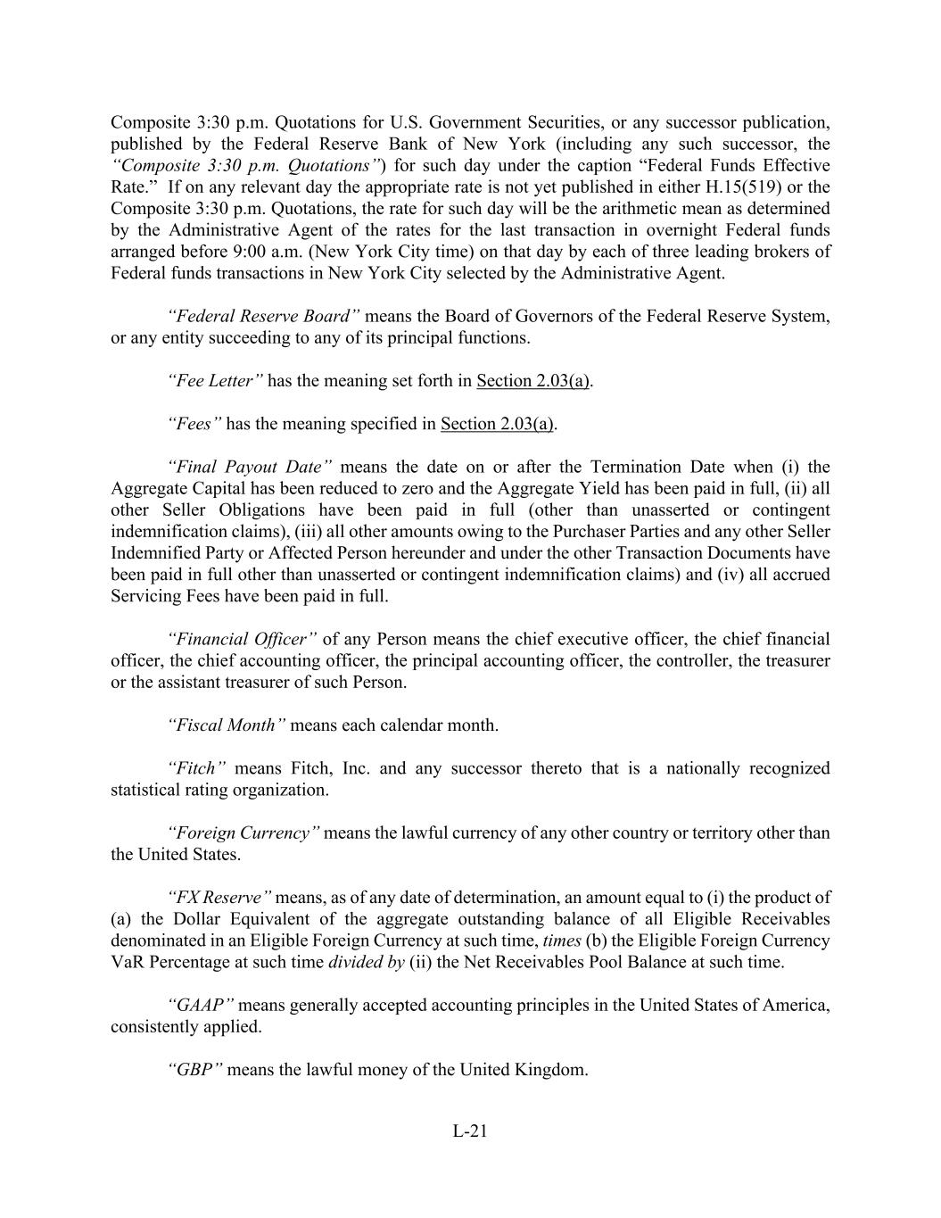 L-21 Composite 3:30 p.m. Quotations for U.S. Government Securities, or any successor publication, published by the Federal Reserve Bank of New York (including any such successor, the “Composite 3:30 p.m. Quotations”) for such day under the caption “Federal Funds Effective Rate.” If on any relevant day the appropriate rate is not yet published in either H.15(519) or the Composite 3:30 p.m. Quotations, the rate for such day will be the arithmetic mean as determined by the Administrative Agent of the rates for the last transaction in overnight Federal funds arranged before 9:00 a.m. (New York City time) on that day by each of three leading brokers of Federal funds transactions in New York City selected by the Administrative Agent. “Federal Reserve Board” means the Board of Governors of the Federal Reserve System, or any entity succeeding to any of its principal functions. “Fee Letter” has the meaning set forth in Section 2.03(a). “Fees” has the meaning specified in Section 2.03(a). “Final Payout Date” means the date on or after the Termination Date when (i) the Aggregate Capital has been reduced to zero and the Aggregate Yield has been paid in full, (ii) all other Seller Obligations have been paid in full (other than unasserted or contingent indemnification claims), (iii) all other amounts owing to the Purchaser Parties and any other Seller Indemnified Party or Affected Person hereunder and under the other Transaction Documents have been paid in full other than unasserted or contingent indemnification claims) and (iv) all accrued Servicing Fees have been paid in full. “Financial Officer” of any Person means the chief executive officer, the chief financial officer, the chief accounting officer, the principal accounting officer, the controller, the treasurer or the assistant treasurer of such Person. “Fiscal Month” means each calendar month. “Fitch” means Fitch, Inc. and any successor thereto that is a nationally recognized statistical rating organization. “Foreign Currency” means the lawful currency of any other country or territory other than the United States. “FX Reserve” means, as of any date of determination, an amount equal to (i) the product of (a) the Dollar Equivalent of the aggregate outstanding balance of all Eligible Receivables denominated in an Eligible Foreign Currency at such time, times (b) the Eligible Foreign Currency VaR Percentage at such time divided by (ii) the Net Receivables Pool Balance at such time. “GAAP” means generally accepted accounting principles in the United States of America, consistently applied. “GBP” means the lawful money of the United Kingdom.