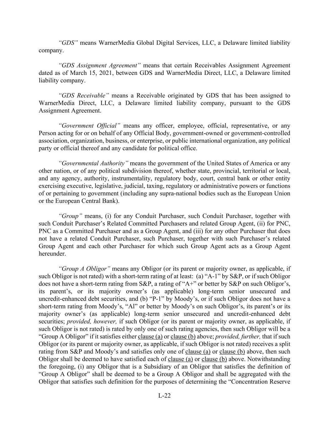L-22 “GDS” means WarnerMedia Global Digital Services, LLC, a Delaware limited liability company. “GDS Assignment Agreement” means that certain Receivables Assignment Agreement dated as of March 15, 2021, between GDS and WarnerMedia Direct, LLC, a Delaware limited liability company. “GDS Receivable” means a Receivable originated by GDS that has been assigned to WarnerMedia Direct, LLC, a Delaware limited liability company, pursuant to the GDS Assignment Agreement. “Government Official” means any officer, employee, official, representative, or any Person acting for or on behalf of any Official Body, government-owned or government-controlled association, organization, business, or enterprise, or public international organization, any political party or official thereof and any candidate for political office. “Governmental Authority” means the government of the United States of America or any other nation, or of any political subdivision thereof, whether state, provincial, territorial or local, and any agency, authority, instrumentality, regulatory body, court, central bank or other entity exercising executive, legislative, judicial, taxing, regulatory or administrative powers or functions of or pertaining to government (including any supra-national bodies such as the European Union or the European Central Bank). “Group” means, (i) for any Conduit Purchaser, such Conduit Purchaser, together with such Conduit Purchaser’s Related Committed Purchasers and related Group Agent, (ii) for PNC, PNC as a Committed Purchaser and as a Group Agent, and (iii) for any other Purchaser that does not have a related Conduit Purchaser, such Purchaser, together with such Purchaser’s related Group Agent and each other Purchaser for which such Group Agent acts as a Group Agent hereunder. “Group A Obligor” means any Obligor (or its parent or majority owner, as applicable, if such Obligor is not rated) with a short-term rating of at least: (a) “A-1” by S&P, or if such Obligor does not have a short-term rating from S&P, a rating of “A+” or better by S&P on such Obligor’s, its parent’s, or its majority owner’s (as applicable) long-term senior unsecured and uncredit-enhanced debt securities, and (b) “P-1” by Moody’s, or if such Obligor does not have a short-term rating from Moody’s, “Al” or better by Moody’s on such Obligor’s, its parent’s or its majority owner’s (as applicable) long-term senior unsecured and uncredit-enhanced debt securities; provided, however, if such Obligor (or its parent or majority owner, as applicable, if such Obligor is not rated) is rated by only one of such rating agencies, then such Obligor will be a “Group A Obligor” if it satisfies either clause (a) or clause (b) above; provided, further, that if such Obligor (or its parent or majority owner, as applicable, if such Obligor is not rated) receives a split rating from S&P and Moody’s and satisfies only one of clause (a) or clause (b) above, then such Obligor shall be deemed to have satisfied each of clause (a) or clause (b) above. Notwithstanding the foregoing, (i) any Obligor that is a Subsidiary of an Obligor that satisfies the definition of “Group A Obligor” shall be deemed to be a Group A Obligor and shall be aggregated with the Obligor that satisfies such definition for the purposes of determining the “Concentration Reserve