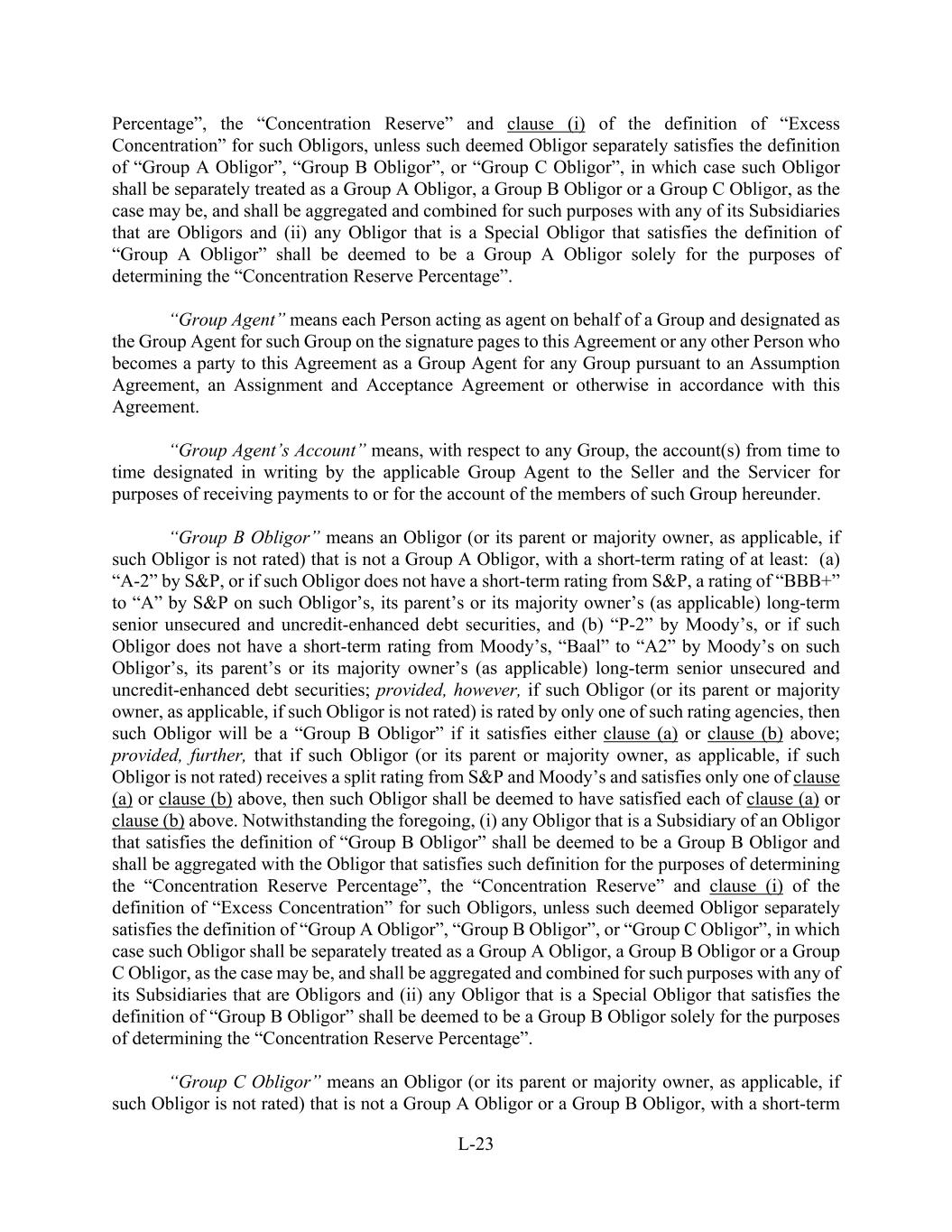 L-23 Percentage”, the “Concentration Reserve” and clause (i) of the definition of “Excess Concentration” for such Obligors, unless such deemed Obligor separately satisfies the definition of “Group A Obligor”, “Group B Obligor”, or “Group C Obligor”, in which case such Obligor shall be separately treated as a Group A Obligor, a Group B Obligor or a Group C Obligor, as the case may be, and shall be aggregated and combined for such purposes with any of its Subsidiaries that are Obligors and (ii) any Obligor that is a Special Obligor that satisfies the definition of “Group A Obligor” shall be deemed to be a Group A Obligor solely for the purposes of determining the “Concentration Reserve Percentage”. “Group Agent” means each Person acting as agent on behalf of a Group and designated as the Group Agent for such Group on the signature pages to this Agreement or any other Person who becomes a party to this Agreement as a Group Agent for any Group pursuant to an Assumption Agreement, an Assignment and Acceptance Agreement or otherwise in accordance with this Agreement. “Group Agent’s Account” means, with respect to any Group, the account(s) from time to time designated in writing by the applicable Group Agent to the Seller and the Servicer for purposes of receiving payments to or for the account of the members of such Group hereunder. “Group B Obligor” means an Obligor (or its parent or majority owner, as applicable, if such Obligor is not rated) that is not a Group A Obligor, with a short-term rating of at least: (a) “A-2” by S&P, or if such Obligor does not have a short-term rating from S&P, a rating of “BBB+” to “A” by S&P on such Obligor’s, its parent’s or its majority owner’s (as applicable) long-term senior unsecured and uncredit-enhanced debt securities, and (b) “P-2” by Moody’s, or if such Obligor does not have a short-term rating from Moody’s, “Baal” to “A2” by Moody’s on such Obligor’s, its parent’s or its majority owner’s (as applicable) long-term senior unsecured and uncredit-enhanced debt securities; provided, however, if such Obligor (or its parent or majority owner, as applicable, if such Obligor is not rated) is rated by only one of such rating agencies, then such Obligor will be a “Group B Obligor” if it satisfies either clause (a) or clause (b) above; provided, further, that if such Obligor (or its parent or majority owner, as applicable, if such Obligor is not rated) receives a split rating from S&P and Moody’s and satisfies only one of clause (a) or clause (b) above, then such Obligor shall be deemed to have satisfied each of clause (a) or clause (b) above. Notwithstanding the foregoing, (i) any Obligor that is a Subsidiary of an Obligor that satisfies the definition of “Group B Obligor” shall be deemed to be a Group B Obligor and shall be aggregated with the Obligor that satisfies such definition for the purposes of determining the “Concentration Reserve Percentage”, the “Concentration Reserve” and clause (i) of the definition of “Excess Concentration” for such Obligors, unless such deemed Obligor separately satisfies the definition of “Group A Obligor”, “Group B Obligor”, or “Group C Obligor”, in which case such Obligor shall be separately treated as a Group A Obligor, a Group B Obligor or a Group C Obligor, as the case may be, and shall be aggregated and combined for such purposes with any of its Subsidiaries that are Obligors and (ii) any Obligor that is a Special Obligor that satisfies the definition of “Group B Obligor” shall be deemed to be a Group B Obligor solely for the purposes of determining the “Concentration Reserve Percentage”. “Group C Obligor” means an Obligor (or its parent or majority owner, as applicable, if such Obligor is not rated) that is not a Group A Obligor or a Group B Obligor, with a short-term