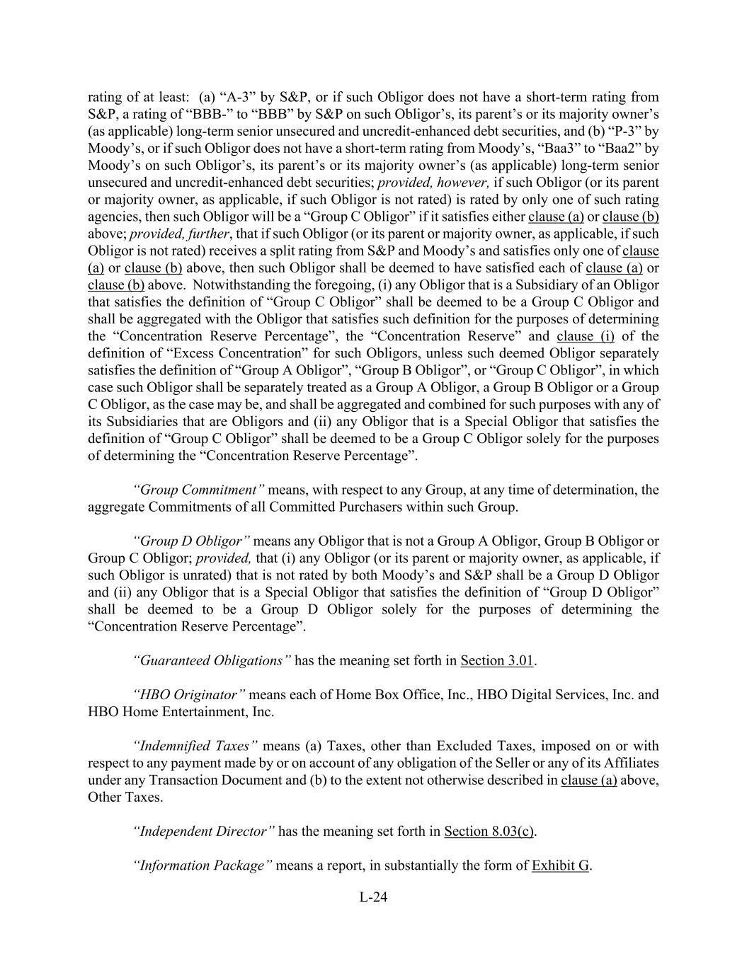 L-24 rating of at least: (a) “A-3” by S&P, or if such Obligor does not have a short-term rating from S&P, a rating of “BBB-” to “BBB” by S&P on such Obligor’s, its parent’s or its majority owner’s (as applicable) long-term senior unsecured and uncredit-enhanced debt securities, and (b) “P-3” by Moody’s, or if such Obligor does not have a short-term rating from Moody’s, “Baa3” to “Baa2” by Moody’s on such Obligor’s, its parent’s or its majority owner’s (as applicable) long-term senior unsecured and uncredit-enhanced debt securities; provided, however, if such Obligor (or its parent or majority owner, as applicable, if such Obligor is not rated) is rated by only one of such rating agencies, then such Obligor will be a “Group C Obligor” if it satisfies either clause (a) or clause (b) above; provided, further, that if such Obligor (or its parent or majority owner, as applicable, if such Obligor is not rated) receives a split rating from S&P and Moody’s and satisfies only one of clause (a) or clause (b) above, then such Obligor shall be deemed to have satisfied each of clause (a) or clause (b) above. Notwithstanding the foregoing, (i) any Obligor that is a Subsidiary of an Obligor that satisfies the definition of “Group C Obligor” shall be deemed to be a Group C Obligor and shall be aggregated with the Obligor that satisfies such definition for the purposes of determining the “Concentration Reserve Percentage”, the “Concentration Reserve” and clause (i) of the definition of “Excess Concentration” for such Obligors, unless such deemed Obligor separately satisfies the definition of “Group A Obligor”, “Group B Obligor”, or “Group C Obligor”, in which case such Obligor shall be separately treated as a Group A Obligor, a Group B Obligor or a Group C Obligor, as the case may be, and shall be aggregated and combined for such purposes with any of its Subsidiaries that are Obligors and (ii) any Obligor that is a Special Obligor that satisfies the definition of “Group C Obligor” shall be deemed to be a Group C Obligor solely for the purposes of determining the “Concentration Reserve Percentage”. “Group Commitment” means, with respect to any Group, at any time of determination, the aggregate Commitments of all Committed Purchasers within such Group. “Group D Obligor” means any Obligor that is not a Group A Obligor, Group B Obligor or Group C Obligor; provided, that (i) any Obligor (or its parent or majority owner, as applicable, if such Obligor is unrated) that is not rated by both Moody’s and S&P shall be a Group D Obligor and (ii) any Obligor that is a Special Obligor that satisfies the definition of “Group D Obligor” shall be deemed to be a Group D Obligor solely for the purposes of determining the “Concentration Reserve Percentage”. “Guaranteed Obligations” has the meaning set forth in Section 3.01. “HBO Originator” means each of Home Box Office, Inc., HBO Digital Services, Inc. and HBO Home Entertainment, Inc. “Indemnified Taxes” means (a) Taxes, other than Excluded Taxes, imposed on or with respect to any payment made by or on account of any obligation of the Seller or any of its Affiliates under any Transaction Document and (b) to the extent not otherwise described in clause (a) above, Other Taxes. “Independent Director” has the meaning set forth in Section 8.03(c). “Information Package” means a report, in substantially the form of Exhibit G.