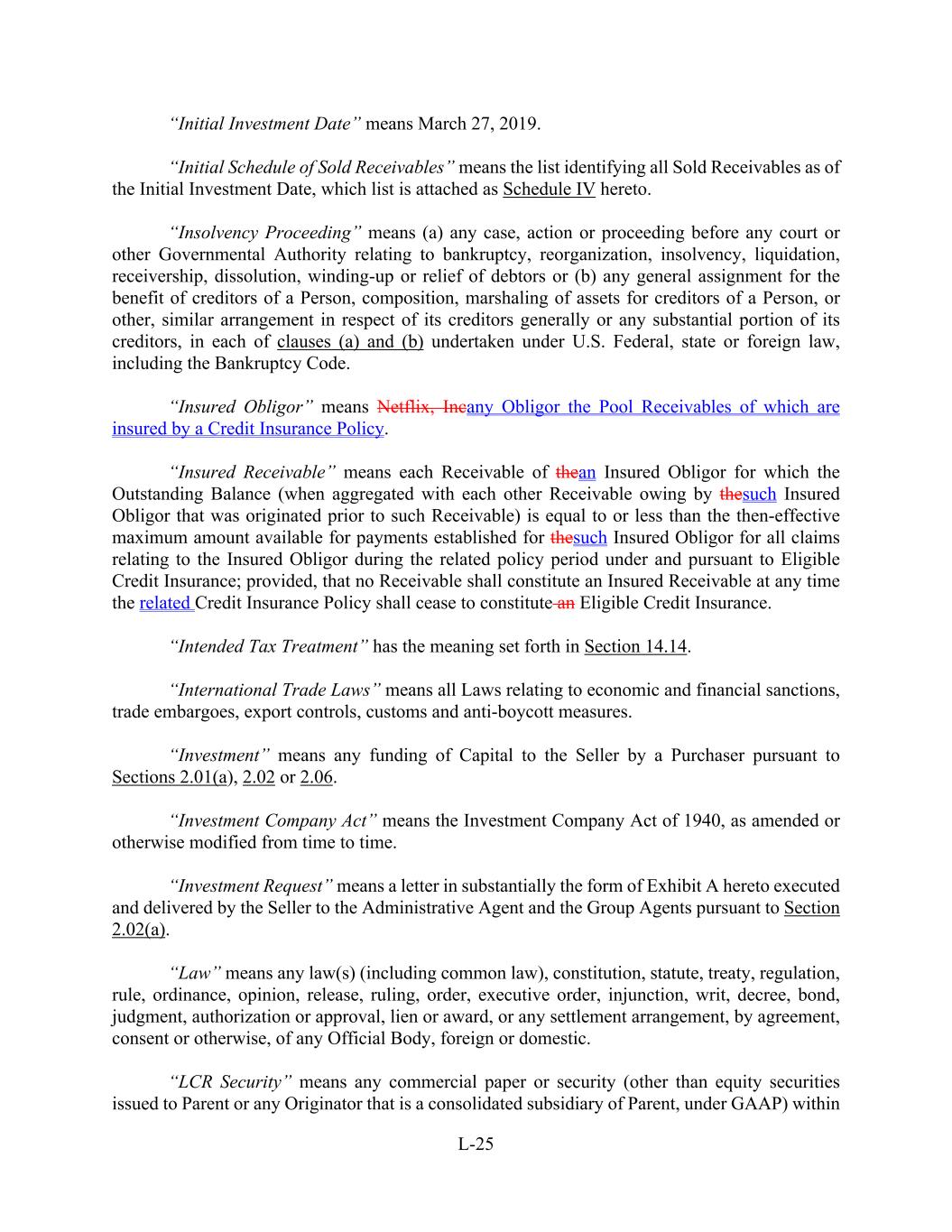 L-25 “Initial Investment Date” means March 27, 2019. “Initial Schedule of Sold Receivables” means the list identifying all Sold Receivables as of the Initial Investment Date, which list is attached as Schedule IV hereto. “Insolvency Proceeding” means (a) any case, action or proceeding before any court or other Governmental Authority relating to bankruptcy, reorganization, insolvency, liquidation, receivership, dissolution, winding-up or relief of debtors or (b) any general assignment for the benefit of creditors of a Person, composition, marshaling of assets for creditors of a Person, or other, similar arrangement in respect of its creditors generally or any substantial portion of its creditors, in each of clauses (a) and (b) undertaken under U.S. Federal, state or foreign law, including the Bankruptcy Code. “Insured Obligor” means Netflix, Incany Obligor the Pool Receivables of which are insured by a Credit Insurance Policy. “Insured Receivable” means each Receivable of thean Insured Obligor for which the Outstanding Balance (when aggregated with each other Receivable owing by thesuch Insured Obligor that was originated prior to such Receivable) is equal to or less than the then-effective maximum amount available for payments established for thesuch Insured Obligor for all claims relating to the Insured Obligor during the related policy period under and pursuant to Eligible Credit Insurance; provided, that no Receivable shall constitute an Insured Receivable at any time the related Credit Insurance Policy shall cease to constitute an Eligible Credit Insurance. “Intended Tax Treatment” has the meaning set forth in Section 14.14. “International Trade Laws” means all Laws relating to economic and financial sanctions, trade embargoes, export controls, customs and anti-boycott measures. “Investment” means any funding of Capital to the Seller by a Purchaser pursuant to Sections 2.01(a), 2.02 or 2.06. “Investment Company Act” means the Investment Company Act of 1940, as amended or otherwise modified from time to time. “Investment Request” means a letter in substantially the form of Exhibit A hereto executed and delivered by the Seller to the Administrative Agent and the Group Agents pursuant to Section 2.02(a). “Law” means any law(s) (including common law), constitution, statute, treaty, regulation, rule, ordinance, opinion, release, ruling, order, executive order, injunction, writ, decree, bond, judgment, authorization or approval, lien or award, or any settlement arrangement, by agreement, consent or otherwise, of any Official Body, foreign or domestic. “LCR Security” means any commercial paper or security (other than equity securities issued to Parent or any Originator that is a consolidated subsidiary of Parent, under GAAP) within