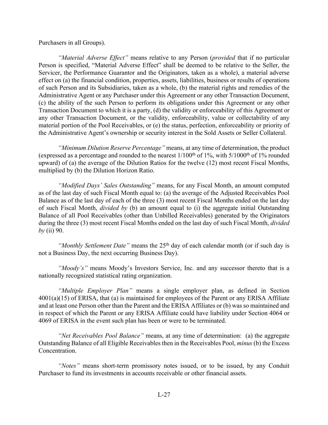 L-27 Purchasers in all Groups). “Material Adverse Effect” means relative to any Person (provided that if no particular Person is specified, “Material Adverse Effect” shall be deemed to be relative to the Seller, the Servicer, the Performance Guarantor and the Originators, taken as a whole), a material adverse effect on (a) the financial condition, properties, assets, liabilities, business or results of operations of such Person and its Subsidiaries, taken as a whole, (b) the material rights and remedies of the Administrative Agent or any Purchaser under this Agreement or any other Transaction Document, (c) the ability of the such Person to perform its obligations under this Agreement or any other Transaction Document to which it is a party, (d) the validity or enforceability of this Agreement or any other Transaction Document, or the validity, enforceability, value or collectability of any material portion of the Pool Receivables, or (e) the status, perfection, enforceability or priority of the Administrative Agent’s ownership or security interest in the Sold Assets or Seller Collateral. “Minimum Dilution Reserve Percentage” means, at any time of determination, the product (expressed as a percentage and rounded to the nearest 1/100th of 1%, with 5/1000th of 1% rounded upward) of (a) the average of the Dilution Ratios for the twelve (12) most recent Fiscal Months, multiplied by (b) the Dilution Horizon Ratio. “Modified Days’ Sales Outstanding” means, for any Fiscal Month, an amount computed as of the last day of such Fiscal Month equal to: (a) the average of the Adjusted Receivables Pool Balance as of the last day of each of the three (3) most recent Fiscal Months ended on the last day of such Fiscal Month, divided by (b) an amount equal to (i) the aggregate initial Outstanding Balance of all Pool Receivables (other than Unbilled Receivables) generated by the Originators during the three (3) most recent Fiscal Months ended on the last day of such Fiscal Month, divided by (ii) 90. “Monthly Settlement Date” means the 25th day of each calendar month (or if such day is not a Business Day, the next occurring Business Day). “Moody’s” means Moody’s Investors Service, Inc. and any successor thereto that is a nationally recognized statistical rating organization. “Multiple Employer Plan” means a single employer plan, as defined in Section 4001(a)(15) of ERISA, that (a) is maintained for employees of the Parent or any ERISA Affiliate and at least one Person other than the Parent and the ERISA Affiliates or (b) was so maintained and in respect of which the Parent or any ERISA Affiliate could have liability under Section 4064 or 4069 of ERISA in the event such plan has been or were to be terminated. “Net Receivables Pool Balance” means, at any time of determination: (a) the aggregate Outstanding Balance of all Eligible Receivables then in the Receivables Pool, minus (b) the Excess Concentration. “Notes” means short-term promissory notes issued, or to be issued, by any Conduit Purchaser to fund its investments in accounts receivable or other financial assets.