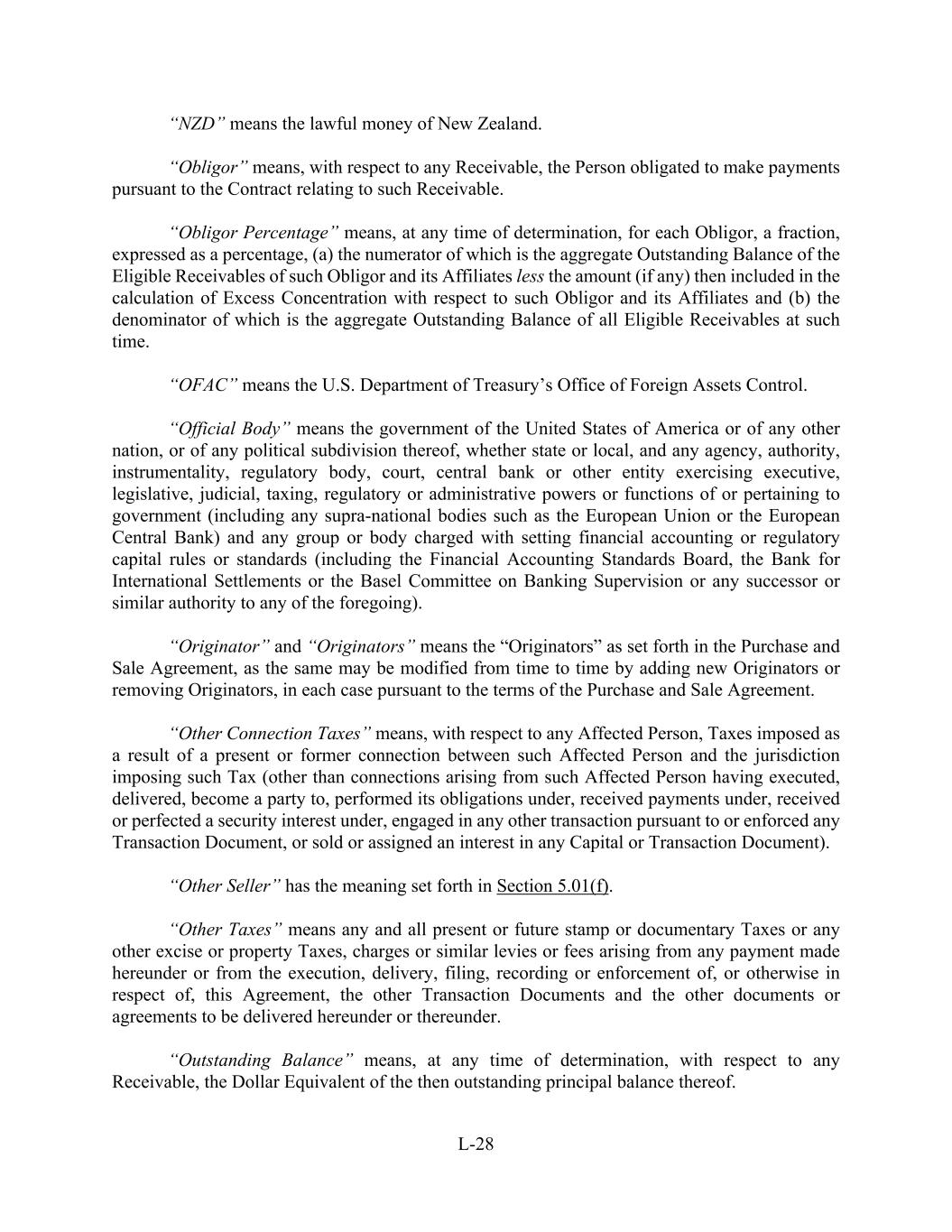 L-28 “NZD” means the lawful money of New Zealand. “Obligor” means, with respect to any Receivable, the Person obligated to make payments pursuant to the Contract relating to such Receivable. “Obligor Percentage” means, at any time of determination, for each Obligor, a fraction, expressed as a percentage, (a) the numerator of which is the aggregate Outstanding Balance of the Eligible Receivables of such Obligor and its Affiliates less the amount (if any) then included in the calculation of Excess Concentration with respect to such Obligor and its Affiliates and (b) the denominator of which is the aggregate Outstanding Balance of all Eligible Receivables at such time. “OFAC” means the U.S. Department of Treasury’s Office of Foreign Assets Control. “Official Body” means the government of the United States of America or of any other nation, or of any political subdivision thereof, whether state or local, and any agency, authority, instrumentality, regulatory body, court, central bank or other entity exercising executive, legislative, judicial, taxing, regulatory or administrative powers or functions of or pertaining to government (including any supra-national bodies such as the European Union or the European Central Bank) and any group or body charged with setting financial accounting or regulatory capital rules or standards (including the Financial Accounting Standards Board, the Bank for International Settlements or the Basel Committee on Banking Supervision or any successor or similar authority to any of the foregoing). “Originator” and “Originators” means the “Originators” as set forth in the Purchase and Sale Agreement, as the same may be modified from time to time by adding new Originators or removing Originators, in each case pursuant to the terms of the Purchase and Sale Agreement. “Other Connection Taxes” means, with respect to any Affected Person, Taxes imposed as a result of a present or former connection between such Affected Person and the jurisdiction imposing such Tax (other than connections arising from such Affected Person having executed, delivered, become a party to, performed its obligations under, received payments under, received or perfected a security interest under, engaged in any other transaction pursuant to or enforced any Transaction Document, or sold or assigned an interest in any Capital or Transaction Document). “Other Seller” has the meaning set forth in Section 5.01(f). “Other Taxes” means any and all present or future stamp or documentary Taxes or any other excise or property Taxes, charges or similar levies or fees arising from any payment made hereunder or from the execution, delivery, filing, recording or enforcement of, or otherwise in respect of, this Agreement, the other Transaction Documents and the other documents or agreements to be delivered hereunder or thereunder. “Outstanding Balance” means, at any time of determination, with respect to any Receivable, the Dollar Equivalent of the then outstanding principal balance thereof.