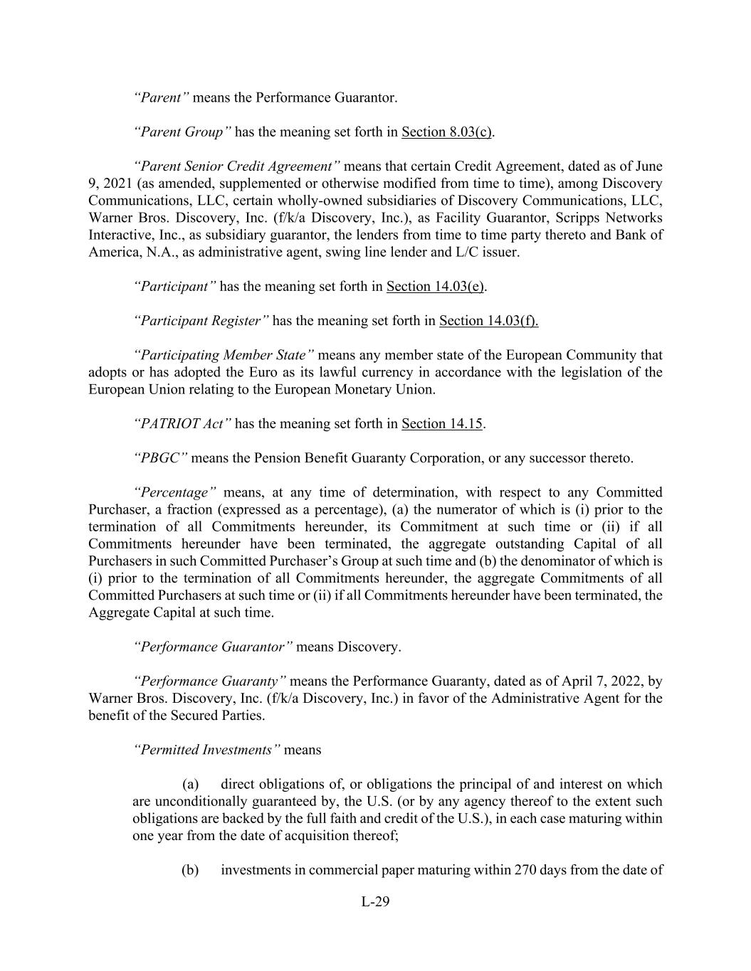 L-29 “Parent” means the Performance Guarantor. “Parent Group” has the meaning set forth in Section 8.03(c). “Parent Senior Credit Agreement” means that certain Credit Agreement, dated as of June 9, 2021 (as amended, supplemented or otherwise modified from time to time), among Discovery Communications, LLC, certain wholly-owned subsidiaries of Discovery Communications, LLC, Warner Bros. Discovery, Inc. (f/k/a Discovery, Inc.), as Facility Guarantor, Scripps Networks Interactive, Inc., as subsidiary guarantor, the lenders from time to time party thereto and Bank of America, N.A., as administrative agent, swing line lender and L/C issuer. “Participant” has the meaning set forth in Section 14.03(e). “Participant Register” has the meaning set forth in Section 14.03(f). “Participating Member State” means any member state of the European Community that adopts or has adopted the Euro as its lawful currency in accordance with the legislation of the European Union relating to the European Monetary Union. “PATRIOT Act” has the meaning set forth in Section 14.15. “PBGC” means the Pension Benefit Guaranty Corporation, or any successor thereto. “Percentage” means, at any time of determination, with respect to any Committed Purchaser, a fraction (expressed as a percentage), (a) the numerator of which is (i) prior to the termination of all Commitments hereunder, its Commitment at such time or (ii) if all Commitments hereunder have been terminated, the aggregate outstanding Capital of all Purchasers in such Committed Purchaser’s Group at such time and (b) the denominator of which is (i) prior to the termination of all Commitments hereunder, the aggregate Commitments of all Committed Purchasers at such time or (ii) if all Commitments hereunder have been terminated, the Aggregate Capital at such time. “Performance Guarantor” means Discovery. “Performance Guaranty” means the Performance Guaranty, dated as of April 7, 2022, by Warner Bros. Discovery, Inc. (f/k/a Discovery, Inc.) in favor of the Administrative Agent for the benefit of the Secured Parties. “Permitted Investments” means (a) direct obligations of, or obligations the principal of and interest on which are unconditionally guaranteed by, the U.S. (or by any agency thereof to the extent such obligations are backed by the full faith and credit of the U.S.), in each case maturing within one year from the date of acquisition thereof; (b) investments in commercial paper maturing within 270 days from the date of