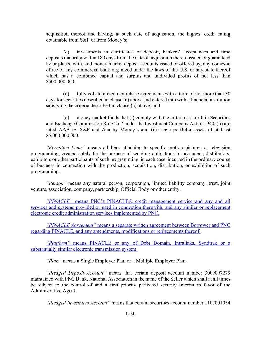 L-30 acquisition thereof and having, at such date of acquisition, the highest credit rating obtainable from S&P or from Moody’s; (c) investments in certificates of deposit, bankers’ acceptances and time deposits maturing within 180 days from the date of acquisition thereof issued or guaranteed by or placed with, and money market deposit accounts issued or offered by, any domestic office of any commercial bank organized under the laws of the U.S. or any state thereof which has a combined capital and surplus and undivided profits of not less than $500,000,000; (d) fully collateralized repurchase agreements with a term of not more than 30 days for securities described in clause (a) above and entered into with a financial institution satisfying the criteria described in clause (c) above; and (e) money market funds that (i) comply with the criteria set forth in Securities and Exchange Commission Rule 2a-7 under the Investment Company Act of 1940, (ii) are rated AAA by S&P and Aaa by Moody’s and (iii) have portfolio assets of at least $5,000,000,000. “Permitted Liens” means all liens attaching to specific motion pictures or television programming, created solely for the purpose of securing obligations to producers, distributors, exhibitors or other participants of such programming, in each case, incurred in the ordinary course of business in connection with the production, acquisition, distribution, or exhibition of such programming. “Person” means any natural person, corporation, limited liability company, trust, joint venture, association, company, partnership, Official Body or other entity. “PINACLE” means PNC’s PINACLE® credit management service and any and all services and systems provided or used in connection therewith, and any similar or replacement electronic credit administration services implemented by PNC. “PINACLE Agreement” means a separate written agreement between Borrower and PNC regarding PINACLE, and any amendments, modifications or replacements thereof. “Platform” means PINACLE or any of Debt Domain, Intralinks, Syndtrak or a substantially similar electronic transmission system. “Plan” means a Single Employer Plan or a Multiple Employer Plan. “Pledged Deposit Account” means that certain deposit account number 3009097279 maintained with PNC Bank, National Association in the name of the Seller which shall at all times be subject to the control of and a first priority perfected security interest in favor of the Administrative Agent. “Pledged Investment Account” means that certain securities account number 1107001054