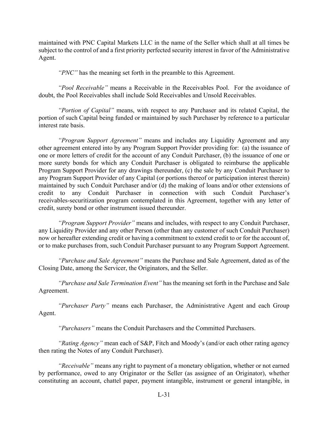 L-31 maintained with PNC Capital Markets LLC in the name of the Seller which shall at all times be subject to the control of and a first priority perfected security interest in favor of the Administrative Agent. “PNC” has the meaning set forth in the preamble to this Agreement. “Pool Receivable” means a Receivable in the Receivables Pool. For the avoidance of doubt, the Pool Receivables shall include Sold Receivables and Unsold Receivables. “Portion of Capital” means, with respect to any Purchaser and its related Capital, the portion of such Capital being funded or maintained by such Purchaser by reference to a particular interest rate basis. “Program Support Agreement” means and includes any Liquidity Agreement and any other agreement entered into by any Program Support Provider providing for: (a) the issuance of one or more letters of credit for the account of any Conduit Purchaser, (b) the issuance of one or more surety bonds for which any Conduit Purchaser is obligated to reimburse the applicable Program Support Provider for any drawings thereunder, (c) the sale by any Conduit Purchaser to any Program Support Provider of any Capital (or portions thereof or participation interest therein) maintained by such Conduit Purchaser and/or (d) the making of loans and/or other extensions of credit to any Conduit Purchaser in connection with such Conduit Purchaser’s receivables-securitization program contemplated in this Agreement, together with any letter of credit, surety bond or other instrument issued thereunder. “Program Support Provider” means and includes, with respect to any Conduit Purchaser, any Liquidity Provider and any other Person (other than any customer of such Conduit Purchaser) now or hereafter extending credit or having a commitment to extend credit to or for the account of, or to make purchases from, such Conduit Purchaser pursuant to any Program Support Agreement. “Purchase and Sale Agreement” means the Purchase and Sale Agreement, dated as of the Closing Date, among the Servicer, the Originators, and the Seller. “Purchase and Sale Termination Event” has the meaning set forth in the Purchase and Sale Agreement. “Purchaser Party” means each Purchaser, the Administrative Agent and each Group Agent. “Purchasers” means the Conduit Purchasers and the Committed Purchasers. “Rating Agency” mean each of S&P, Fitch and Moody’s (and/or each other rating agency then rating the Notes of any Conduit Purchaser). “Receivable” means any right to payment of a monetary obligation, whether or not earned by performance, owed to any Originator or the Seller (as assignee of an Originator), whether constituting an account, chattel paper, payment intangible, instrument or general intangible, in