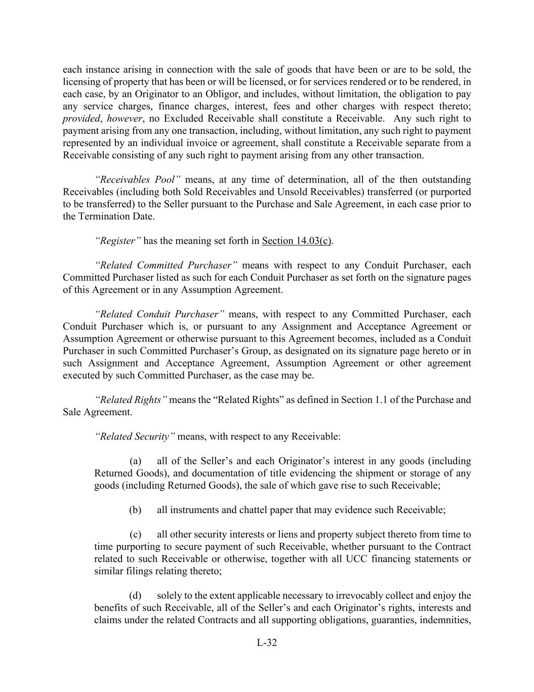 L-32 each instance arising in connection with the sale of goods that have been or are to be sold, the licensing of property that has been or will be licensed, or for services rendered or to be rendered, in each case, by an Originator to an Obligor, and includes, without limitation, the obligation to pay any service charges, finance charges, interest, fees and other charges with respect thereto; provided, however, no Excluded Receivable shall constitute a Receivable. Any such right to payment arising from any one transaction, including, without limitation, any such right to payment represented by an individual invoice or agreement, shall constitute a Receivable separate from a Receivable consisting of any such right to payment arising from any other transaction. “Receivables Pool” means, at any time of determination, all of the then outstanding Receivables (including both Sold Receivables and Unsold Receivables) transferred (or purported to be transferred) to the Seller pursuant to the Purchase and Sale Agreement, in each case prior to the Termination Date. “Register” has the meaning set forth in Section 14.03(c). “Related Committed Purchaser” means with respect to any Conduit Purchaser, each Committed Purchaser listed as such for each Conduit Purchaser as set forth on the signature pages of this Agreement or in any Assumption Agreement. “Related Conduit Purchaser” means, with respect to any Committed Purchaser, each Conduit Purchaser which is, or pursuant to any Assignment and Acceptance Agreement or Assumption Agreement or otherwise pursuant to this Agreement becomes, included as a Conduit Purchaser in such Committed Purchaser’s Group, as designated on its signature page hereto or in such Assignment and Acceptance Agreement, Assumption Agreement or other agreement executed by such Committed Purchaser, as the case may be. “Related Rights” means the “Related Rights” as defined in Section 1.1 of the Purchase and Sale Agreement. “Related Security” means, with respect to any Receivable: (a) all of the Seller’s and each Originator’s interest in any goods (including Returned Goods), and documentation of title evidencing the shipment or storage of any goods (including Returned Goods), the sale of which gave rise to such Receivable; (b) all instruments and chattel paper that may evidence such Receivable; (c) all other security interests or liens and property subject thereto from time to time purporting to secure payment of such Receivable, whether pursuant to the Contract related to such Receivable or otherwise, together with all UCC financing statements or similar filings relating thereto; (d) solely to the extent applicable necessary to irrevocably collect and enjoy the benefits of such Receivable, all of the Seller’s and each Originator’s rights, interests and claims under the related Contracts and all supporting obligations, guaranties, indemnities,