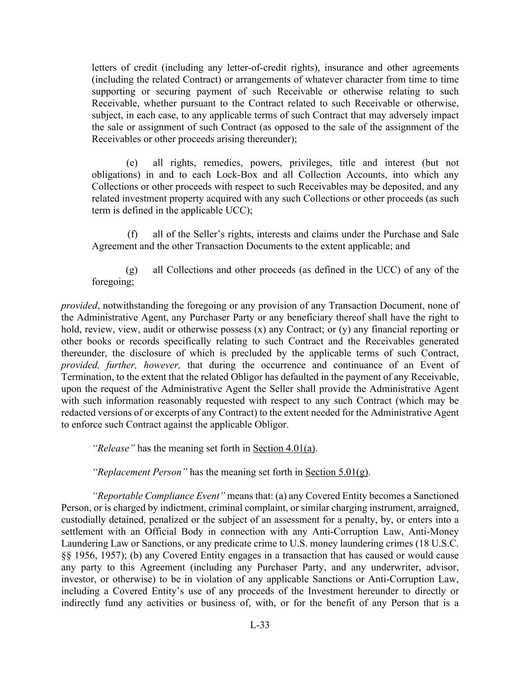 L-33 letters of credit (including any letter-of-credit rights), insurance and other agreements (including the related Contract) or arrangements of whatever character from time to time supporting or securing payment of such Receivable or otherwise relating to such Receivable, whether pursuant to the Contract related to such Receivable or otherwise, subject, in each case, to any applicable terms of such Contract that may adversely impact the sale or assignment of such Contract (as opposed to the sale of the assignment of the Receivables or other proceeds arising thereunder); (e) all rights, remedies, powers, privileges, title and interest (but not obligations) in and to each Lock-Box and all Collection Accounts, into which any Collections or other proceeds with respect to such Receivables may be deposited, and any related investment property acquired with any such Collections or other proceeds (as such term is defined in the applicable UCC); (f) all of the Seller’s rights, interests and claims under the Purchase and Sale Agreement and the other Transaction Documents to the extent applicable; and (g) all Collections and other proceeds (as defined in the UCC) of any of the foregoing; provided, notwithstanding the foregoing or any provision of any Transaction Document, none of the Administrative Agent, any Purchaser Party or any beneficiary thereof shall have the right to hold, review, view, audit or otherwise possess (x) any Contract; or (y) any financial reporting or other books or records specifically relating to such Contract and the Receivables generated thereunder, the disclosure of which is precluded by the applicable terms of such Contract, provided, further, however, that during the occurrence and continuance of an Event of Termination, to the extent that the related Obligor has defaulted in the payment of any Receivable, upon the request of the Administrative Agent the Seller shall provide the Administrative Agent with such information reasonably requested with respect to any such Contract (which may be redacted versions of or excerpts of any Contract) to the extent needed for the Administrative Agent to enforce such Contract against the applicable Obligor. “Release” has the meaning set forth in Section 4.01(a). “Replacement Person” has the meaning set forth in Section 5.01(g). “Reportable Compliance Event” means that: (a) any Covered Entity becomes a Sanctioned Person, or is charged by indictment, criminal complaint, or similar charging instrument, arraigned, custodially detained, penalized or the subject of an assessment for a penalty, by, or enters into a settlement with an Official Body in connection with any Anti-Corruption Law, Anti-Money Laundering Law or Sanctions, or any predicate crime to U.S. money laundering crimes (18 U.S.C. §§ 1956, 1957); (b) any Covered Entity engages in a transaction that has caused or would cause any party to this Agreement (including any Purchaser Party, and any underwriter, advisor, investor, or otherwise) to be in violation of any applicable Sanctions or Anti-Corruption Law, including a Covered Entity’s use of any proceeds of the Investment hereunder to directly or indirectly fund any activities or business of, with, or for the benefit of any Person that is a