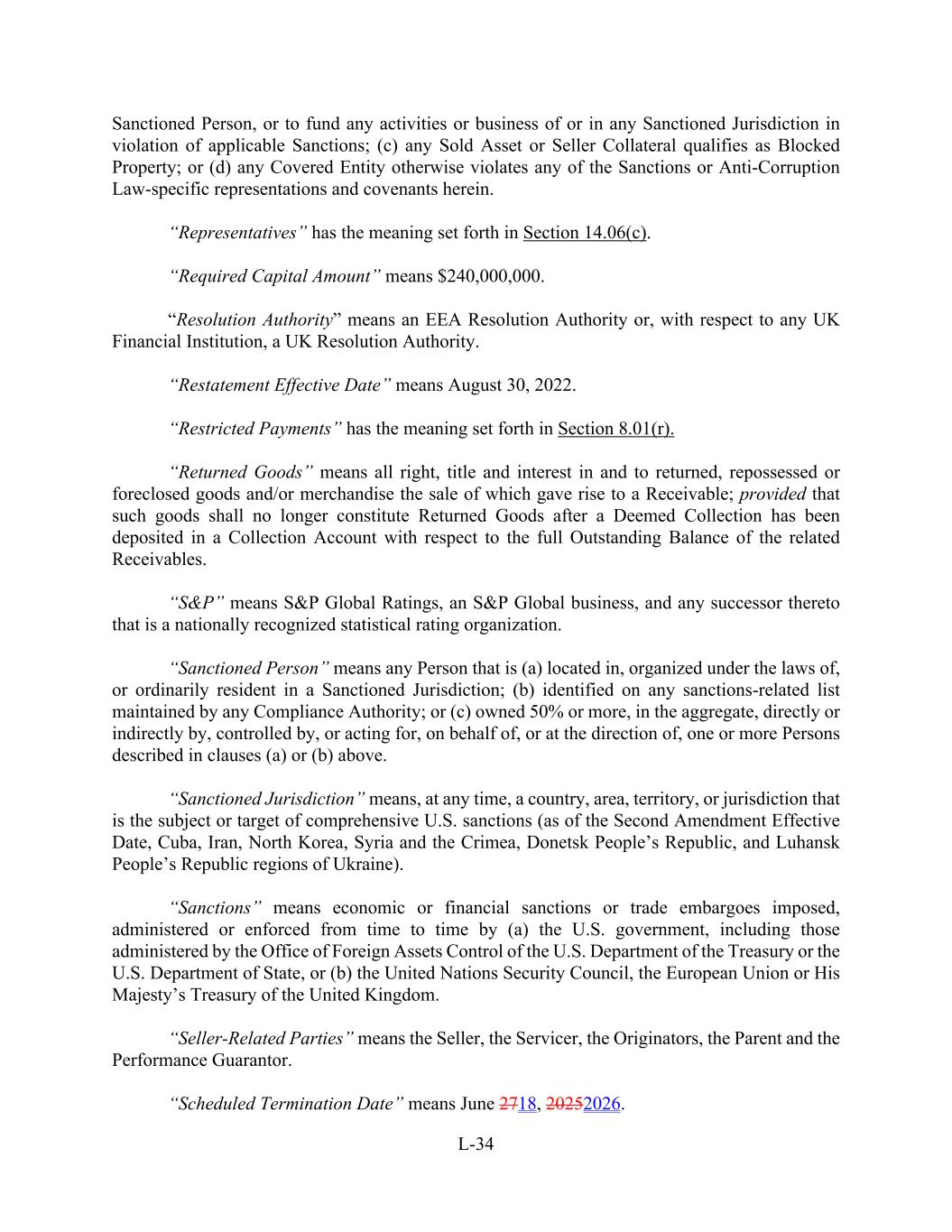 L-34 Sanctioned Person, or to fund any activities or business of or in any Sanctioned Jurisdiction in violation of applicable Sanctions; (c) any Sold Asset or Seller Collateral qualifies as Blocked Property; or (d) any Covered Entity otherwise violates any of the Sanctions or Anti-Corruption Law-specific representations and covenants herein. “Representatives” has the meaning set forth in Section 14.06(c). “Required Capital Amount” means $240,000,000. “Resolution Authority” means an EEA Resolution Authority or, with respect to any UK Financial Institution, a UK Resolution Authority. “Restatement Effective Date” means August 30, 2022. “Restricted Payments” has the meaning set forth in Section 8.01(r). “Returned Goods” means all right, title and interest in and to returned, repossessed or foreclosed goods and/or merchandise the sale of which gave rise to a Receivable; provided that such goods shall no longer constitute Returned Goods after a Deemed Collection has been deposited in a Collection Account with respect to the full Outstanding Balance of the related Receivables. “S&P” means S&P Global Ratings, an S&P Global business, and any successor thereto that is a nationally recognized statistical rating organization. “Sanctioned Person” means any Person that is (a) located in, organized under the laws of, or ordinarily resident in a Sanctioned Jurisdiction; (b) identified on any sanctions-related list maintained by any Compliance Authority; or (c) owned 50% or more, in the aggregate, directly or indirectly by, controlled by, or acting for, on behalf of, or at the direction of, one or more Persons described in clauses (a) or (b) above. “Sanctioned Jurisdiction” means, at any time, a country, area, territory, or jurisdiction that is the subject or target of comprehensive U.S. sanctions (as of the Second Amendment Effective Date, Cuba, Iran, North Korea, Syria and the Crimea, Donetsk People’s Republic, and Luhansk People’s Republic regions of Ukraine). “Sanctions” means economic or financial sanctions or trade embargoes imposed, administered or enforced from time to time by (a) the U.S. government, including those administered by the Office of Foreign Assets Control of the U.S. Department of the Treasury or the U.S. Department of State, or (b) the United Nations Security Council, the European Union or His Majesty’s Treasury of the United Kingdom. “Seller-Related Parties” means the Seller, the Servicer, the Originators, the Parent and the Performance Guarantor. “Scheduled Termination Date” means June 2718, 20252026.