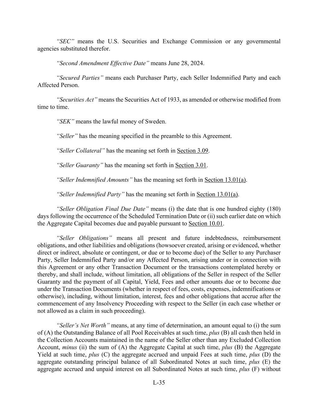 L-35 “SEC” means the U.S. Securities and Exchange Commission or any governmental agencies substituted therefor. “Second Amendment Effective Date” means June 28, 2024. “Secured Parties” means each Purchaser Party, each Seller Indemnified Party and each Affected Person. “Securities Act” means the Securities Act of 1933, as amended or otherwise modified from time to time. “SEK” means the lawful money of Sweden. “Seller” has the meaning specified in the preamble to this Agreement. “Seller Collateral” has the meaning set forth in Section 3.09. “Seller Guaranty” has the meaning set forth in Section 3.01. “Seller Indemnified Amounts” has the meaning set forth in Section 13.01(a). “Seller Indemnified Party” has the meaning set forth in Section 13.01(a). “Seller Obligation Final Due Date” means (i) the date that is one hundred eighty (180) days following the occurrence of the Scheduled Termination Date or (ii) such earlier date on which the Aggregate Capital becomes due and payable pursuant to Section 10.01. “Seller Obligations” means all present and future indebtedness, reimbursement obligations, and other liabilities and obligations (howsoever created, arising or evidenced, whether direct or indirect, absolute or contingent, or due or to become due) of the Seller to any Purchaser Party, Seller Indemnified Party and/or any Affected Person, arising under or in connection with this Agreement or any other Transaction Document or the transactions contemplated hereby or thereby, and shall include, without limitation, all obligations of the Seller in respect of the Seller Guaranty and the payment of all Capital, Yield, Fees and other amounts due or to become due under the Transaction Documents (whether in respect of fees, costs, expenses, indemnifications or otherwise), including, without limitation, interest, fees and other obligations that accrue after the commencement of any Insolvency Proceeding with respect to the Seller (in each case whether or not allowed as a claim in such proceeding). “Seller’s Net Worth” means, at any time of determination, an amount equal to (i) the sum of (A) the Outstanding Balance of all Pool Receivables at such time, plus (B) all cash then held in the Collection Accounts maintained in the name of the Seller other than any Excluded Collection Account, minus (ii) the sum of (A) the Aggregate Capital at such time, plus (B) the Aggregate Yield at such time, plus (C) the aggregate accrued and unpaid Fees at such time, plus (D) the aggregate outstanding principal balance of all Subordinated Notes at such time, plus (E) the aggregate accrued and unpaid interest on all Subordinated Notes at such time, plus (F) without
