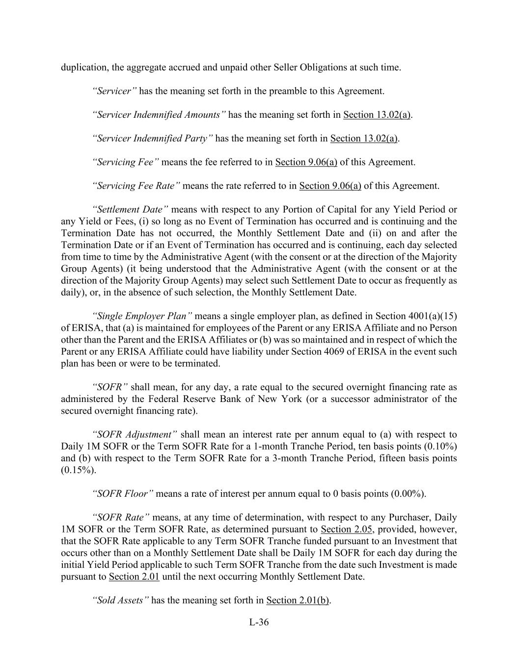 L-36 duplication, the aggregate accrued and unpaid other Seller Obligations at such time. “Servicer” has the meaning set forth in the preamble to this Agreement. “Servicer Indemnified Amounts” has the meaning set forth in Section 13.02(a). “Servicer Indemnified Party” has the meaning set forth in Section 13.02(a). “Servicing Fee” means the fee referred to in Section 9.06(a) of this Agreement. “Servicing Fee Rate” means the rate referred to in Section 9.06(a) of this Agreement. “Settlement Date” means with respect to any Portion of Capital for any Yield Period or any Yield or Fees, (i) so long as no Event of Termination has occurred and is continuing and the Termination Date has not occurred, the Monthly Settlement Date and (ii) on and after the Termination Date or if an Event of Termination has occurred and is continuing, each day selected from time to time by the Administrative Agent (with the consent or at the direction of the Majority Group Agents) (it being understood that the Administrative Agent (with the consent or at the direction of the Majority Group Agents) may select such Settlement Date to occur as frequently as daily), or, in the absence of such selection, the Monthly Settlement Date. “Single Employer Plan” means a single employer plan, as defined in Section 4001(a)(15) of ERISA, that (a) is maintained for employees of the Parent or any ERISA Affiliate and no Person other than the Parent and the ERISA Affiliates or (b) was so maintained and in respect of which the Parent or any ERISA Affiliate could have liability under Section 4069 of ERISA in the event such plan has been or were to be terminated. “SOFR” shall mean, for any day, a rate equal to the secured overnight financing rate as administered by the Federal Reserve Bank of New York (or a successor administrator of the secured overnight financing rate). “SOFR Adjustment” shall mean an interest rate per annum equal to (a) with respect to Daily 1M SOFR or the Term SOFR Rate for a 1-month Tranche Period, ten basis points (0.10%) and (b) with respect to the Term SOFR Rate for a 3-month Tranche Period, fifteen basis points (0.15%). “SOFR Floor” means a rate of interest per annum equal to 0 basis points (0.00%). “SOFR Rate” means, at any time of determination, with respect to any Purchaser, Daily 1M SOFR or the Term SOFR Rate, as determined pursuant to Section 2.05, provided, however, that the SOFR Rate applicable to any Term SOFR Tranche funded pursuant to an Investment that occurs other than on a Monthly Settlement Date shall be Daily 1M SOFR for each day during the initial Yield Period applicable to such Term SOFR Tranche from the date such Investment is made pursuant to Section 2.01 until the next occurring Monthly Settlement Date. “Sold Assets” has the meaning set forth in Section 2.01(b).