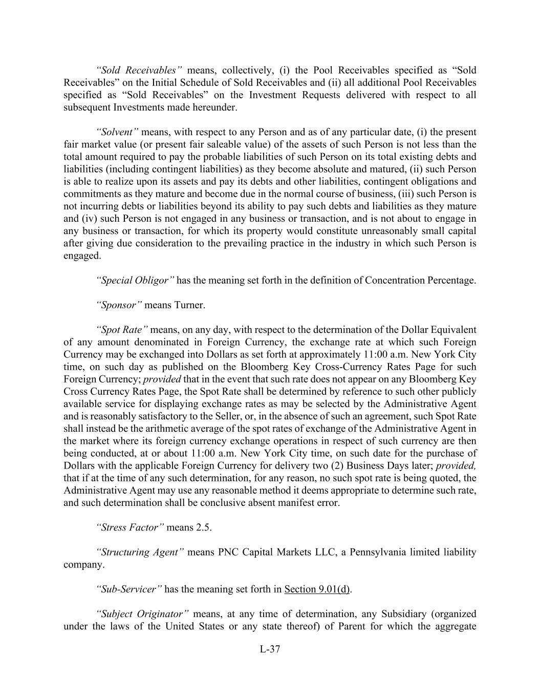 L-37 “Sold Receivables” means, collectively, (i) the Pool Receivables specified as “Sold Receivables” on the Initial Schedule of Sold Receivables and (ii) all additional Pool Receivables specified as “Sold Receivables” on the Investment Requests delivered with respect to all subsequent Investments made hereunder. “Solvent” means, with respect to any Person and as of any particular date, (i) the present fair market value (or present fair saleable value) of the assets of such Person is not less than the total amount required to pay the probable liabilities of such Person on its total existing debts and liabilities (including contingent liabilities) as they become absolute and matured, (ii) such Person is able to realize upon its assets and pay its debts and other liabilities, contingent obligations and commitments as they mature and become due in the normal course of business, (iii) such Person is not incurring debts or liabilities beyond its ability to pay such debts and liabilities as they mature and (iv) such Person is not engaged in any business or transaction, and is not about to engage in any business or transaction, for which its property would constitute unreasonably small capital after giving due consideration to the prevailing practice in the industry in which such Person is engaged. “Special Obligor” has the meaning set forth in the definition of Concentration Percentage. “Sponsor” means Turner. “Spot Rate” means, on any day, with respect to the determination of the Dollar Equivalent of any amount denominated in Foreign Currency, the exchange rate at which such Foreign Currency may be exchanged into Dollars as set forth at approximately 11:00 a.m. New York City time, on such day as published on the Bloomberg Key Cross-Currency Rates Page for such Foreign Currency; provided that in the event that such rate does not appear on any Bloomberg Key Cross Currency Rates Page, the Spot Rate shall be determined by reference to such other publicly available service for displaying exchange rates as may be selected by the Administrative Agent and is reasonably satisfactory to the Seller, or, in the absence of such an agreement, such Spot Rate shall instead be the arithmetic average of the spot rates of exchange of the Administrative Agent in the market where its foreign currency exchange operations in respect of such currency are then being conducted, at or about 11:00 a.m. New York City time, on such date for the purchase of Dollars with the applicable Foreign Currency for delivery two (2) Business Days later; provided, that if at the time of any such determination, for any reason, no such spot rate is being quoted, the Administrative Agent may use any reasonable method it deems appropriate to determine such rate, and such determination shall be conclusive absent manifest error. “Stress Factor” means 2.5. “Structuring Agent” means PNC Capital Markets LLC, a Pennsylvania limited liability company. “Sub-Servicer” has the meaning set forth in Section 9.01(d). “Subject Originator” means, at any time of determination, any Subsidiary (organized under the laws of the United States or any state thereof) of Parent for which the aggregate