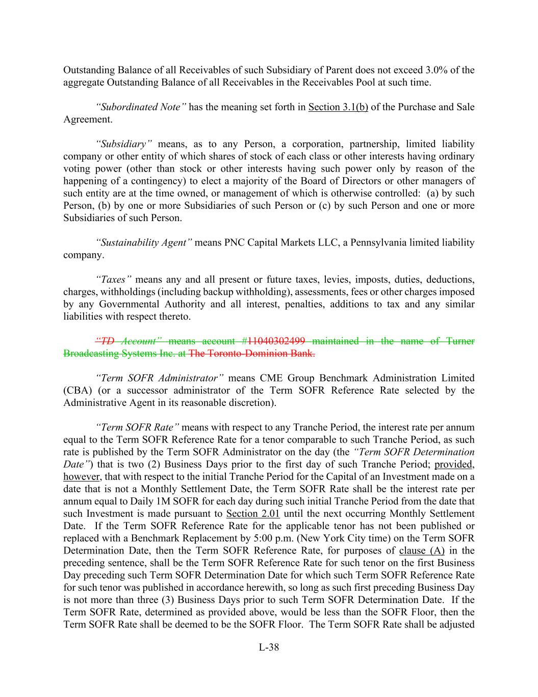 L-38 Outstanding Balance of all Receivables of such Subsidiary of Parent does not exceed 3.0% of the aggregate Outstanding Balance of all Receivables in the Receivables Pool at such time. “Subordinated Note” has the meaning set forth in Section 3.1(b) of the Purchase and Sale Agreement. “Subsidiary” means, as to any Person, a corporation, partnership, limited liability company or other entity of which shares of stock of each class or other interests having ordinary voting power (other than stock or other interests having such power only by reason of the happening of a contingency) to elect a majority of the Board of Directors or other managers of such entity are at the time owned, or management of which is otherwise controlled: (a) by such Person, (b) by one or more Subsidiaries of such Person or (c) by such Person and one or more Subsidiaries of such Person. “Sustainability Agent” means PNC Capital Markets LLC, a Pennsylvania limited liability company. “Taxes” means any and all present or future taxes, levies, imposts, duties, deductions, charges, withholdings (including backup withholding), assessments, fees or other charges imposed by any Governmental Authority and all interest, penalties, additions to tax and any similar liabilities with respect thereto. “TD Account” means account #11040302499 maintained in the name of Turner Broadcasting Systems Inc. at The Toronto-Dominion Bank. “Term SOFR Administrator” means CME Group Benchmark Administration Limited (CBA) (or a successor administrator of the Term SOFR Reference Rate selected by the Administrative Agent in its reasonable discretion). “Term SOFR Rate” means with respect to any Tranche Period, the interest rate per annum equal to the Term SOFR Reference Rate for a tenor comparable to such Tranche Period, as such rate is published by the Term SOFR Administrator on the day (the “Term SOFR Determination Date”) that is two (2) Business Days prior to the first day of such Tranche Period; provided, however, that with respect to the initial Tranche Period for the Capital of an Investment made on a date that is not a Monthly Settlement Date, the Term SOFR Rate shall be the interest rate per annum equal to Daily 1M SOFR for each day during such initial Tranche Period from the date that such Investment is made pursuant to Section 2.01 until the next occurring Monthly Settlement Date. If the Term SOFR Reference Rate for the applicable tenor has not been published or replaced with a Benchmark Replacement by 5:00 p.m. (New York City time) on the Term SOFR Determination Date, then the Term SOFR Reference Rate, for purposes of clause (A) in the preceding sentence, shall be the Term SOFR Reference Rate for such tenor on the first Business Day preceding such Term SOFR Determination Date for which such Term SOFR Reference Rate for such tenor was published in accordance herewith, so long as such first preceding Business Day is not more than three (3) Business Days prior to such Term SOFR Determination Date. If the Term SOFR Rate, determined as provided above, would be less than the SOFR Floor, then the Term SOFR Rate shall be deemed to be the SOFR Floor. The Term SOFR Rate shall be adjusted