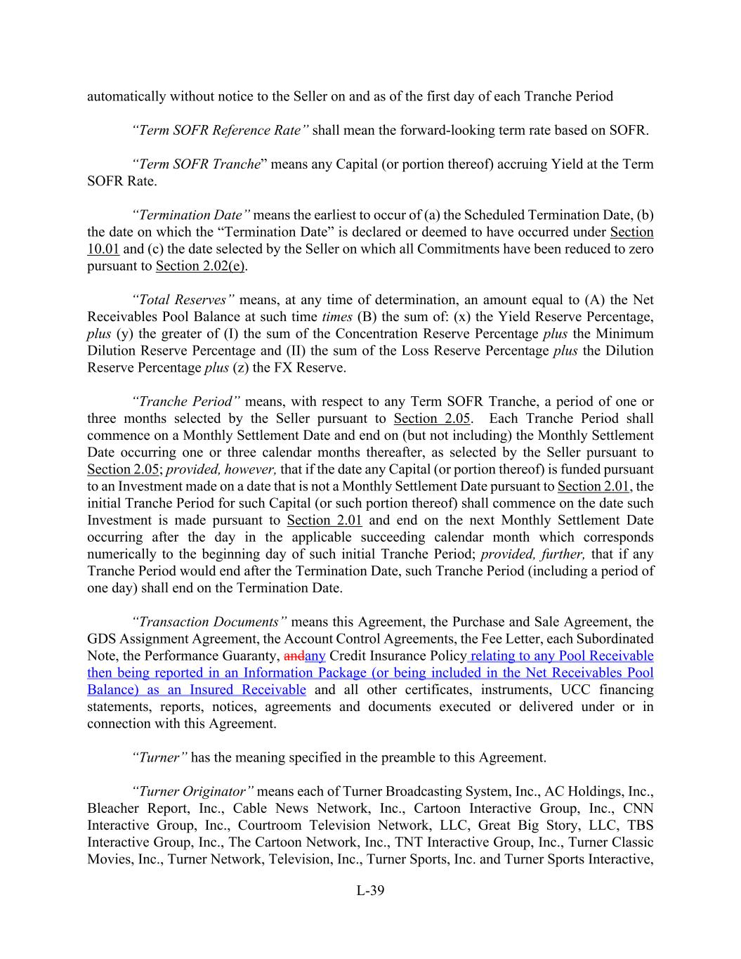L-39 automatically without notice to the Seller on and as of the first day of each Tranche Period “Term SOFR Reference Rate” shall mean the forward-looking term rate based on SOFR. “Term SOFR Tranche” means any Capital (or portion thereof) accruing Yield at the Term SOFR Rate. “Termination Date” means the earliest to occur of (a) the Scheduled Termination Date, (b) the date on which the “Termination Date” is declared or deemed to have occurred under Section 10.01 and (c) the date selected by the Seller on which all Commitments have been reduced to zero pursuant to Section 2.02(e). “Total Reserves” means, at any time of determination, an amount equal to (A) the Net Receivables Pool Balance at such time times (B) the sum of: (x) the Yield Reserve Percentage, plus (y) the greater of (I) the sum of the Concentration Reserve Percentage plus the Minimum Dilution Reserve Percentage and (II) the sum of the Loss Reserve Percentage plus the Dilution Reserve Percentage plus (z) the FX Reserve. “Tranche Period” means, with respect to any Term SOFR Tranche, a period of one or three months selected by the Seller pursuant to Section 2.05. Each Tranche Period shall commence on a Monthly Settlement Date and end on (but not including) the Monthly Settlement Date occurring one or three calendar months thereafter, as selected by the Seller pursuant to Section 2.05; provided, however, that if the date any Capital (or portion thereof) is funded pursuant to an Investment made on a date that is not a Monthly Settlement Date pursuant to Section 2.01, the initial Tranche Period for such Capital (or such portion thereof) shall commence on the date such Investment is made pursuant to Section 2.01 and end on the next Monthly Settlement Date occurring after the day in the applicable succeeding calendar month which corresponds numerically to the beginning day of such initial Tranche Period; provided, further, that if any Tranche Period would end after the Termination Date, such Tranche Period (including a period of one day) shall end on the Termination Date. “Transaction Documents” means this Agreement, the Purchase and Sale Agreement, the GDS Assignment Agreement, the Account Control Agreements, the Fee Letter, each Subordinated Note, the Performance Guaranty, andany Credit Insurance Policy relating to any Pool Receivable then being reported in an Information Package (or being included in the Net Receivables Pool Balance) as an Insured Receivable and all other certificates, instruments, UCC financing statements, reports, notices, agreements and documents executed or delivered under or in connection with this Agreement. “Turner” has the meaning specified in the preamble to this Agreement. “Turner Originator” means each of Turner Broadcasting System, Inc., AC Holdings, Inc., Bleacher Report, Inc., Cable News Network, Inc., Cartoon Interactive Group, Inc., CNN Interactive Group, Inc., Courtroom Television Network, LLC, Great Big Story, LLC, TBS Interactive Group, Inc., The Cartoon Network, Inc., TNT Interactive Group, Inc., Turner Classic Movies, Inc., Turner Network, Television, Inc., Turner Sports, Inc. and Turner Sports Interactive,
