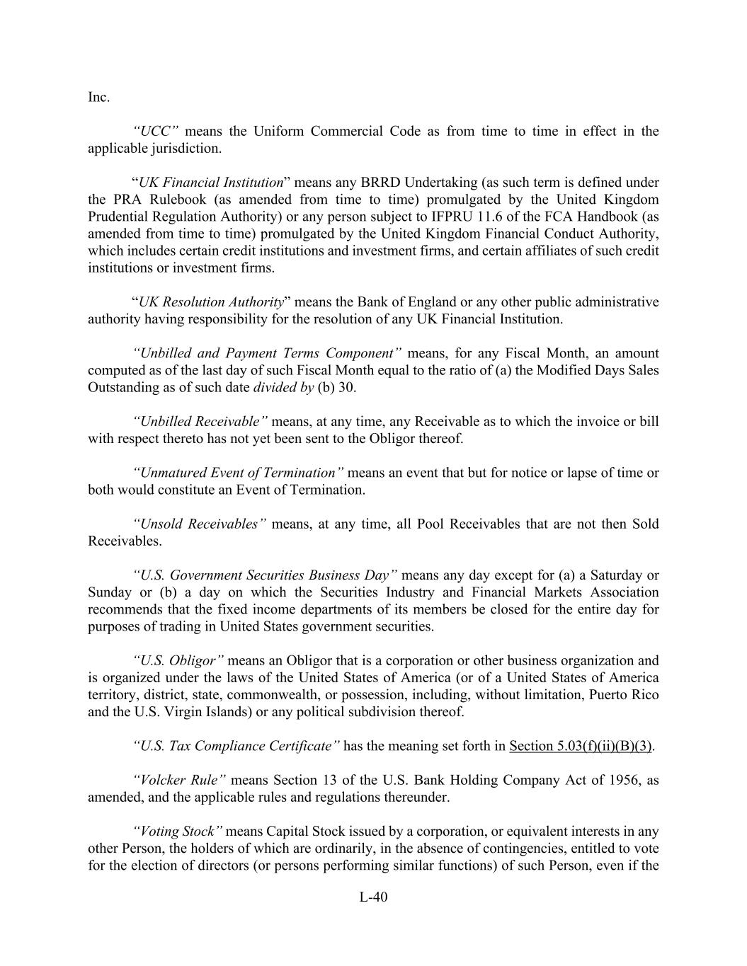 L-40 Inc. “UCC” means the Uniform Commercial Code as from time to time in effect in the applicable jurisdiction. “UK Financial Institution” means any BRRD Undertaking (as such term is defined under the PRA Rulebook (as amended from time to time) promulgated by the United Kingdom Prudential Regulation Authority) or any person subject to IFPRU 11.6 of the FCA Handbook (as amended from time to time) promulgated by the United Kingdom Financial Conduct Authority, which includes certain credit institutions and investment firms, and certain affiliates of such credit institutions or investment firms. “UK Resolution Authority” means the Bank of England or any other public administrative authority having responsibility for the resolution of any UK Financial Institution. “Unbilled and Payment Terms Component” means, for any Fiscal Month, an amount computed as of the last day of such Fiscal Month equal to the ratio of (a) the Modified Days Sales Outstanding as of such date divided by (b) 30. “Unbilled Receivable” means, at any time, any Receivable as to which the invoice or bill with respect thereto has not yet been sent to the Obligor thereof. “Unmatured Event of Termination” means an event that but for notice or lapse of time or both would constitute an Event of Termination. “Unsold Receivables” means, at any time, all Pool Receivables that are not then Sold Receivables. “U.S. Government Securities Business Day” means any day except for (a) a Saturday or Sunday or (b) a day on which the Securities Industry and Financial Markets Association recommends that the fixed income departments of its members be closed for the entire day for purposes of trading in United States government securities. “U.S. Obligor” means an Obligor that is a corporation or other business organization and is organized under the laws of the United States of America (or of a United States of America territory, district, state, commonwealth, or possession, including, without limitation, Puerto Rico and the U.S. Virgin Islands) or any political subdivision thereof. “U.S. Tax Compliance Certificate” has the meaning set forth in Section 5.03(f)(ii)(B)(3). “Volcker Rule” means Section 13 of the U.S. Bank Holding Company Act of 1956, as amended, and the applicable rules and regulations thereunder. “Voting Stock” means Capital Stock issued by a corporation, or equivalent interests in any other Person, the holders of which are ordinarily, in the absence of contingencies, entitled to vote for the election of directors (or persons performing similar functions) of such Person, even if the
