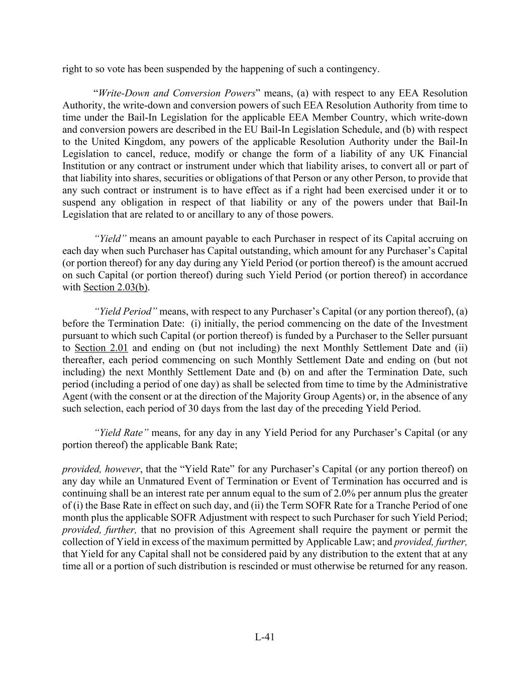 L-41 right to so vote has been suspended by the happening of such a contingency. “Write-Down and Conversion Powers” means, (a) with respect to any EEA Resolution Authority, the write-down and conversion powers of such EEA Resolution Authority from time to time under the Bail-In Legislation for the applicable EEA Member Country, which write-down and conversion powers are described in the EU Bail-In Legislation Schedule, and (b) with respect to the United Kingdom, any powers of the applicable Resolution Authority under the Bail-In Legislation to cancel, reduce, modify or change the form of a liability of any UK Financial Institution or any contract or instrument under which that liability arises, to convert all or part of that liability into shares, securities or obligations of that Person or any other Person, to provide that any such contract or instrument is to have effect as if a right had been exercised under it or to suspend any obligation in respect of that liability or any of the powers under that Bail-In Legislation that are related to or ancillary to any of those powers. “Yield” means an amount payable to each Purchaser in respect of its Capital accruing on each day when such Purchaser has Capital outstanding, which amount for any Purchaser’s Capital (or portion thereof) for any day during any Yield Period (or portion thereof) is the amount accrued on such Capital (or portion thereof) during such Yield Period (or portion thereof) in accordance with Section 2.03(b). “Yield Period” means, with respect to any Purchaser’s Capital (or any portion thereof), (a) before the Termination Date: (i) initially, the period commencing on the date of the Investment pursuant to which such Capital (or portion thereof) is funded by a Purchaser to the Seller pursuant to Section 2.01 and ending on (but not including) the next Monthly Settlement Date and (ii) thereafter, each period commencing on such Monthly Settlement Date and ending on (but not including) the next Monthly Settlement Date and (b) on and after the Termination Date, such period (including a period of one day) as shall be selected from time to time by the Administrative Agent (with the consent or at the direction of the Majority Group Agents) or, in the absence of any such selection, each period of 30 days from the last day of the preceding Yield Period. “Yield Rate” means, for any day in any Yield Period for any Purchaser’s Capital (or any portion thereof) the applicable Bank Rate; provided, however, that the “Yield Rate” for any Purchaser’s Capital (or any portion thereof) on any day while an Unmatured Event of Termination or Event of Termination has occurred and is continuing shall be an interest rate per annum equal to the sum of 2.0% per annum plus the greater of (i) the Base Rate in effect on such day, and (ii) the Term SOFR Rate for a Tranche Period of one month plus the applicable SOFR Adjustment with respect to such Purchaser for such Yield Period; provided, further, that no provision of this Agreement shall require the payment or permit the collection of Yield in excess of the maximum permitted by Applicable Law; and provided, further, that Yield for any Capital shall not be considered paid by any distribution to the extent that at any time all or a portion of such distribution is rescinded or must otherwise be returned for any reason.